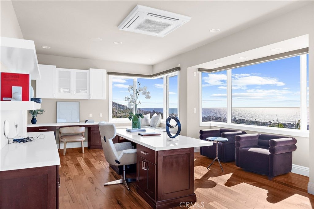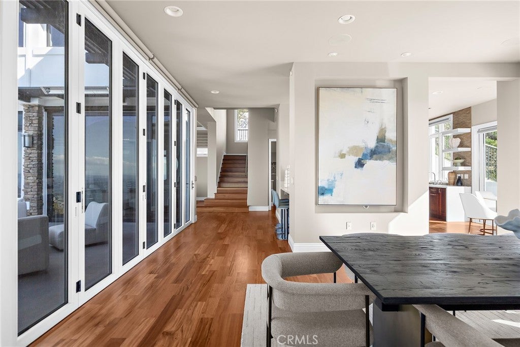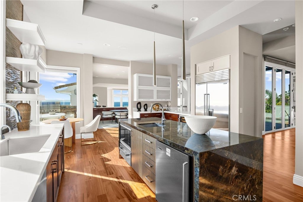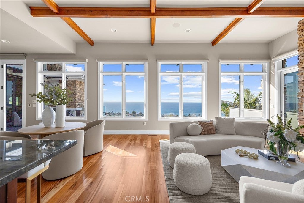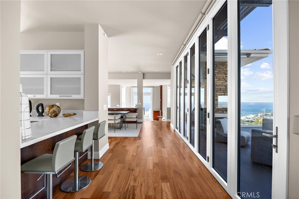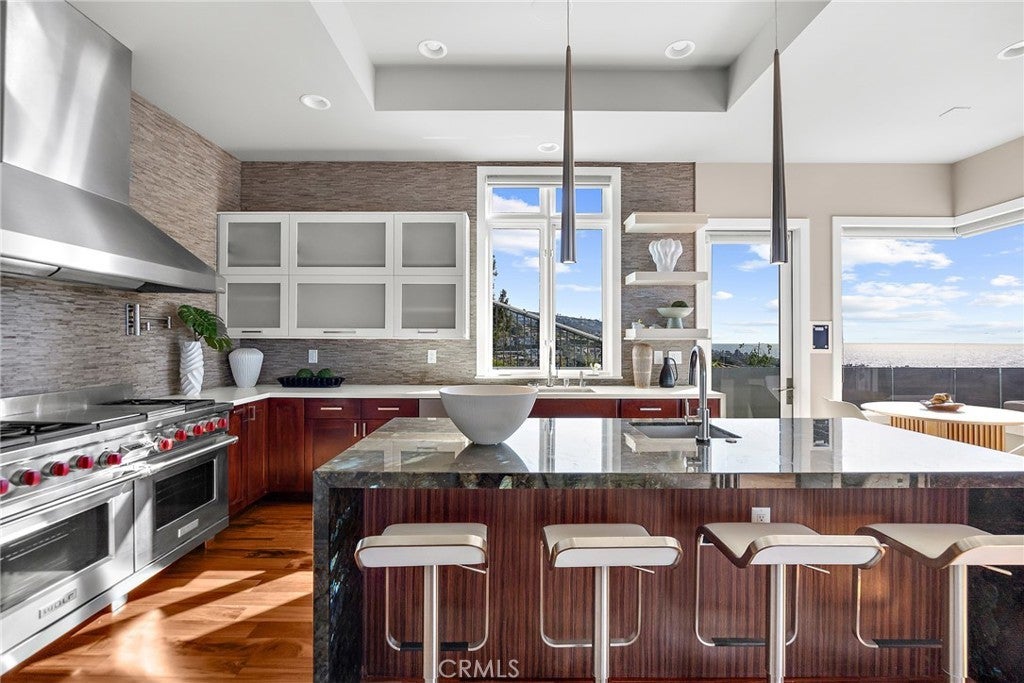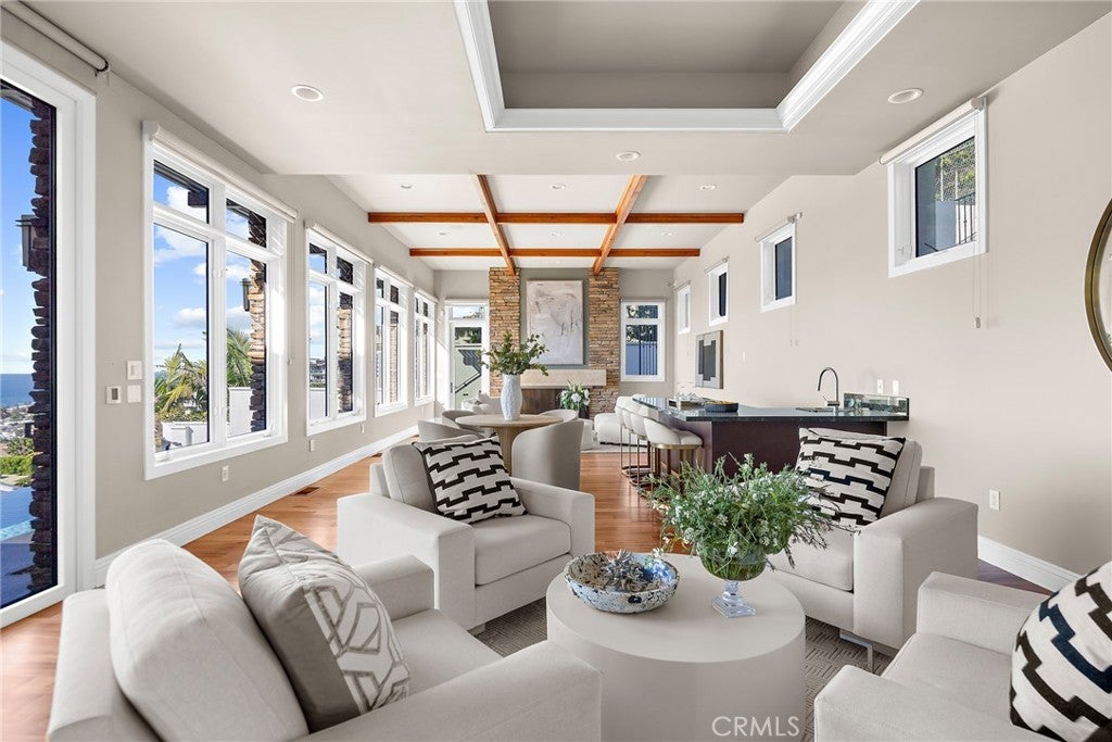 Set above one of Laguna Beach’s most iconic stretches of coastline, this rare estate offers sweeping, unobstructed panoramic views of Catalina Island and Main Beach. Positioned on a gated one-third-acre lot, the residence stands with commanding presence and spans more than 6,200 square feet of refined living space, thoughtfully designed to frame the Pacific at every turn. An infinity-edge pool appears to merge seamlessly with the ocean, complemented by sculpted hardscape, curated coastal landscaping, a beautifully appointed patio with a built-in BBQ grill overlooking the ocean and South Laguna Beach, a generously sized and meticulously maintained backyard ideal for pets or gardening, a spacious three-car garage with EV chargers and refined ocean-view windows, and an expansive six-car motor court designed for the discerning automotive enthusiast. Inside, architectural sophistication meets custom craftsmanship. Vaulted ceilings elevate the sense of scale, while the gourmet chef’s kitchen showcases premium finishes and a striking Madagascar-quarried stone island. A glass elevator delivers ocean views on every ride. Multi-fold panel doors open seamlessly to the pool area and outdoor fireplace, creating a true indoor-outdoor living experience. Brazilian cherry wood flooring, a dedicated home theater engineered for an immersive entertainment experience, and fireplaces in the living room, primary suite, and terrace enhance the home’s warmth and character. Four generous bedroom suites with ensuite bathrooms provide comfort and flexibility, ideal for guests or remote work. Smart-home amenities include integrated audio, advanced lighting controls, dual-zone climate systems, comprehensive security, and a central vacuum. State-of-the-art solar panels further elevate efficiency and reduce energy costs. Just a short walk from award-winning Laguna Beach High School—recognized for academic excellence, AP program achievement, and robust arts and athletics programs—and a short drive to major freeways, entertainment centers, shopping destinations, and popular eateries, this exceptional residence captures the full beauty and drama of the Laguna coastline from sunrise to sunset. The result is an inspired blend of luxury, privacy, and coastal elegance. All furnishings shown are for staging and aesthetic purposes only and are not included in the sale.