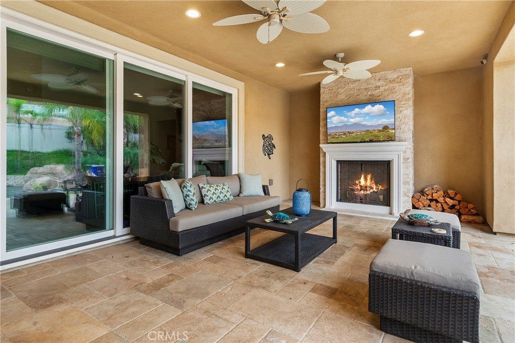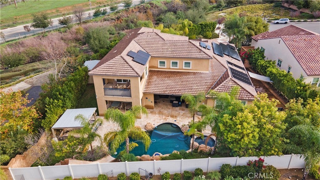 Discover Unrivaled Luxury in Your Private Tropical Oasis: Experience the pinnacle of sophisticated living in this superbly appointed estate. From the moment you pass through the cast-iron gates into the private, travertine-tile atrium, you are greeted by an entertainer’s paradise defined by soaring 20ft ceilings and cascading natural light. The open-concept floor plan flows seamlessly from the living room—featuring a floor-to-ceiling travertine fireplace—to a chef’s kitchen that is a masterclass in design. Outfitted with a massive quartz-top island, quartz counter-tops, marble-tiled backsplash, professional-grade stainless-steel appliances, and dark espresso wood and glass cabinetry, this kitchen is as functional as it is beautiful. Be sure to check out the massive walk-in pantry! Seamless Indoor-Outdoor Living: Retractable glass sliders in the family room, living room and upstairs bonus room erase the boundaries between the interior and three expansive, covered patios that feature ceiling fans and a large outdoor fireplace. The backyard is a resort-style sanctuary featuring a lagoon-style pool and spa with a luxurious pebble-tech and luminescent abalone shell surface, a cascading waterfall, a built-in water slide, and a fire-topped focal point. Whether hosting at the outdoor bar and built-in BBQ or relaxing by the spa's fire pit, the lush tropical foliage and designer travertine hardscape provide a rich, exotic and tranquil setting. Elite Accommodations & Sustainability: The expansive downstairs primary suite offers a private sanctuary with a travertine accent wall, plantation shutters, and a spa-inspired bath with an oversized soaking tub and large walk-in shower with marble tile accents. Upstairs, a versatile bonus room with a wet bar opens to a scenic balcony overlooking the lush grounds. With all bedrooms featuring private ensuite bathrooms, a custom driveway of travertine, aggregate and color-stamped concrete, a 4-car garage with double-insulated doors and upgraded epoxied flooring, a storage shed, and a fully owned solar system with three backup batteries, this home offers ultimate luxury and peace of mind. This is the opportunity you have been holding out for—act now!