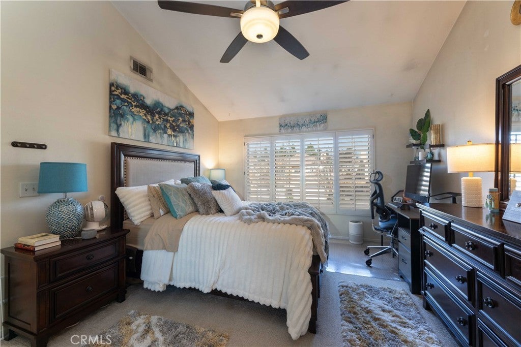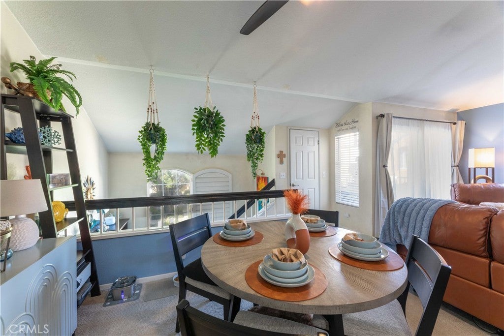 There’s a quiet sense of ease the moment you arrive—a feeling of being gently set apart from the outside world. This thoughtfully designed home welcomes you through a private entry foyer, offering a natural transition before you ascend to the main living level. With all primary living spaces thoughtfully positioned upstairs, the home enjoys a peaceful, elevated feel—removed from street activity & grounded in light, openness, & calm. Once upstairs, vaulted ceilings soar above the main living areas, enhancing the airy, light-filled layout. Dual-pane windows with decorative grids & plantation shutters allow sunlight to filter in beautifully, while designer carpet & linen-style porcelain tile add warmth & texture underfoot. The living room centers around a marble tile inset gas fireplace, complemented by a pull-down TV mount that blends form & function. The home's relaxed & balanced atmosphere is reinforced by the air conditioning & powerful three-blade ceiling fan in the spacious dining room. The kitchen is both refined & practical, featuring crisp white cabinetry with soft-close drawers, pull-out drawers, a spice cabinet, a large closet-size pantry, under-cabinet lighting, recessed lighting, & a silverware organizer. Granite countertops, stainless steel appliances, & ample prep space make it ideal for a gourmet chef, entertaining, & everyday living. The primary suite offers a calming retreat with vaulted ceilings, mirrored wardrobe doors, custom closet organizers, & additional storage above the closets. The en-suite bathroom features generous counter space & linen storage, a 2nd closet, a LUXE bidet, & clean, coastal-inspired finishes. A secondary bedroom provides flexibility for guests, a home office, or creative space & includes a ceiling fan, closet organizer & mirrored wardrobe doors, while the nearby bathroom features a second LUXE bidet & coordinated finishes. Step outside to the private south-west facing balcony—a sunlit extension of the living space that’s perfect for morning coffee, evening relaxation, or quiet reflection. The outdoor space feels open yet private, enhanced by the home’s elevated orientation. Additional highlights include 6-panel doors, an attic fan, PEX repipe, saltwater softener system, reverse osmosis at kitchen sink, & one-car enclosed garage with direct access—offering both convenience & versatility. Residents enjoy access to a community pool & spa, & is located near shopping, dining, parks, award-winning schools, & restaurants.