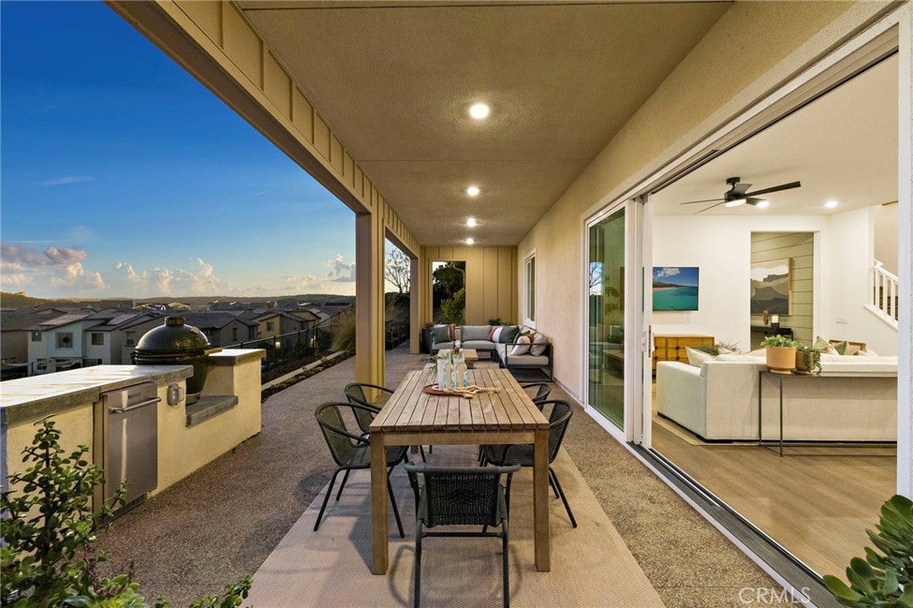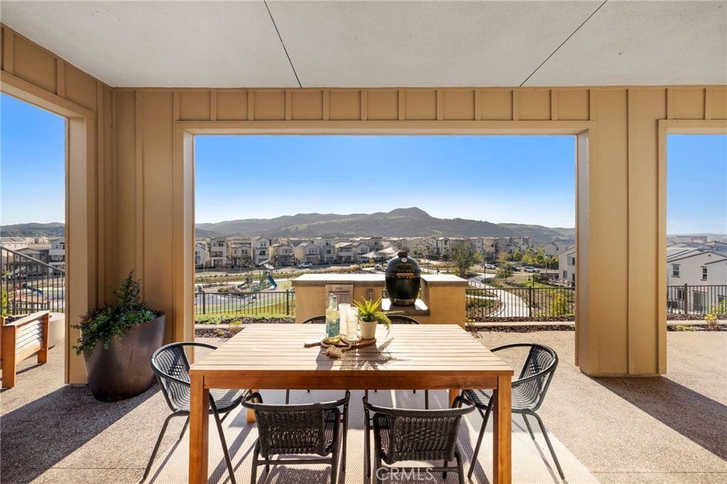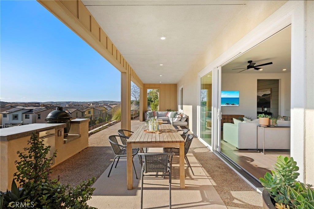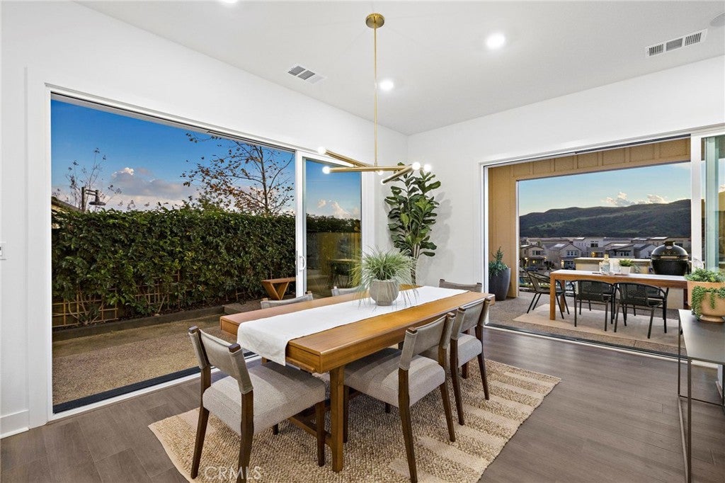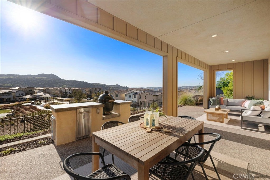 Perched on a hillside with panoramic views, this former Pearl Model Home impresses. Upon entry you are drawn in by the two walls of glass stacking doors opening to the stunning backyard with panoramic views of the hills and beyond. Rich wide plank luxury vinyl flooring flows throughout the main living spaces of this highly upgraded former model home. The kitchen features white cabinetry with soft close hinges, white quartz countertops, full tile backsplash and stainless steel appliances—including a large built-in refrigerator and 6 burner stove. Two bedrooms, including the primary suite and secondary suite, office, laundry room and powder bath are all on the first floor—including an attached two-car garage with epoxy flooring plus an 8 panel Solar System. Just upstairs the second floor boasts a large bonus room with full bath which can be used as a third bedroom suite, gym or game room. The spacious primary suite with beautiful limestone tile focal wall and designer chandelier. It’s generous ensuite bath has a dual sink vanity, walk-in shower with glass enclosure and bench seat and a large walk-in closet. Office with custom paint and a modern oversized brass ceiling light for a curated look. Guests will be welcomed with upgraded carpeting, a stylish wallpapered accent wall and striking gold chandelier. Plus the ensuite bath with single sink vanity and tub/shower combination makes it a luxurious space for guests. Upstairs is a oversized bonus room with wrap around windows that share the same stunning views as the backyard. With an ensuite full bath and wall of closets, this space is full of options. The home’s backyard is the star of the show! On a corner lot offering maximum privacy with only one neighbor the side and unobstructed views of open space and mountains beyond. A combination of hardscape pavers, turf and mature landscaping with ambient lighting make it a comfortable space to spend time outdoors day or night. The large covered patio with recessed lighting nearly spans the entire length of the back of the home and the wrap around yard includes a bocce ball court. A built-in BBQ bar has a Green Egg smoker and stainless steel refrigerator —convenient for outdoor entertaining. Steps from the home is the Perch 55+ Pool complex plus you have access to all of the amenities that both Gavilan and Rancho Mission Viejo have to offer which include ten community pools and clubhouses, tennis and pickleball courts, walking trails, coffee shop, gyms and more.
