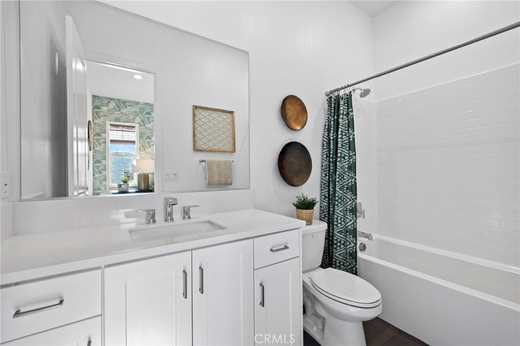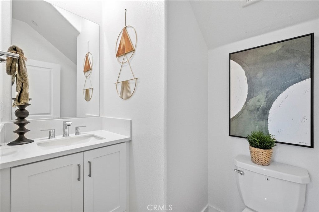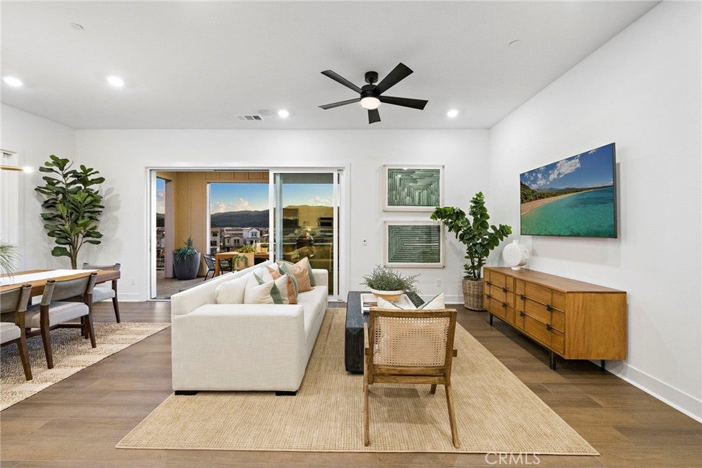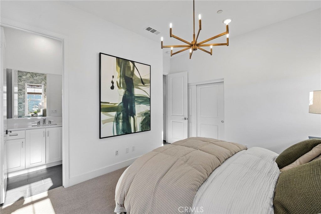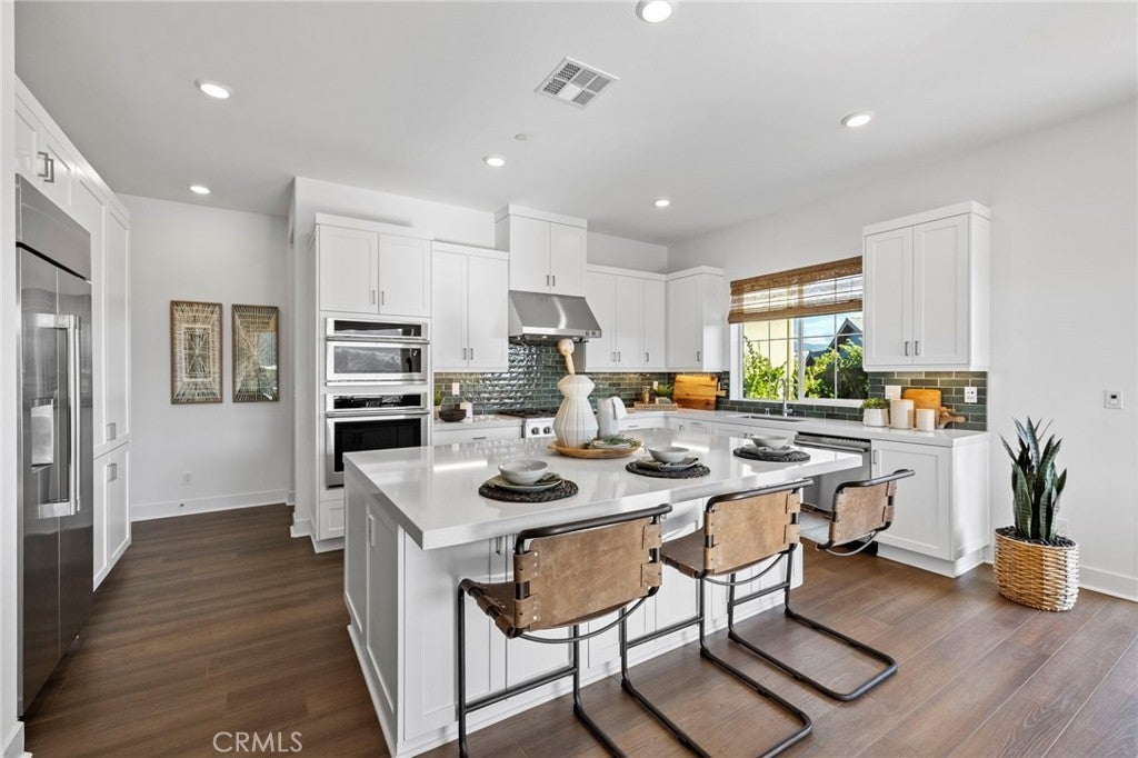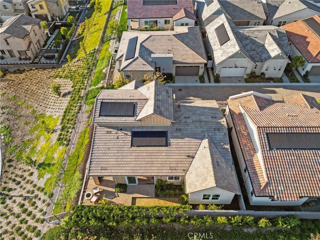 Perched on a hillside with panoramic views, this former Pearl Model Home impresses. Upon entry you are drawn in by the two walls of glass stacking doors opening to the stunning backyard with panoramic views of the hills and beyond. Rich wide plank luxury vinyl flooring flows throughout the main living spaces of this highly upgraded former model home. The kitchen features white cabinetry with soft close hinges, white quartz countertops, full tile backsplash and stainless steel appliances—including a large built-in refrigerator and 6 burner stove. Two bedrooms, including the primary suite and secondary suite, office, laundry room and powder bath are all on the first floor—including an attached two-car garage with epoxy flooring plus an 8 panel Solar System. Just upstairs the second floor boasts a large bonus room with full bath which can be used as a third bedroom suite, gym or game room. The spacious primary suite with beautiful limestone tile focal wall and designer chandelier. It’s generous ensuite bath has a dual sink vanity, walk-in shower with glass enclosure and bench seat and a large walk-in closet. Office with custom paint and a modern oversized brass ceiling light for a curated look. Guests will be welcomed with upgraded carpeting, a stylish wallpapered accent wall and striking gold chandelier. Plus the ensuite bath with single sink vanity and tub/shower combination makes it a luxurious space for guests. Upstairs is a oversized bonus room with wrap around windows that share the same stunning views as the backyard. With an ensuite full bath and wall of closets, this space is full of options. The home’s backyard is the star of the show! On a corner lot offering maximum privacy with only one neighbor the side and unobstructed views of open space and mountains beyond. A combination of hardscape pavers, turf and mature landscaping with ambient lighting make it a comfortable space to spend time outdoors day or night. The large covered patio with recessed lighting nearly spans the entire length of the back of the home and the wrap around yard includes a bocce ball court. A built-in BBQ bar has a Green Egg smoker and stainless steel refrigerator —convenient for outdoor entertaining. Steps from the home is the Perch 55+ Pool complex plus you have access to all of the amenities that both Gavilan and Rancho Mission Viejo have to offer which include ten community pools and clubhouses, tennis and pickleball courts, walking trails, coffee shop, gyms and more.