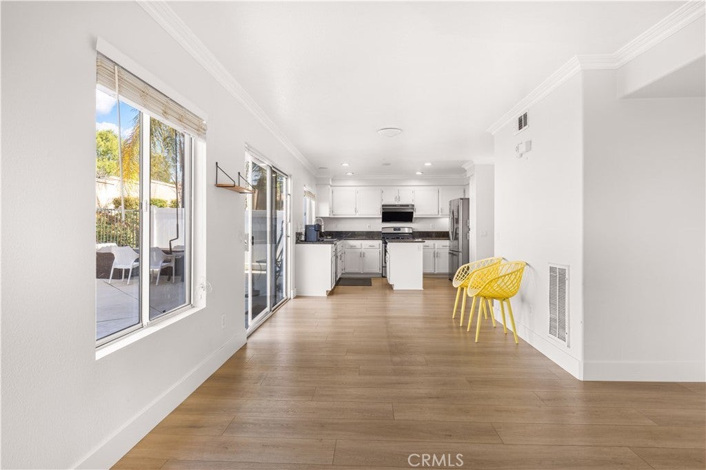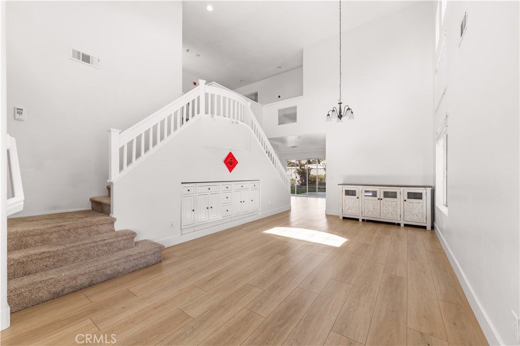 Mediterranean charmer featuring 4 bedrooms and 2.5 baths is nestled in the wonderful hillside community in Foothill Ranch!!Tucked away on a quiet cul-de-sac street, this home features a long driveway leading to a charming front courtyard with archways. Step inside the formal living room offering an impressive double staircase with media niche, high-volume ceilings, gorgeous wood flooring, and upgraded lighting. The large remodeled kitchen boasts beautiful white cabinet, granite counter tops, center island with granite top and drawers, dual sinks, crown molding, recessed lighting, and a large picture window for abundant natural light. Dining room features sliding glass doors with a sunny view of the backyard. Dining room opens to the family room boasting a large, built-in entertainment center, cozy fireplace, crown molding, upgraded ceiling fan, and plenty of windows. Home has convenient inside laundry. Master suite boasts high-volume ceilings, large walk-in closet, travertine floors, new vanity with granite counter top and dual sinks. Sitting area upstairs is used as a small loft perfect for the kids. The backyard features multiple entertaining areas, raised planters, lots of fruits trees. This home has it all plus it's located just a short distance to an award-winning, Blue Ribbon elementary school, shopping, dining, and theaters. Must See!!