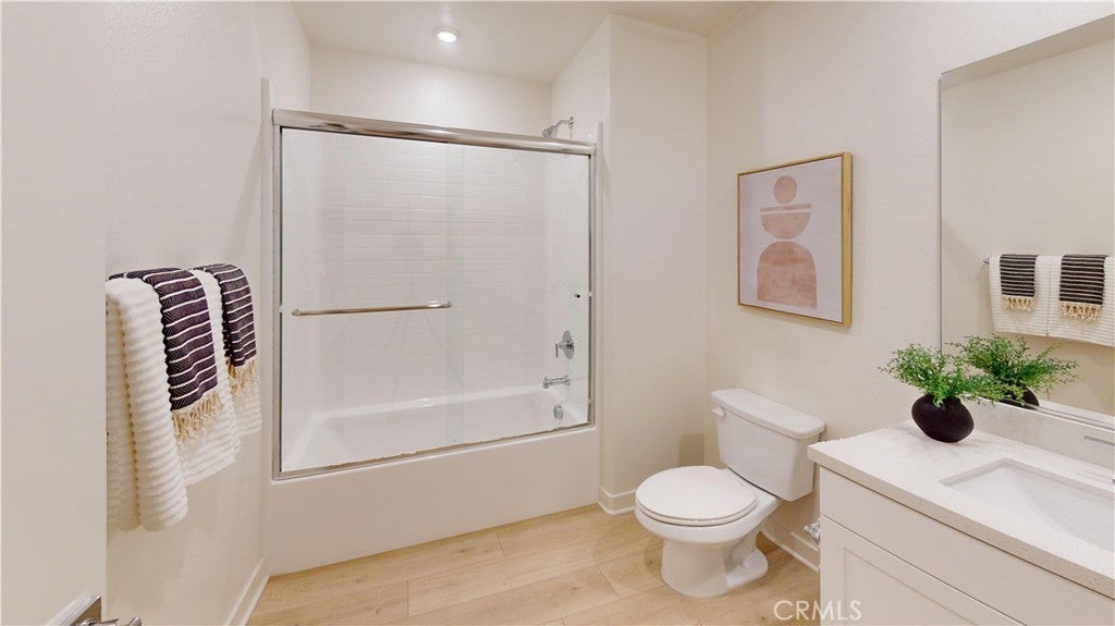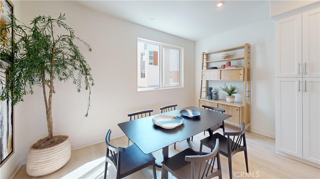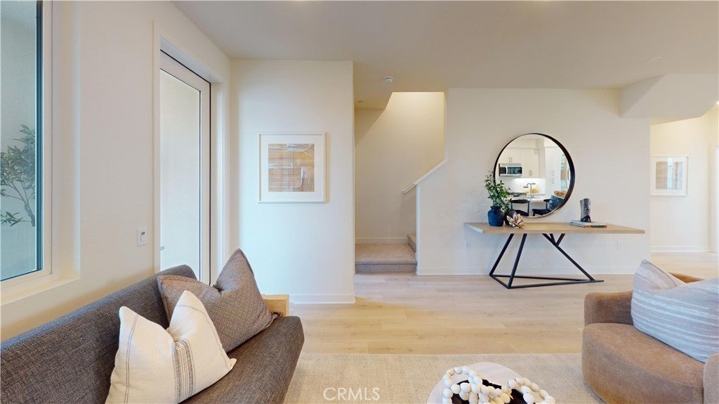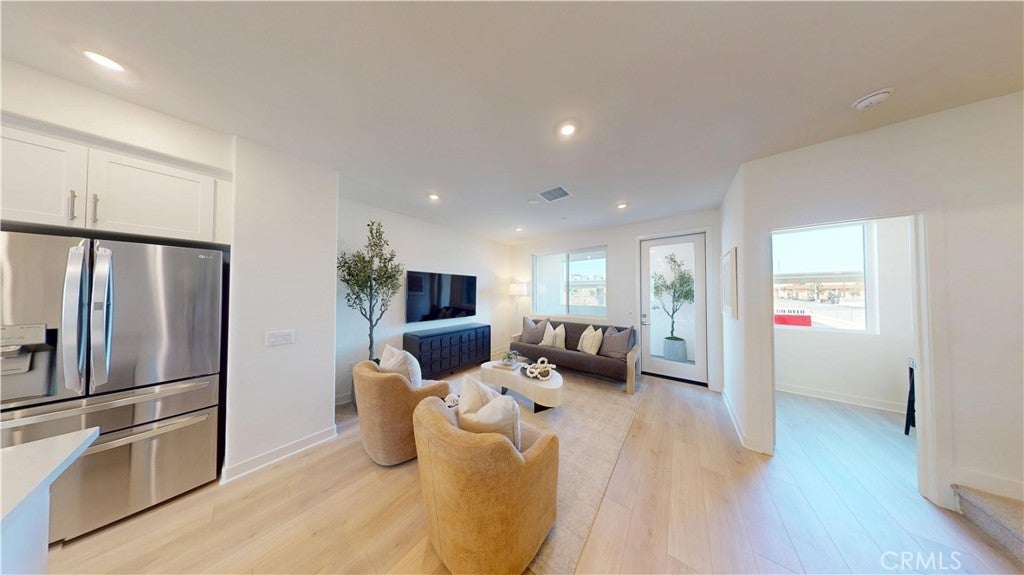 The largest plan at Cabrillo Crossing - Plan 4 has a first floor office that is OVERSIZED with adjacent powder bath so convenient for work, exercise, play, studio and more. Upstairs, you’ll love the great room floorplan with spacious kitchen, adjacent office/study with gliding barn-style doors, Floor to Ceiling Windows, dining area and abundance of included cabinetry, oversized baseboards, recessed lighting and other designer selected finishes. HUGE walk-in pantry, stainless steel appliances and gorgeous, upgraded horizontally staggered tile backsplash. Home is TURN-KEY and has upgraded, luxurious vinyl plank flooring and carpet throughout. Covered second-floor deck to enjoy outside. This home is spacious with high ceilings and enormous windows showcasing all bedrooms on the same level of living with side by side laundry. Unique to this plan only large Flex room/Bonus room with roof deck to relax and unwind under the SoCal skies. This end unit has a private location and near mature trees. Don't miss the last Plan 4 at Cabrillo Crossing!