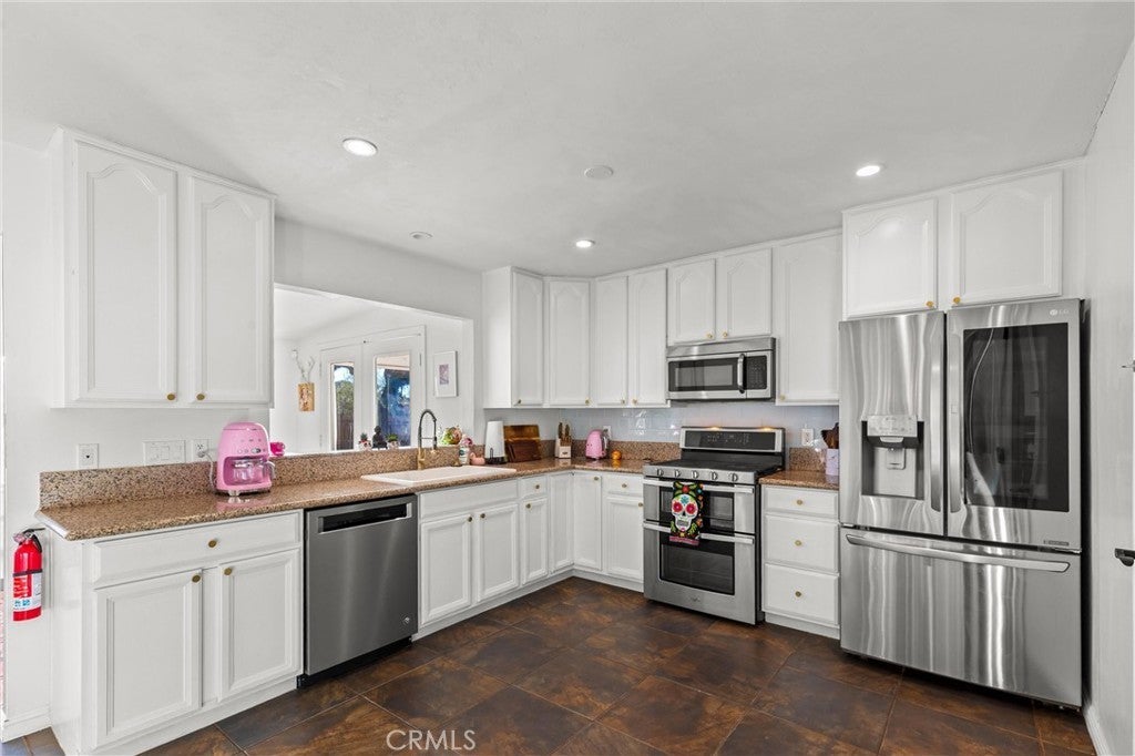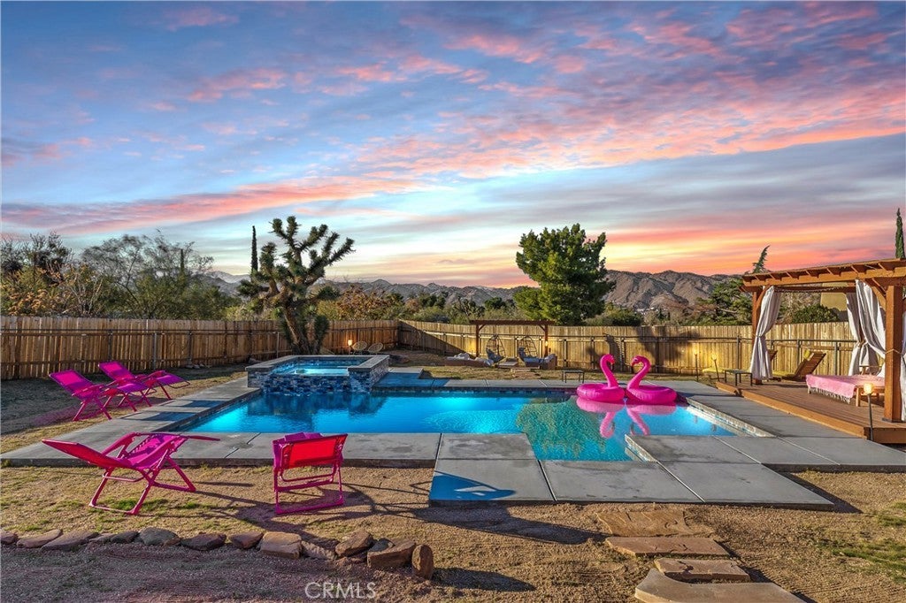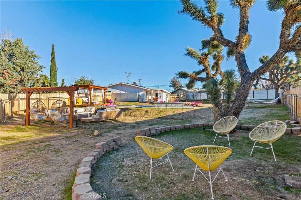 Discover the perfect blend of desert charm and modern comfort in this beautifully updated three-bedroom, two-bath home situated on a generous half-acre corner lot in Yucca Valley’s desirable Storey Park community. Designed with indoor–outdoor living in mind, this home features an inviting open layout with abundant natural light, neutral finishes, and a seamless flow for relaxing or entertaining. The chef-friendly kitchen offers crisp white cabinetry, granite countertops, and stainless steel appliances, while the cozy living area is anchored by a classic fireplace. Step outside to your own private oasis—complete with a sparkling 2022 pool, elevated spa, and a spacious baja shelf perfect for lounging. The backyard is fully fenced and thoughtfully designed with multiple spaces to unwind, including a covered patio ideal for dining, a wooden deck with a stylish cabana for shaded relaxation, and additional seating areas surrounded by Joshua Trees and mountain views. This layout makes it an excellent option for a primary residence, vacation retreat, or short-term rental investment (buyer to verify). Additional upgrades include owned solar (approx. 3 years old), dual-pane windows, central heating and air, a newer evaporative cooler, and a dedicated dog run. Just minutes from Joshua Tree National Park, local shops, dining, schools, and outdoor recreation, this property offers the perfect mix of tranquility, convenience, and desert-lifestyle living.