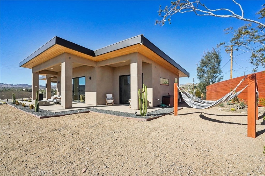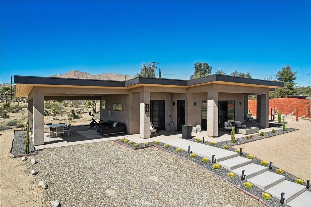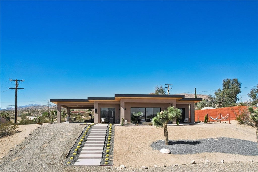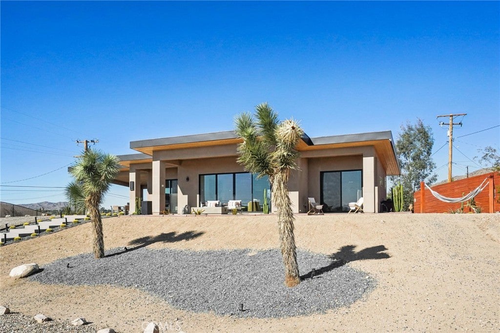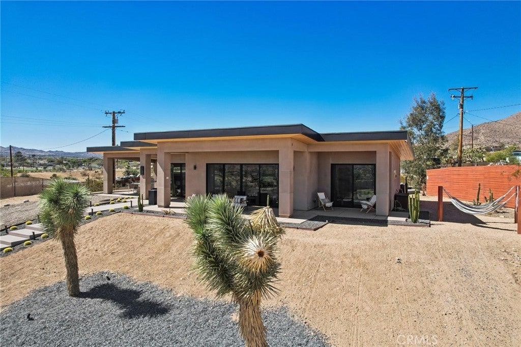 Welcome to 59080 Nelson Avenue — Very strong Airbnb home, with over $91,000 of short term rental income for the 2025 calendar year. A newly constructed 2-bedroom, 2-bath modern desert retreat built in 2023, perfectly positioned in the sought-after Yucca Mesa neighborhood, just minutes from Joshua Tree National Park, Pioneertown, and downtown Yucca Valley’s shops and restaurants. This exceptional home seamlessly blends sophisticated design, smart technology, and serene desert surroundings for the ultimate indoor-outdoor lifestyle. The property is equipped with solar panels, providing energy efficiency and sustainability year-round. Currently operating as a highly successful Airbnb with numerous positive reviews, the home offers both investment potential and luxurious livability. Enter through the automatic gate into a fully enclosed property surrounded by a 10-foot wood privacy fence and lush, drought-tolerant landscaping with Bluetooth-controlled irrigation. Outdoor spaces were designed for relaxation and entertainment, featuring a custom deck, cowboy pool with lighting, Plunge cold plunge, jacuzzi, Clearlight UV sauna, gas fire pit, and RH fountain. Enjoy music through the outdoor SONOS speakers or unwind in one of the hammocks while taking in panoramic desert views. Every detail has been thoughtfully curated to create a seamless blend of comfort, privacy, and luxury. Whether as a full-time residence, weekend escape, or high-performing short-term rental, 59080 Nelson Avenue captures the essence of elevated desert living — where tranquility meets modern design, just moments from Joshua Tree.