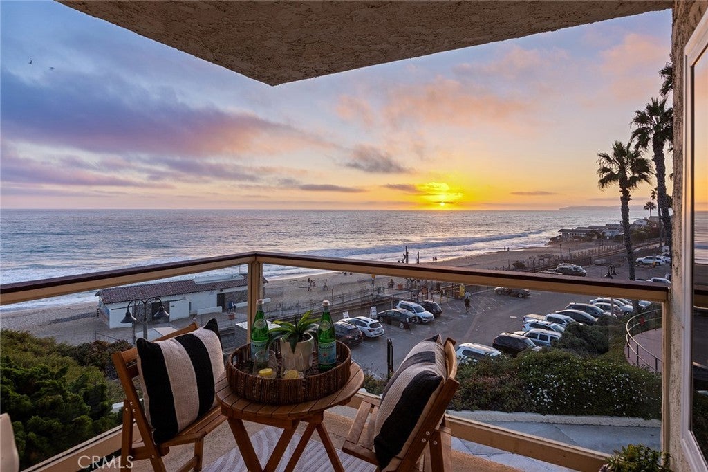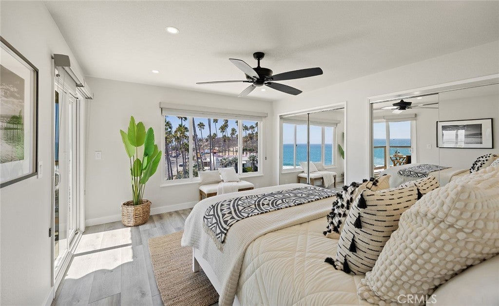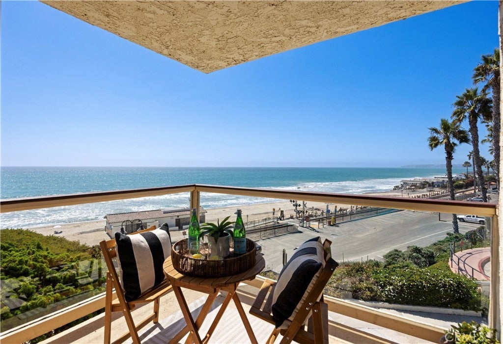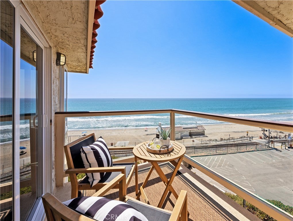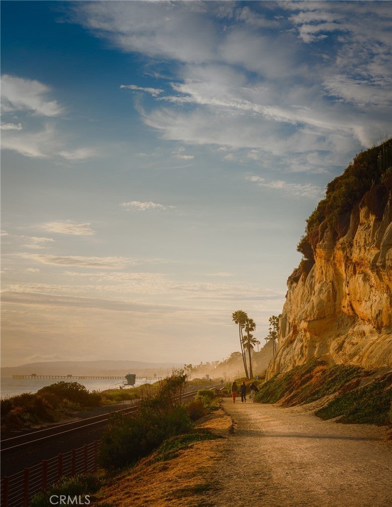 Overlooking the ocean on the most iconic cul-de-sac location just across from the historic Ole Hanson Beach Club, this beachy condo offers incredible views! Reaching the distant Dana Headlands with year-round sunsets, crashing waves below & Catalina / SC Islands between. Elevated high above with 2 private garages, EV charger (only private 2-car garage) & rare parking for 3 in the driveway, the unit is secured by coded privacy gates. Ideally positioned on the front with only one shared wall (no one above or below) nearly every room has a major ocean view. Inside, a light-filled living space with mirrored walls reflects the ocean throughout. Featuring LVP wood-like flooring, glass-pane stair railing, new recessed lighting throughout, wired speakers & shiplap fireplace. An outdoor viewing deck off the living brings the outdoors into this remodeled space. A dedicated dining room with large picture windows flows seamlessly into the lightly-used kitchen. A very dialed-in kitchen offers all-new stainless appliances, newly-added coastal subway tile backsplash, crisp white shaker cabinetry with new hardware, polished Neolith kitchen counters & comfortable bar seating for three. A dedicated laundry room & pantry just off the kitchen accesses the main level powder bath. Upstairs leads to two bedrooms & bathrooms. The guest bathroom has recently been remodeled to create a walk-in shower. The ocean-view guest bedroom features a built-in Murphy bed for optionality & shares a relaxing second-level viewing deck accessed through slider doors on each side. In the primary, large picture windows frame the Pacific while mirrored doors refract the emerald ocean abound. The primary offers his & hers closets, access to the view deck, & a very dialed primary ensuite bathroom with walk-in shower. Newer upgrades include dual pane windows, new custom window treatments (automatic solar shades), recessed lighting throughout, ceiling fans, smooth-coated first level, remodeled guest bathroom, kitchen updates & new stainless appliances, & 2022 water heater, this unit is absolutely turnkey! Easy access to sandy beaches & 2.5 mile beach trail just below, Outlet Mall & Theaters, popular Life Time Fitness & Tennis Club, several great golf courses, world-class surfing, a short walk to the highly-anticipated Miramar Food Hall (opening soon) & nearby trendy restaurants & cafes. For those seeking a laidback beachy lifestyle, this is the opportunity!