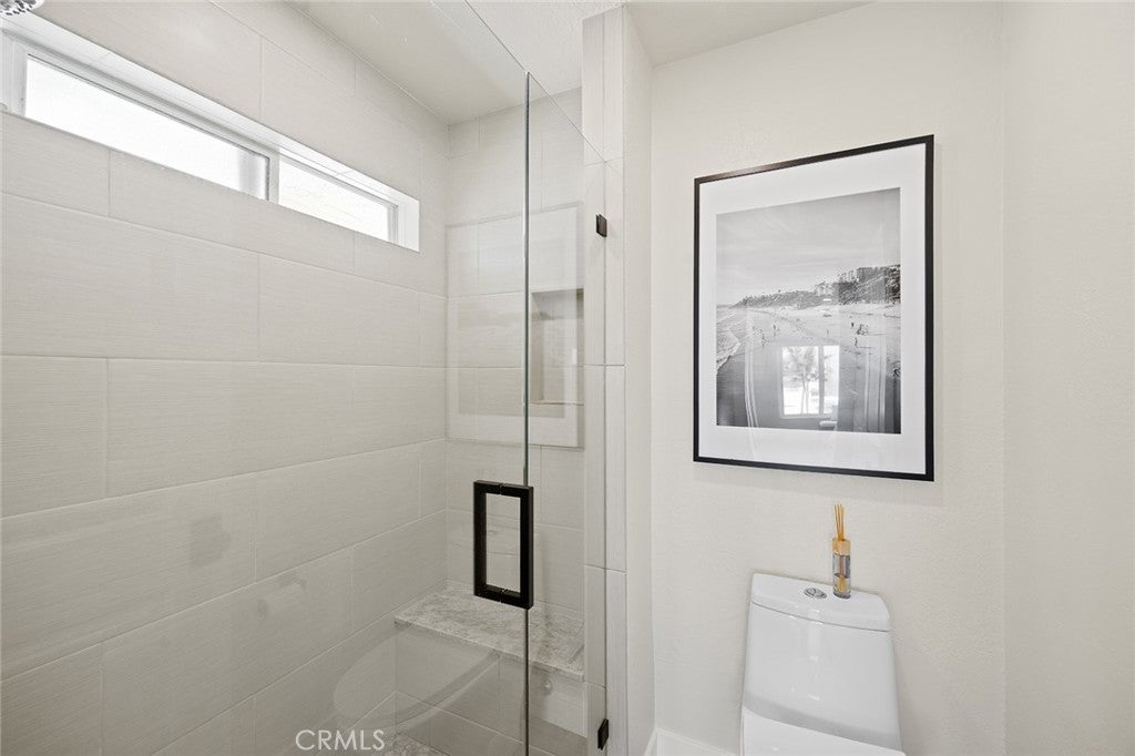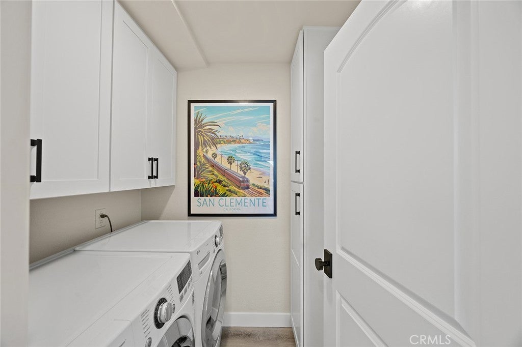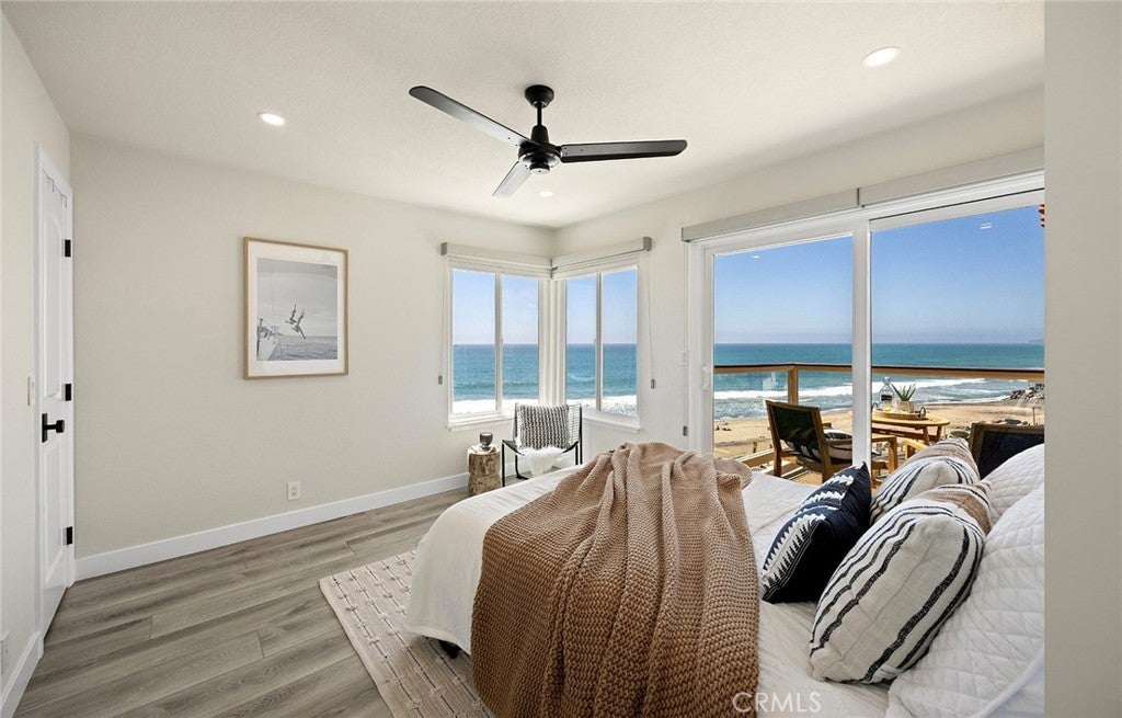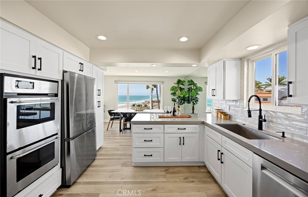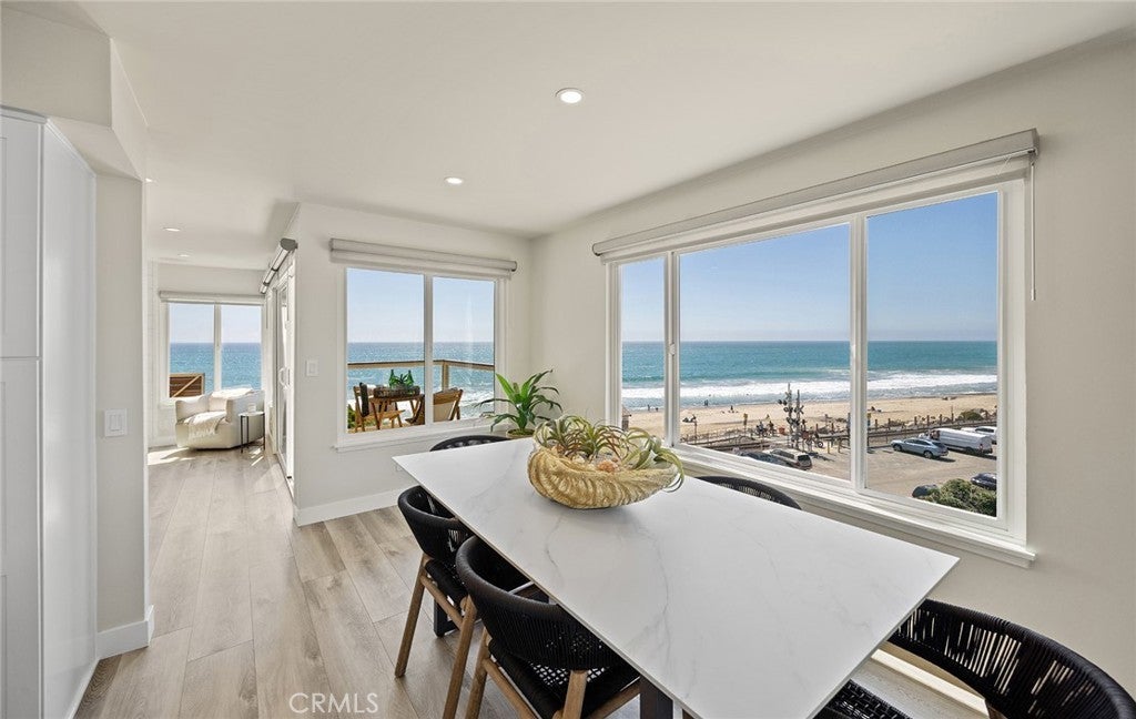 Overlooking the ocean on the most iconic cul-de-sac location just across from the historic Ole Hanson Beach Club, this beachy condo offers incredible views! Reaching the distant Dana Headlands with year-round sunsets, crashing waves below & Catalina / SC Islands between. Elevated high above with 2 private garages, EV charger (only private 2-car garage) & rare parking for 3 in the driveway, the unit is secured by coded privacy gates. Ideally positioned on the front with only one shared wall (no one above or below) nearly every room has a major ocean view. Inside, a light-filled living space with mirrored walls reflects the ocean throughout. Featuring LVP wood-like flooring, glass-pane stair railing, new recessed lighting throughout, wired speakers & shiplap fireplace. An outdoor viewing deck off the living brings the outdoors into this remodeled space. A dedicated dining room with large picture windows flows seamlessly into the lightly-used kitchen. A very dialed-in kitchen offers all-new stainless appliances, newly-added coastal subway tile backsplash, crisp white shaker cabinetry with new hardware, polished Neolith kitchen counters & comfortable bar seating for three. A dedicated laundry room & pantry just off the kitchen accesses the main level powder bath. Upstairs leads to two bedrooms & bathrooms. The guest bathroom has recently been remodeled to create a walk-in shower. The ocean-view guest bedroom features a built-in Murphy bed for optionality & shares a relaxing second-level viewing deck accessed through slider doors on each side. In the primary, large picture windows frame the Pacific while mirrored doors refract the emerald ocean abound. The primary offers his & hers closets, access to the view deck, & a very dialed primary ensuite bathroom with walk-in shower. Newer upgrades include dual pane windows, new custom window treatments (automatic solar shades), recessed lighting throughout, ceiling fans, smooth-coated first level, remodeled guest bathroom, kitchen updates & new stainless appliances, & 2022 water heater, this unit is absolutely turnkey! Easy access to sandy beaches & 2.5 mile beach trail just below, Outlet Mall & Theaters, popular Life Time Fitness & Tennis Club, several great golf courses, world-class surfing, a short walk to the highly-anticipated Miramar Food Hall (opening soon) & nearby trendy restaurants & cafes. For those seeking a laidback beachy lifestyle, this is the opportunity!