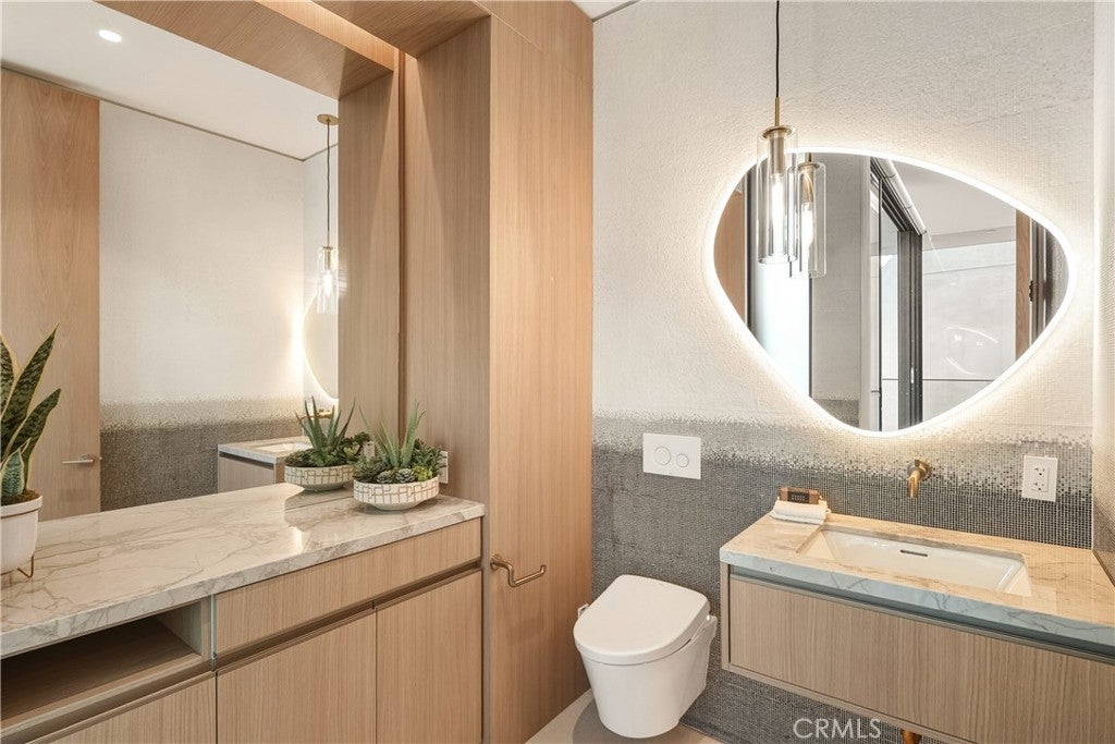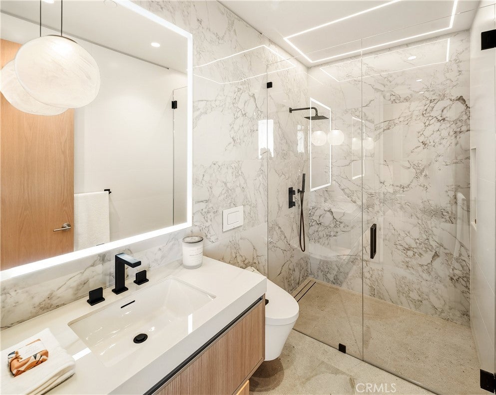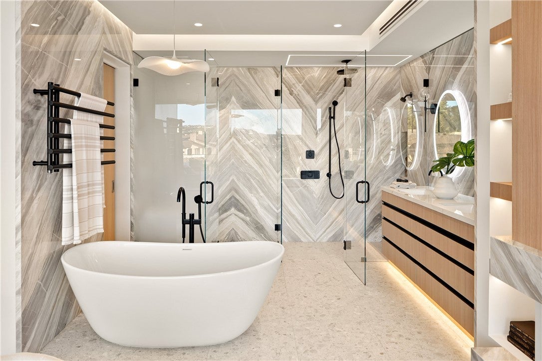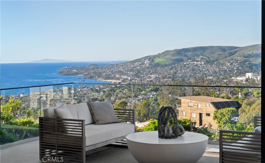 This newly constructed residence delivers a modern living experience defined by sweeping ocean views across Laguna Beach, high-quality materials, strong architectural lines, and a seamless indoor-outdoor flow. Thoughtfully positioned to capture western light and coastline panoramas, the layout is efficiently designed with no wasted space and is served by an elevator connecting all floors. The main living areas are positioned to allow for effortless flow to expansive outdoor terraces through large Western pocket doors, each framed by raised green planters that add texture and a natural counterpoint to the home’s clean architectural lines. Living, kitchen, dining, and bar spaces are open yet clearly defined, finished with limestone flooring, custom Italian cabinetry, and integrated lighting throughout. The kitchen is equipped with a full Thermador appliance package including dual dishwashers, integrated refrigerator and freezer, wine storage, built-in coffee system, steam microwave, and a full pantry. Italian marble countertops are used throughout the kitchen, bar, powder room, and fireplaces, while secondary bathrooms feature Spanish porcelain and full-height imported wall finishes. The upper level includes a primary suite and two additional ensuite bedrooms. The primary suite features motorized shades, a linear gas fireplace, custom walk-in closet, and a bathroom finished in Italian marble slab. A guest suite with walk-in closet and full bath is located near the main entry level, offering privacy and flexibility. Construction is predominantly steel and reinforced concrete, including twelve-inch exterior concrete walls, a concrete podium spanning the first level, and a foundation supported by more than forty-eight deep caissons. The garage offers 16-foot ceilings with capacity for vehicle lifts. Approved ADA-compliant plans for an additional dwelling unit are included, allowing for approximately 848 square feet of additional living space.