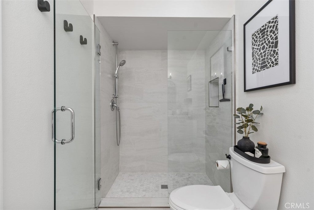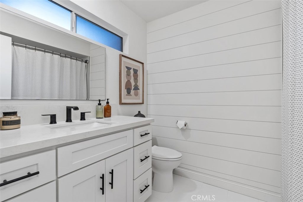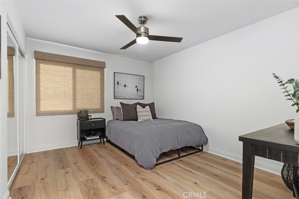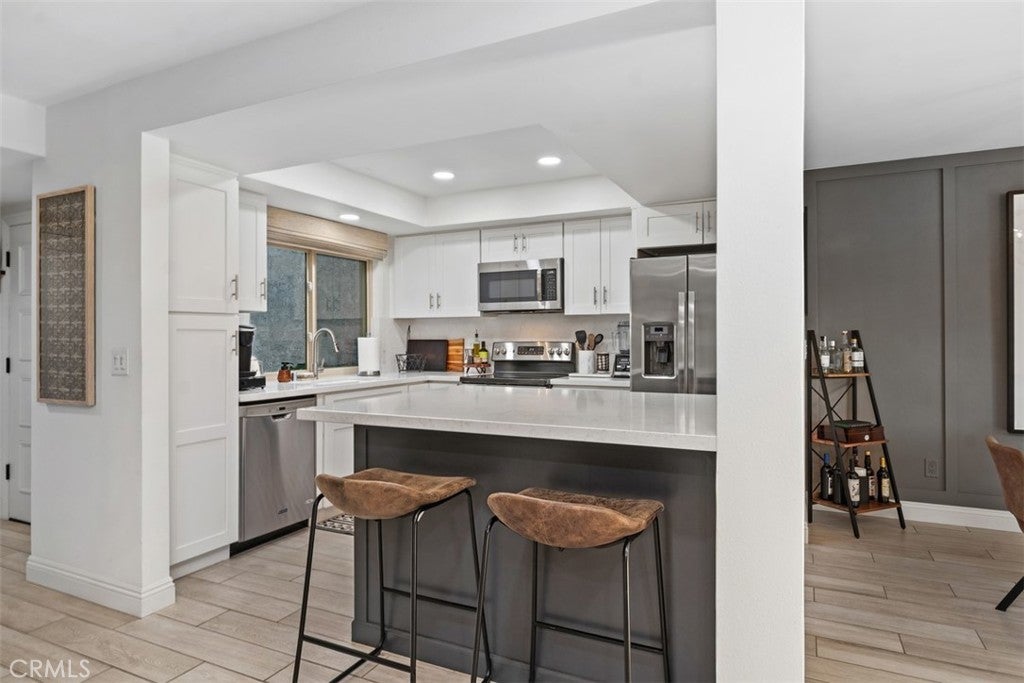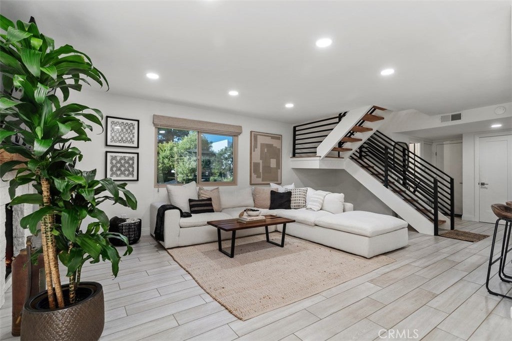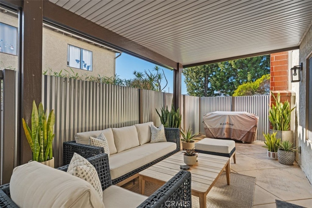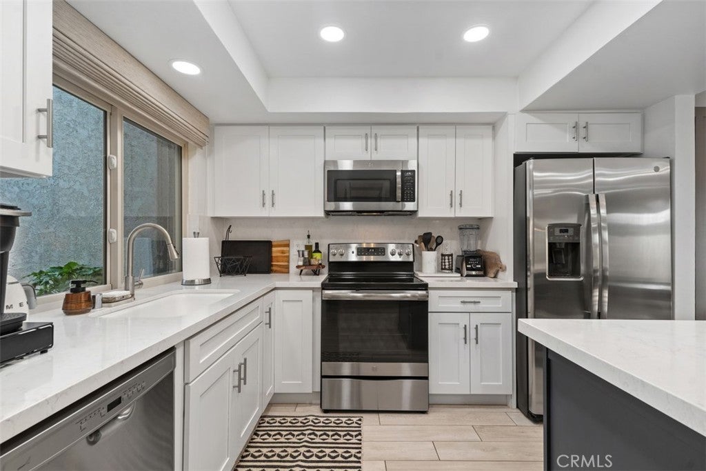 Stunning, extensively upgraded end-unit residence in a private, gated, beach-close community just minutes from the sand. The thoughtfully redesigned main level features porcelain tile floors throughout, creating a bright and cohesive living space anchored by an inviting fireplace and greenbelt outlook. The kitchen is both stylish and functional with white cabinetry, quartz countertops, stainless steel appliances, and a custom island with beverage fridge, organized storage, and trash/recycling pull-outs. Architectural details such as shiplap accents, wainscoting, accent wall trim, and Roman shades add warmth and character throughout the home. Upstairs, new luxury vinyl flooring flows through all bedrooms, complemented by a refinished natural-wood staircase and added recessed lighting. The primary suite offers vaulted ceilings, custom closets, a newly resurfaced private deck, and a beautifully updated en-suite bath with refined lighting, mirrors, and hardware. Two additional bedrooms are generously sized and include ceiling fans and great natural light. Recent enhancements also include a brand-new garage door, added garage cabinetry and storage racks, upgraded lighting throughout, a custom patio cover, paver perimeter, corrugated steel patio accents, and thoughtful landscaping. Residents enjoy resort-style amenities including pool, spa, and tennis courts, along with a peaceful greenbelt setting and close proximity to parks, shopping, dining, and world-class Southern California beaches.