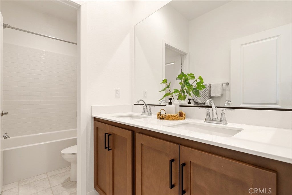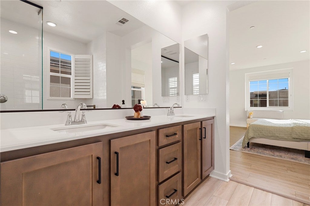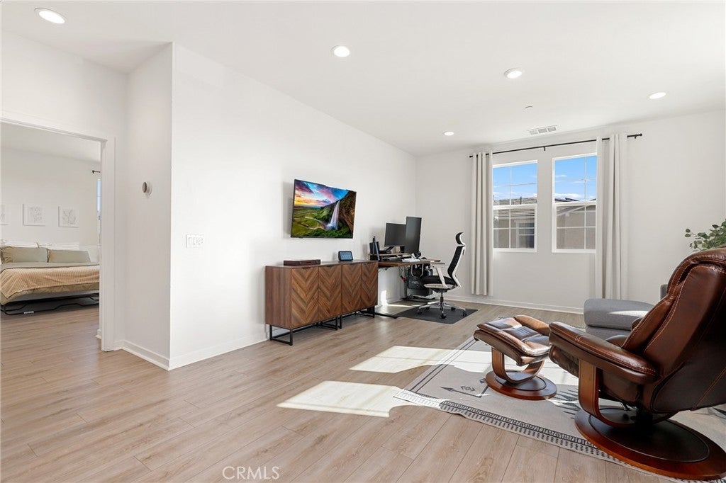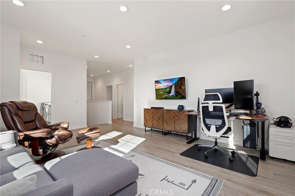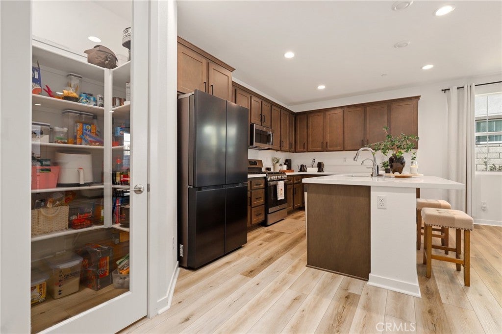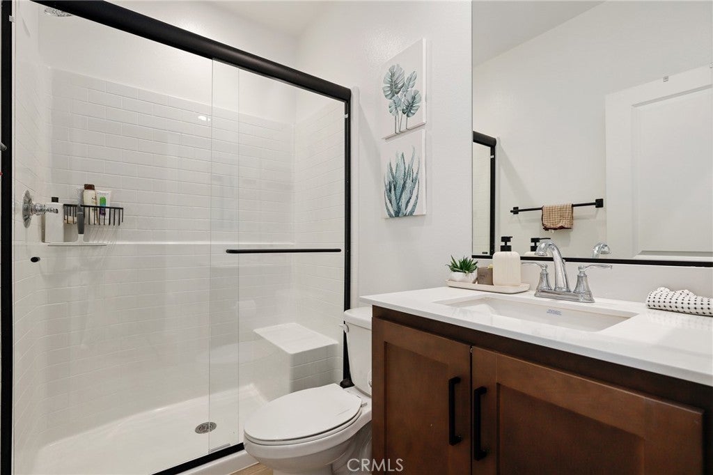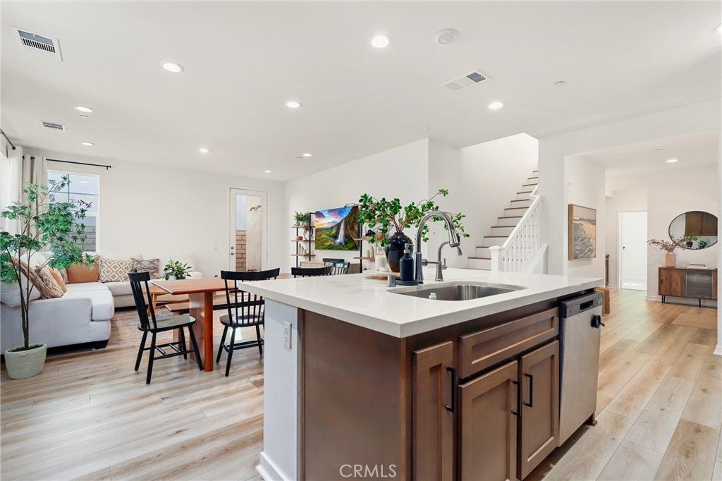 Welcome to 2983 E Halton Paseo, nestled in the desirable Cambridge Court neighborhood of Ontario. This fully upgraded home showcases luxury vinyl plank flooring throughout, quartz counters throughout, recessed lighting, and an open-concept design. The modern kitchen features quartz countertops, stainless steel appliances, a walk-in pantry, and a spacious center island that flows seamlessly into the living room. Sliding doors open to a wrap-around backyard with low-maintenance artificial turf, perfect for relaxing or entertaining. The main floor offers a bedroom and full bathroom, along with a two-car attached garage. Upstairs, enjoy a large loft and a primary suite with a walk-in closet and spa-inspired bathroom, complete with dual sinks, quartz vanity, and a supershower. Two additional bedrooms share a full hall bathroom. Energy-efficient leased solar panels add value and savings. Community amenities include a nearby park and playground.