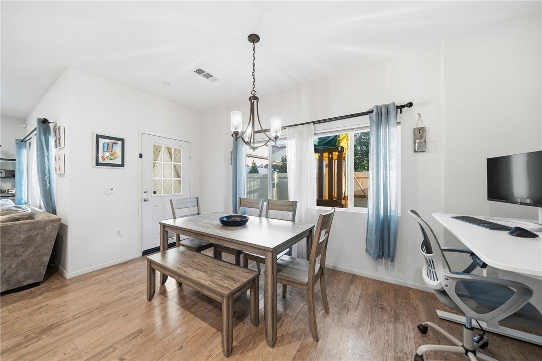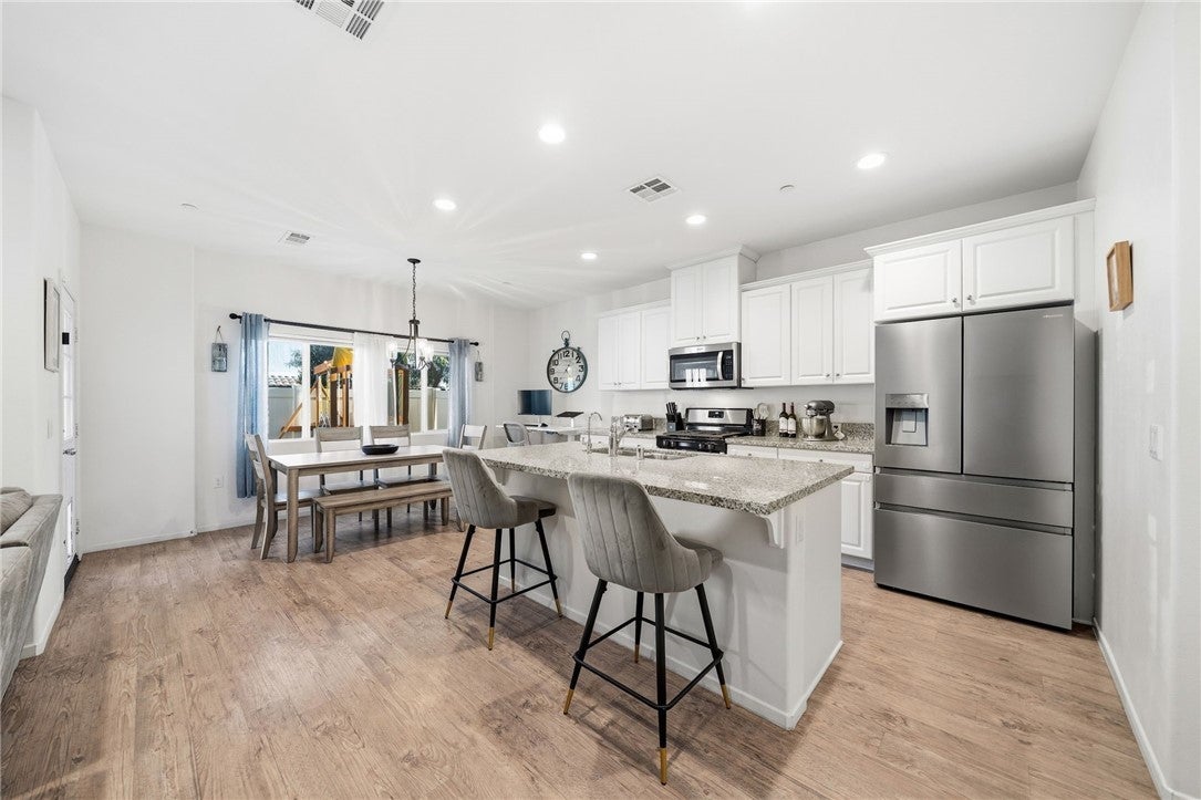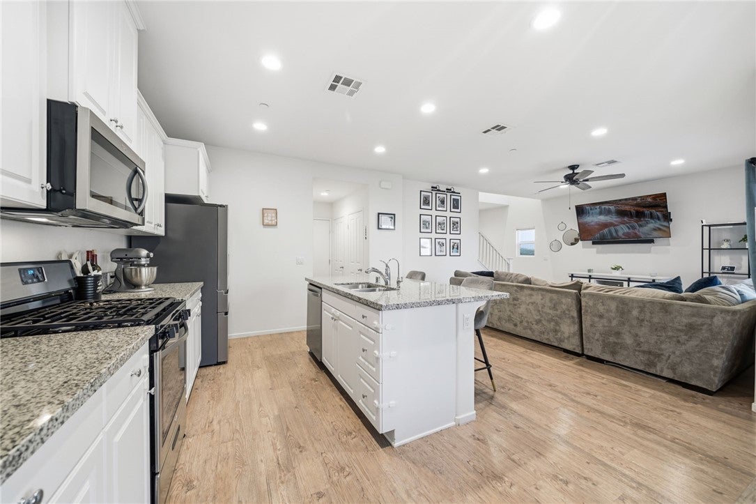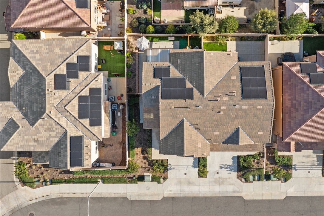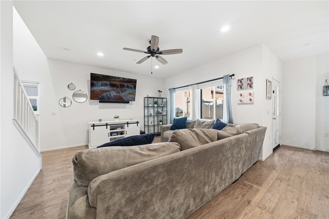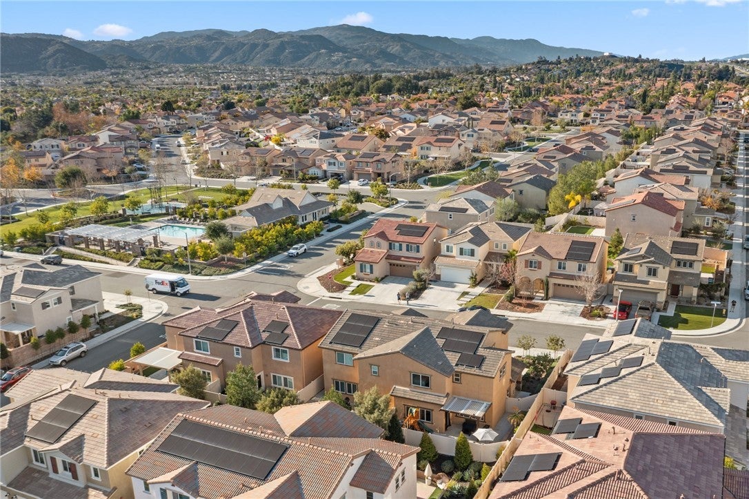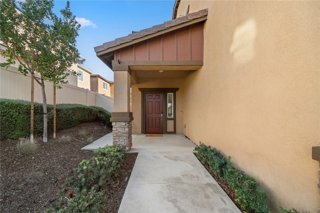 Winterberry is a beautiful end unit two story condo that truly lives and feels like a single family home. Showcasing approximately 1,728 sqft with three bedrooms, a spacious loft, two and a half bathrooms, a two car direct access garage with a rare full driveway plus a front yard and back yard. Other main property highlights include a tankless water heater, fully owned solar, a whole house fan, central AC, dual pane windows throughout plus a whole house water softener system. As soon as you walk into your new home, you will notice how light and bright the entire floorplan is. The entire downstairs portion of the home features laminate flooring. The living room is centrally located next to the chef's kitchen which has plenty of cabinetry for storage, stainless steel appliances, a stunning large island plus additional seating space in the adjacent dining room. There's also a downstairs half bath for guests as well as closet space and a pantry for storage. Upstairs a hallway connects all bedrooms as well as the large loft. The spacious primary bedroom has recessed lights, a ceiling fan and an ensuite primary bathroom with a walk in closet, dual sinks for the vanity and a walk in shower. The two guest bedrooms feature ceiling fans as well as sliding door closets. The upstairs hallway bathroom has a shower tub combo. Also upstairs you'll find a laundry room as well as a closet for storage. The wraparound backyard has plenty of space to entertain with a patio cover installed with an outdoor fan for those summer nights. There is also a garden bed on the side of the house for those who enjoy to garden. Located just down the street is the Santa Rosa Highlands community pool, kid's splash pool, playground, outdoor bbq area as well as a community clubhouse that is used to host events. Centrally located in Murrieta with nearby parks, shopping centers, Old Town Murrieta and great schools.