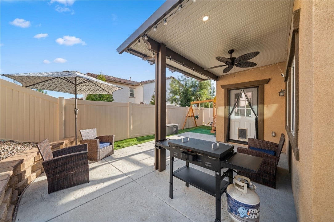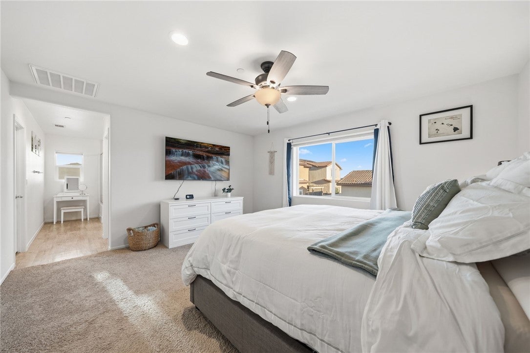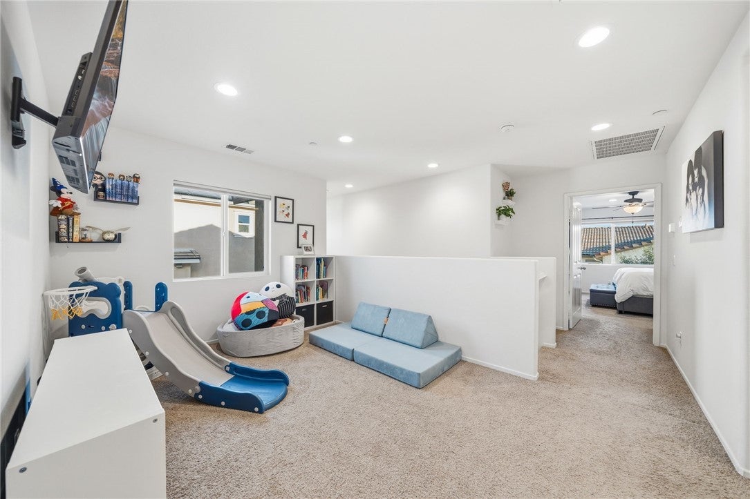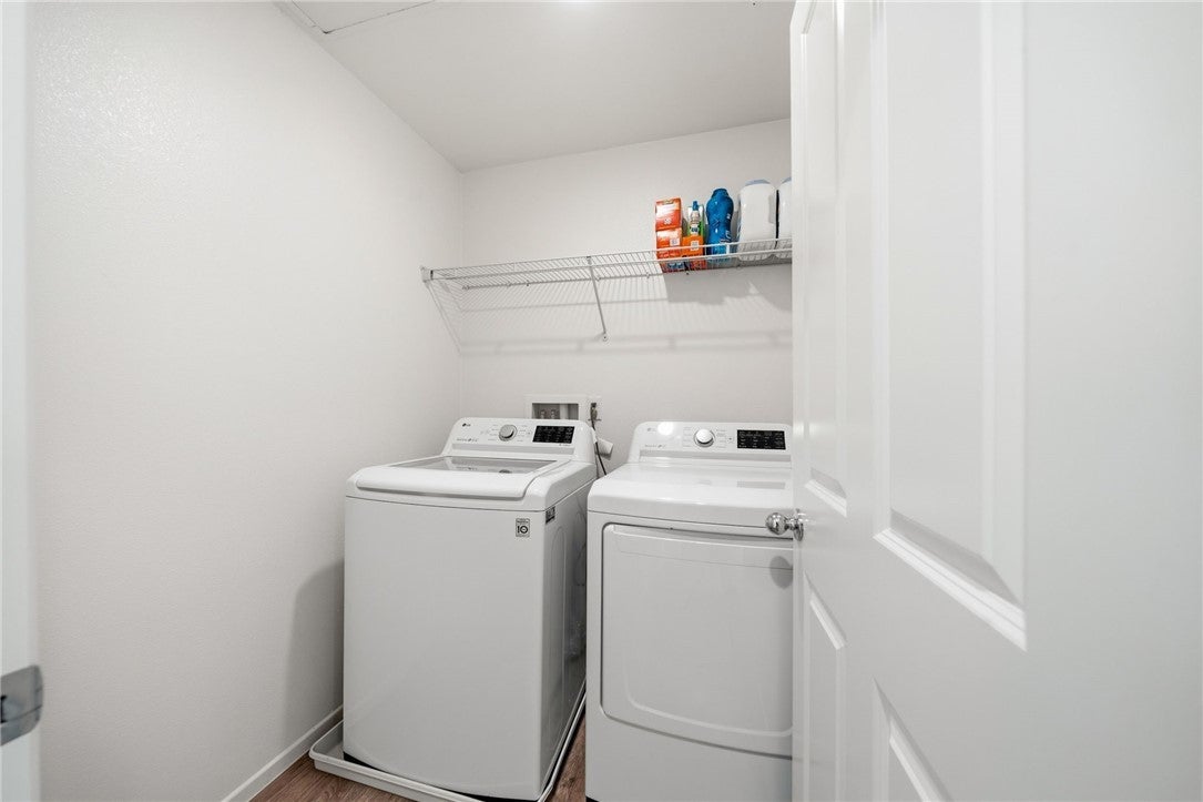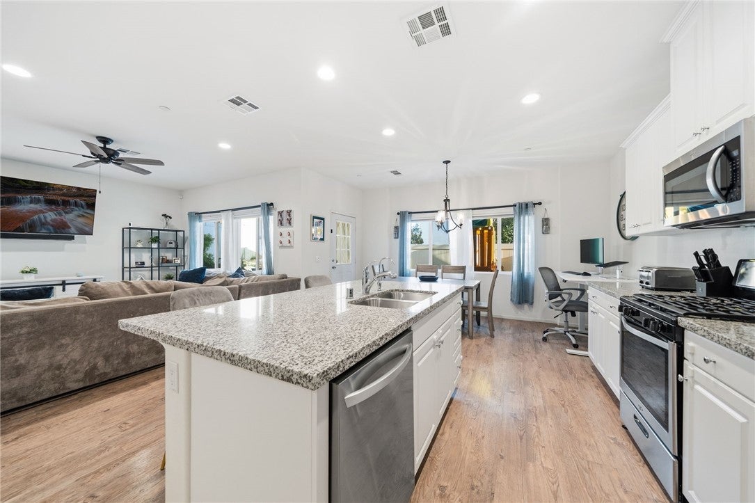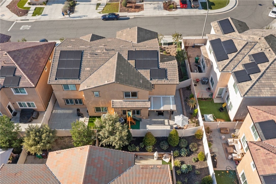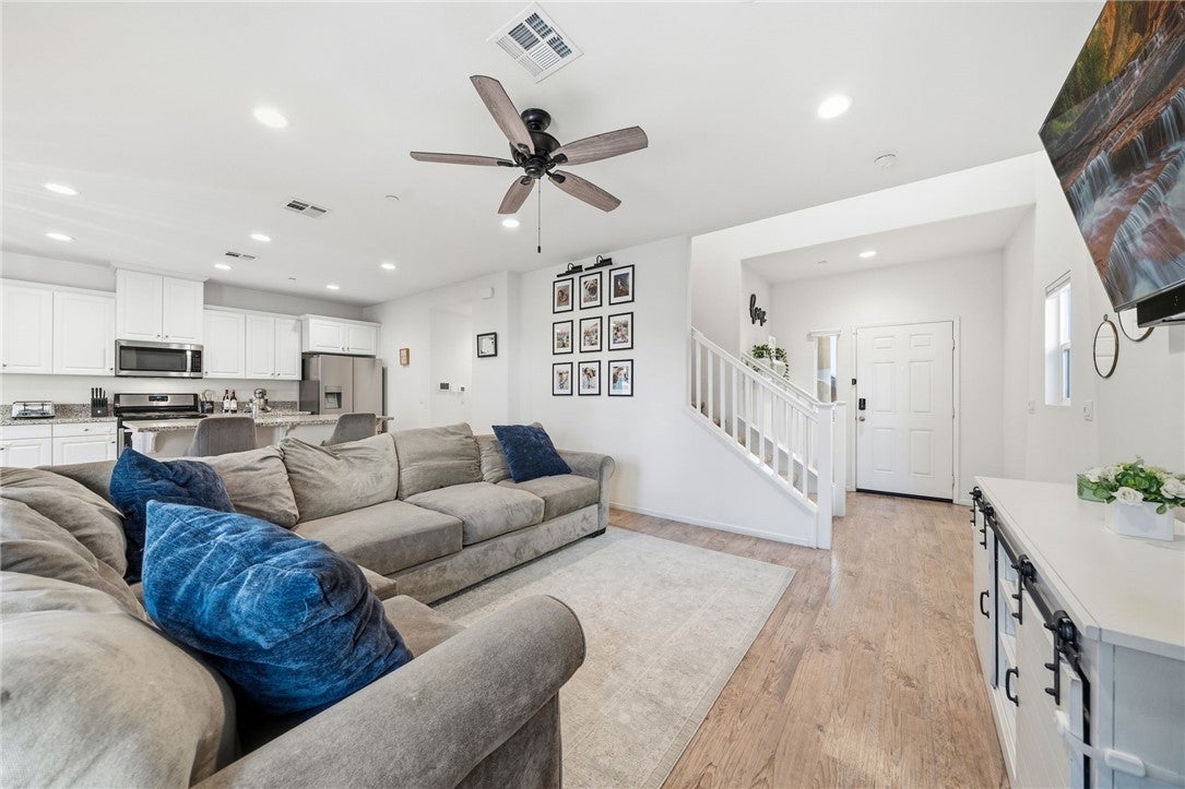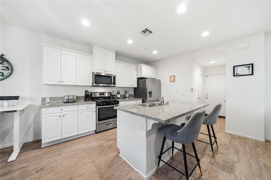 Winterberry is a beautiful end unit two story condo that truly lives and feels like a single family home. Showcasing approximately 1,728 sqft with three bedrooms, a spacious loft, two and a half bathrooms, a two car direct access garage with a rare full driveway plus a front yard and back yard. Other main property highlights include a tankless water heater, fully owned solar, a whole house fan, central AC, dual pane windows throughout plus a whole house water softener system. As soon as you walk into your new home, you will notice how light and bright the entire floorplan is. The entire downstairs portion of the home features laminate flooring. The living room is centrally located next to the chef's kitchen which has plenty of cabinetry for storage, stainless steel appliances, a stunning large island plus additional seating space in the adjacent dining room. There's also a downstairs half bath for guests as well as closet space and a pantry for storage. Upstairs a hallway connects all bedrooms as well as the large loft. The spacious primary bedroom has recessed lights, a ceiling fan and an ensuite primary bathroom with a walk in closet, dual sinks for the vanity and a walk in shower. The two guest bedrooms feature ceiling fans as well as sliding door closets. The upstairs hallway bathroom has a shower tub combo. Also upstairs you'll find a laundry room as well as a closet for storage. The wraparound backyard has plenty of space to entertain with a patio cover installed with an outdoor fan for those summer nights. There is also a garden bed on the side of the house for those who enjoy to garden. Located just down the street is the Santa Rosa Highlands community pool, kid's splash pool, playground, outdoor bbq area as well as a community clubhouse that is used to host events. Centrally located in Murrieta with nearby parks, shopping centers, Old Town Murrieta and great schools.