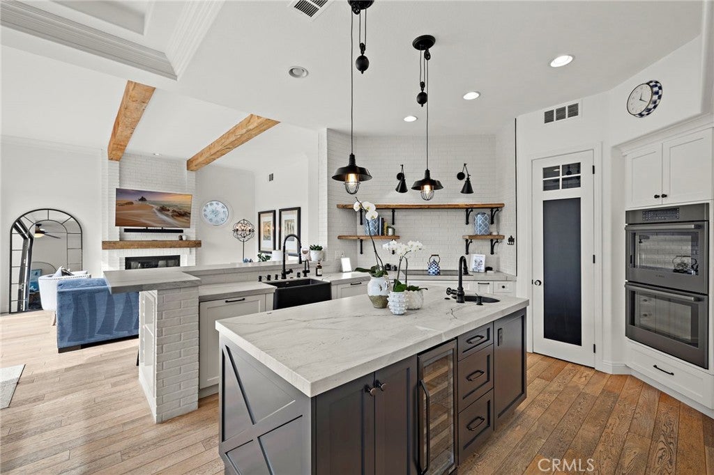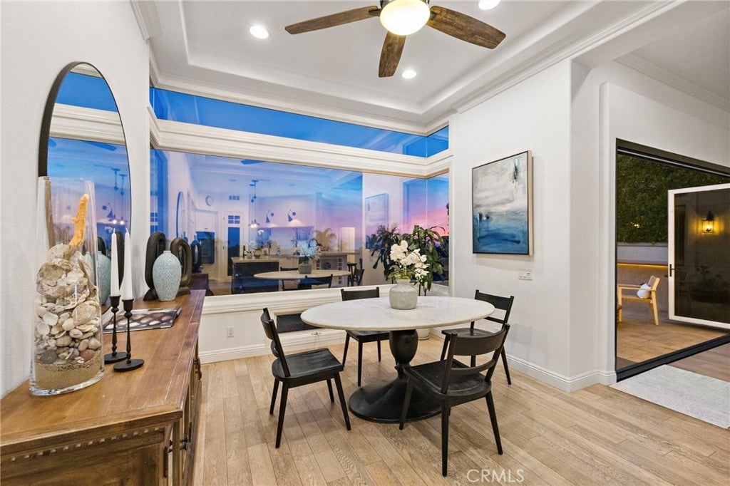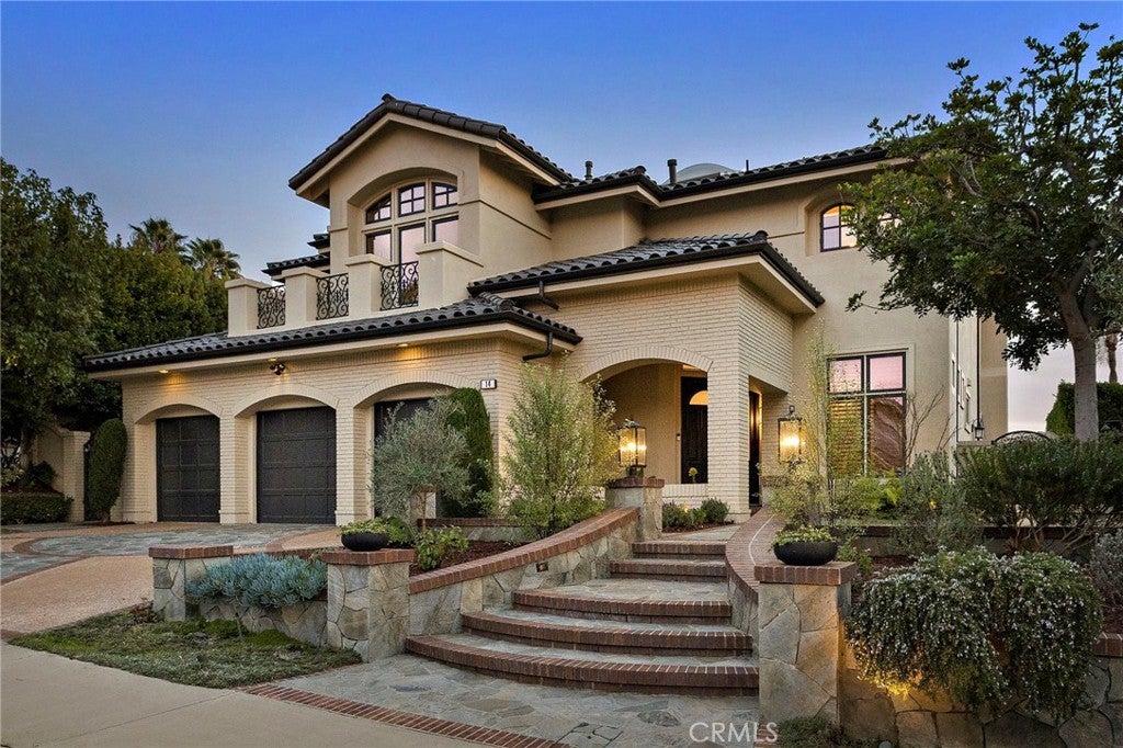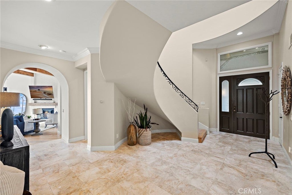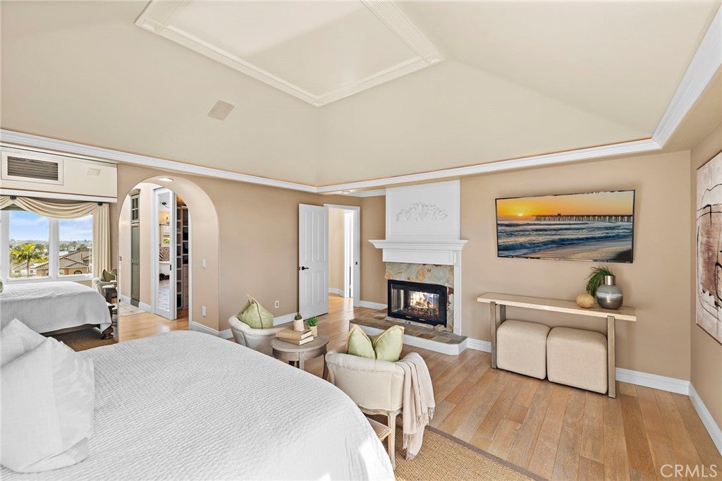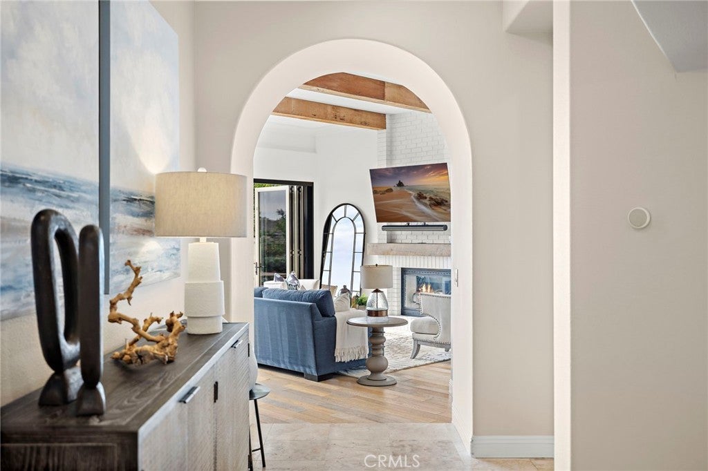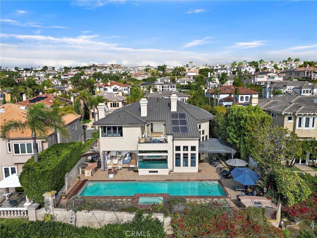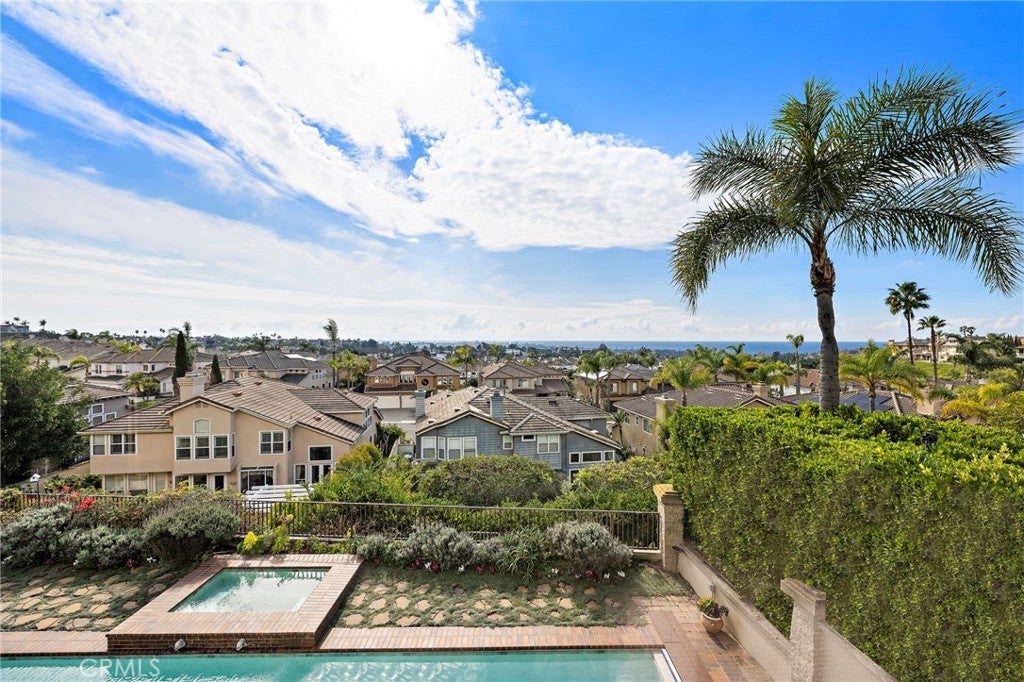 Positioned behind the gates of Ocean Ranch, this coastal residence captures EXPANSIVE OCEAN & SUNSET VIEWS (photos do not do justice) from Both First and Second Floors. Stone flooring introduces the entry, transitioning to vintage oak floors that continue throughout both levels of the home. The kitchen features custom cabinetry, Mont Blanc leathered quartzite countertops, reclaimed wood shelving, and a generous island. High-end appliances include double Bosch dishwashers, Bosch double ovens, a Dacor induction cooktop and refrigerator, wine storage, and a walk-in pantry. The kitchen opens to both the family room and a large adjacent breakfast nook, featuring an expansive picture window with glass-to-glass panel connections that frame the ocean view. The family room is anchored by a fireplace, reclaimed ceiling wood beams, and LaCantina bifold doors, creating an indoor-outdoor connection. The main level also includes a guest bedroom with en-suite bath, built-out library or home office, formal living and dining rooms, a powder bath with Venetian plaster, and a well-equipped laundry room with utility sink and laundry chute. Upstairs, the primary suite enjoys elevated ocean and San Clemente Island views and shares a double-sided fireplace with an adjacent office or retreat. The office/retreat features French doors that open to a sizable deck with spectacular ocean views. The primary bath includes a soaking tub, walk-in shower, imported Italian tile, dual vanities, and 2-spacious walk-in closets with custom organizers. Two additional guest bedrooms each offer en-suite baths. The backyard is designed for both entertaining and everyday enjoyment, with a saltwater pool and spa, waterfall feature, fire pit, built-in BBQ, separate bar, outdoor shower, and an inviting pergola with integrated lighting. Mature landscaping and ocean breezes complete the setting. Additional features include paid for solar panels, epoxy-coated plumbing, a low-water irrigation system. Ideally located near the harbor, beaches, and award-winning schools.
