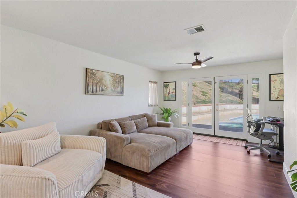 Gorgeous 4 bed, 2 bath pool home is ready for it's next owner and offers great curb appeal, sitting on a cul-de-sac street with large gated front courtyard to enjoy, and Solar Panels! The interior is open and spacious featuring high ceilings, recessed lights, white paint and wood look-vinyl flooring throughout! Enter into the living room and dining area with lots of natural light. The separate family room sits just off of the kitchen and offers a cozy fireplace to enjoy, and there is a sunroom, or could be a breakfast nook or office. The updated kitchen features a center island with bar seating, granite countertops, white cabinetry, and stainless steel appliances including the oven and microwave. All 4 bedrooms are generously sized with the large primary bedroom offering double glass doors to the backyard and a private bathroom with dual sink vanity. There is also a full-size hall bathroom for the secondary bedrooms to share, both bathrooms have been nicely updated, and a laundry room with additional storage completes the first floor. Upstairs you will find a bonus room with private entry exterior entry, great for guests! Enjoy the private in ground pool and spa, there is also a large grass side yard and gorgeous mountain views! Conveniently located near schools, shopping, dining, and No HOA! Schedule your tour today!