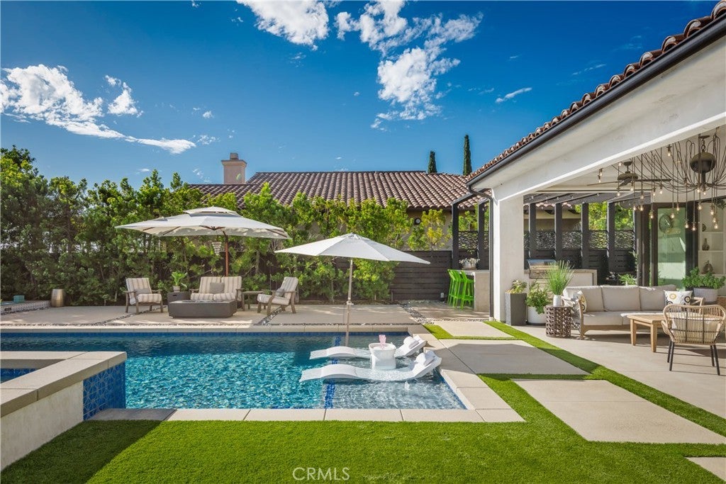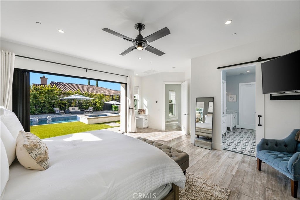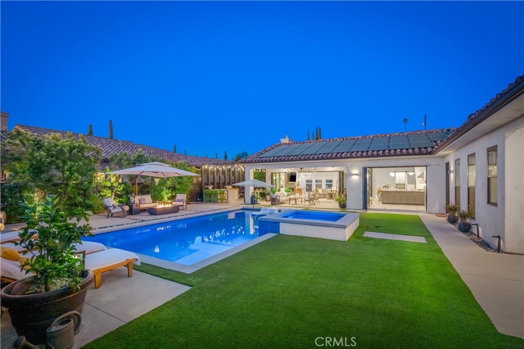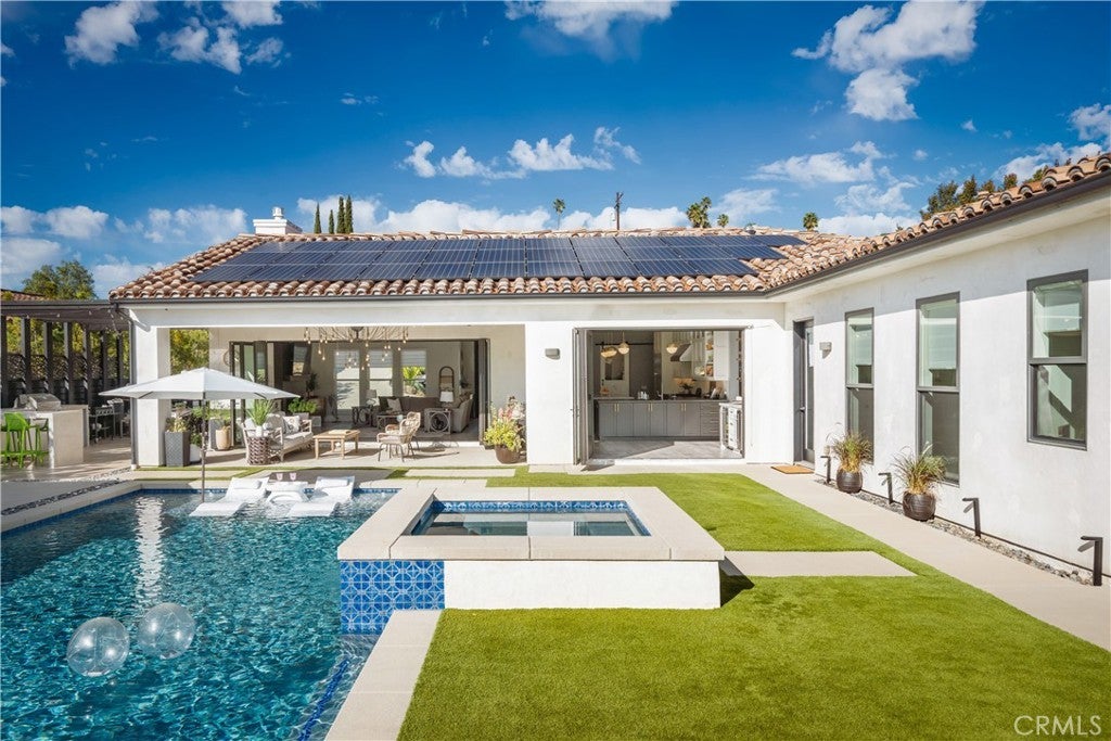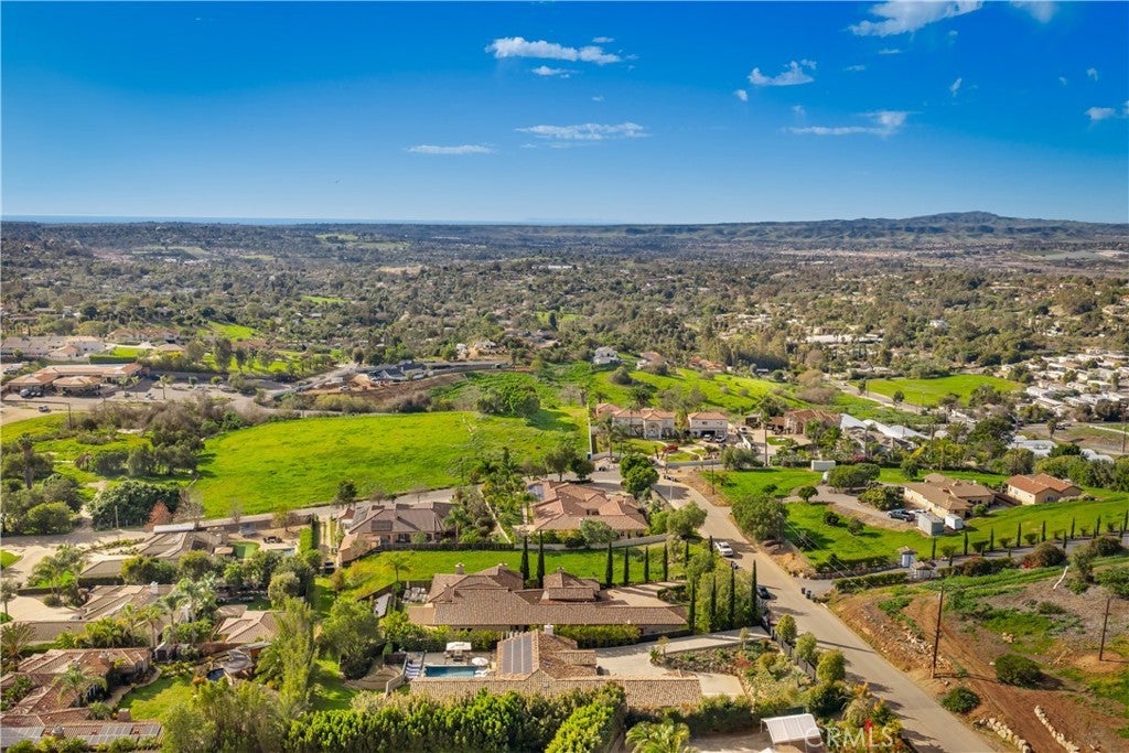 Located in the foothills of Vista, this exceptional fully custom, single-story Spanish-Modern estate is a true showplace, offering rare privacy, space, and turnkey living. Set behind a private gated entry on a fully usable half-acre, this estate-style property delivers the kind of single-level lifestyle that is increasingly difficult to find in North County San Diego. Designed for seamless indoor-outdoor living, the home features five bedrooms and four bathrooms with an open-concept great room layout. Approximately 40 feet of expansive modular glass doors open from the great room, dining area, and primary suite to covered patios and a resort-style backyard, creating effortless flow for everyday living and entertaining. The chef’s kitchen is fully custom with soft-close cabinetry, pull-out drawers, a 12-foot island, dual sinks, and a professional Thermador appliance suite. A walk-in pantry with custom shelving and barn door adds both style and functionality. The spacious primary suite serves as a private retreat with direct access to the pool and spa through a glass bi-fold door, electric privacy shade, and a barn door separating the bedroom from the spa-inspired bath. The primary bathroom features a freestanding soaking tub, marble shower, and custom cabinetry. Interior finishes throughout include hardwood flooring, built-in cabinetry, a modern glass fireplace with vintage timber mantel, Hunter Douglas Roman blinds, and cohesive matte black and brass hardware. Outdoor living is equally impressive, with a resort-style pool featuring a Baja shelf, spa, covered patio with decorative chandelier, and a fully developed outdoor kitchen with built-in BBQ. The backyard offers a quiet, private environment designed for entertaining without close neighbor proximity. Additional highlights include paid-off solar (33 panels), dual HVAC systems, tankless water heater, whole-house central vacuum, integrated interior/exterior audio, private gate with call box connected to cell phone, oversized three-car garage with attic storage, RV parking option, and an expansive driveway accommodating up to nine vehicles. A rare opportunity to own a fully custom, single-story estate combining craftsmanship, lifestyle, and privacy—without compromise.