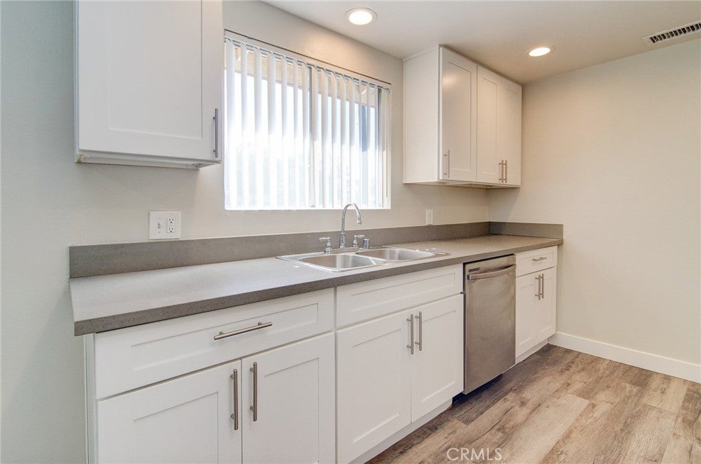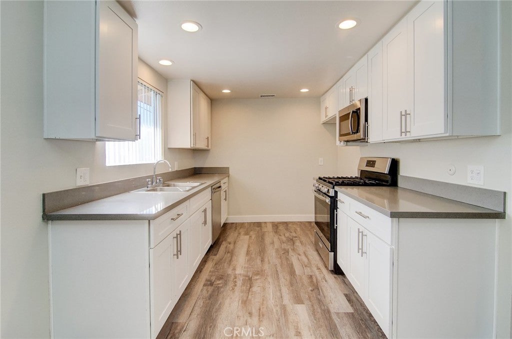 Excellent opportunity to own a single-story, ground-level 2-bedroom, 2-bath home with no units above or below. This spacious and open residence features smooth ceilings and wood-tone luxury vinyl plank flooring throughout. The expansive family room offers warmth and charm with a cozy fireplace and direct access to a large private patio complete with a concrete slab and planter beds. The light and bright kitchen showcases crisp white shaker cabinets, stone countertops, and stainless steel appliances. An inviting covered front porch adds curb appeal, while the rear patio provides the perfect setting for outdoor dining and gardening. Community amenities include an enclosed garage, landscaped walkways and lawns, and a sparkling pool with a recreation room featuring a full kitchen. Ideally located near the 55 freeway and Orange Fair Mall, with convenient shopping and dining options including Trader Joe’s, HomeGoods, and CVS.