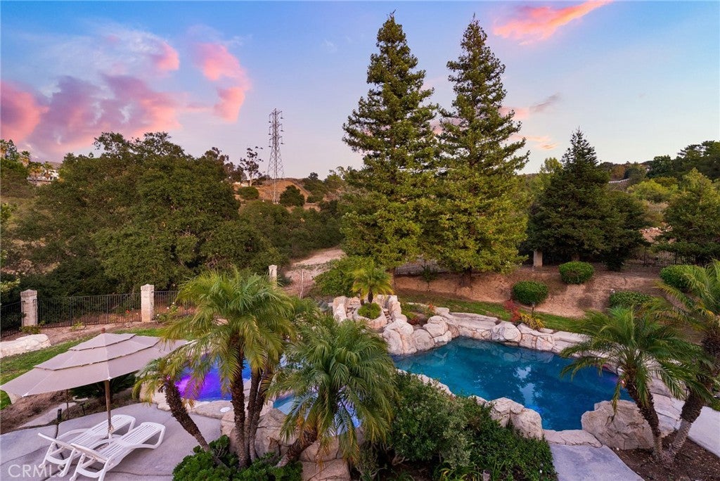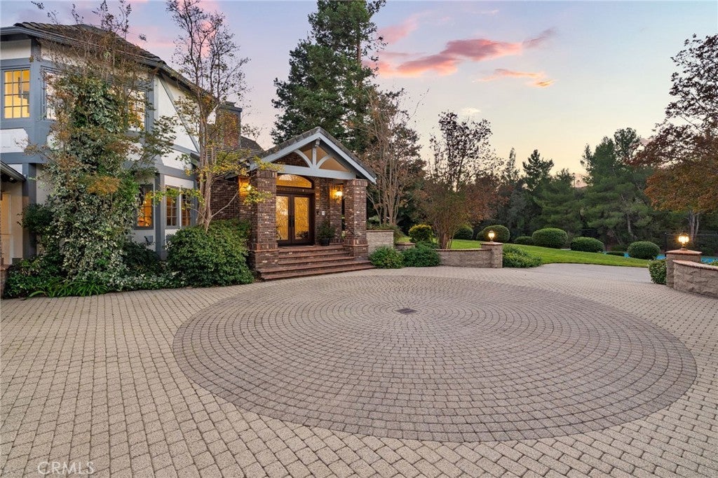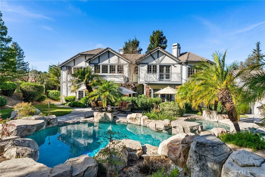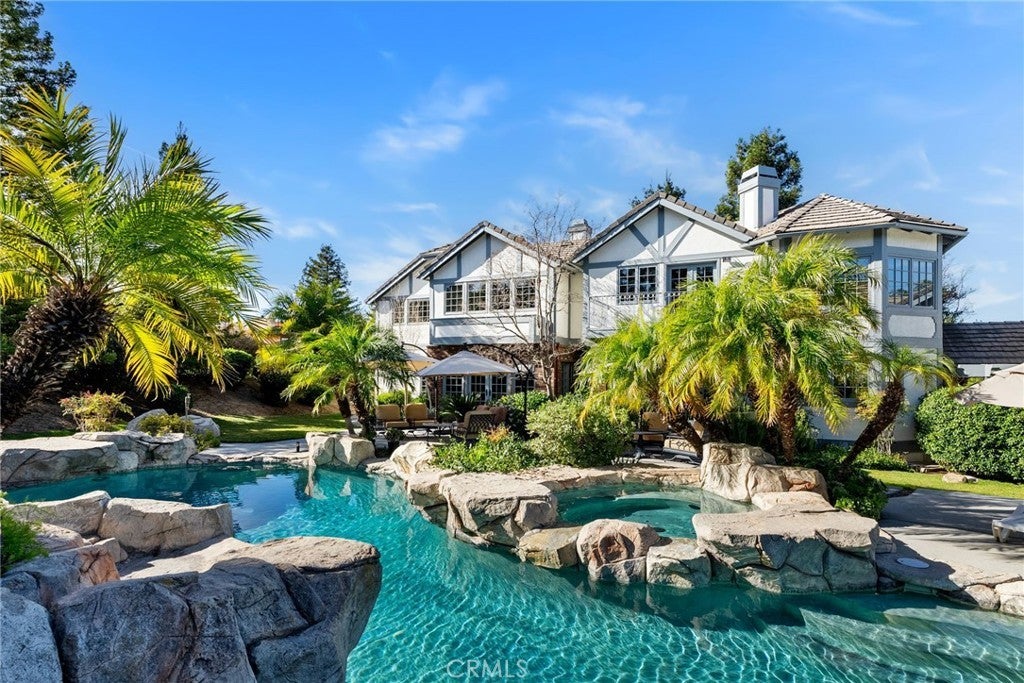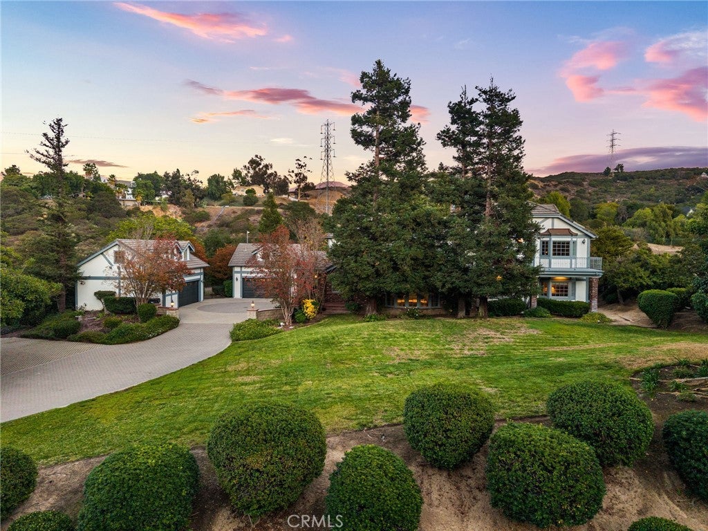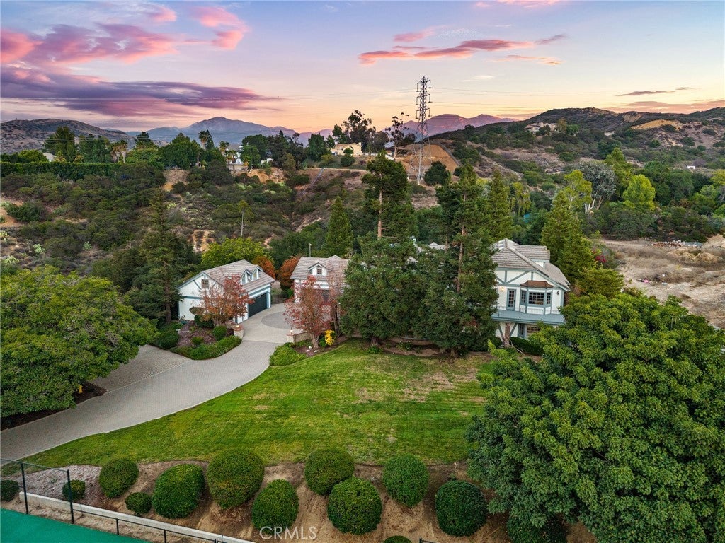 Nestled in scenic Santiago Canyon on an impressive custom estate, this 2-acre compound is a private oasis of luxury and leisure, complete with its own full-size tennis court (can accommodate pickle or paddle) and a resort-caliber pool and spa. The long cobblestone driveway winds through manicured grounds to reveal an expansive residence of approximately 6,785 square feet, boasting 5 spacious bedrooms, 5.5 baths, and garage space for 4 cars with overhead bonus rooms suitable for guest quarters, office space, or a gym. Greeted by grand double doors that open to soaring interiors adorned with polished granite flooring, exquisite crown molding, and newly installed custom front entry doors and several new Pella windows that flood the home with natural light. Multiple fireplaces warm the elegant, formal living and dining rooms, perfect for entertaining, while a cozy breakfast nook and a dedicated executive office add comfort and convenience. The gourmet kitchen is a chef’s dream, centered around a unique pentagon-shaped island with a built-in grill, plus high-end appliances including a built-in refrigerator and double ovens. Modern amenities ensure effortless living, from instant hot water to a premium water filtration system. For recreation and relaxation, the estate features a generous media room, an ample wet bar, and a generous game room designed for family connection. A main-level guest suite provides flexibility for family or possibly a main-floor primary conversion. Upstairs, the lavish primary suite indulges with a private wet bar, a jetted spa tub, dual vanities, and dual walk-in closets, plus views over the estate. Outdoors, enjoy your own private paradise: a full-size tennis court for sports enthusiasts and an awe-inspiring custom rock pool with spa that rivals a luxury resort, creating a serene setting for relaxation and grand gatherings. Additional enhancements include a wired security system, an intercom, a privacy gate, and approximately 10,000 sq ft of open space ready for a guest house, extra amenities, or anything you can imagine. This exceptional compound is priced to sell, offering an unparalleled blend of luxury, privacy, and endless potential, an ideal canvas for the discerning homeowner to reimagine into their personalized dream estate.