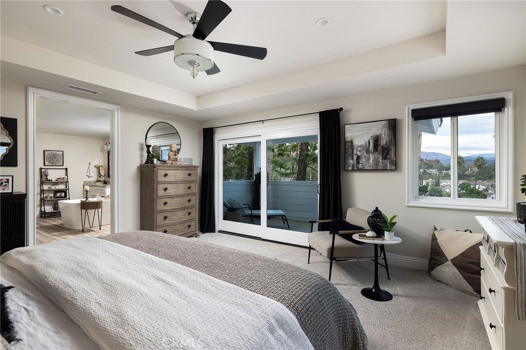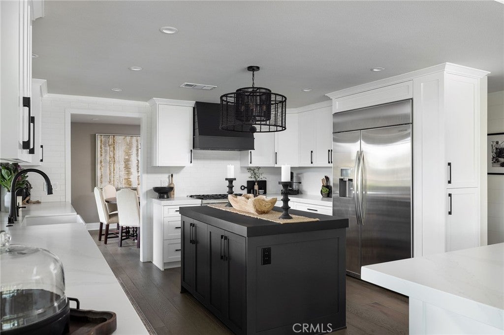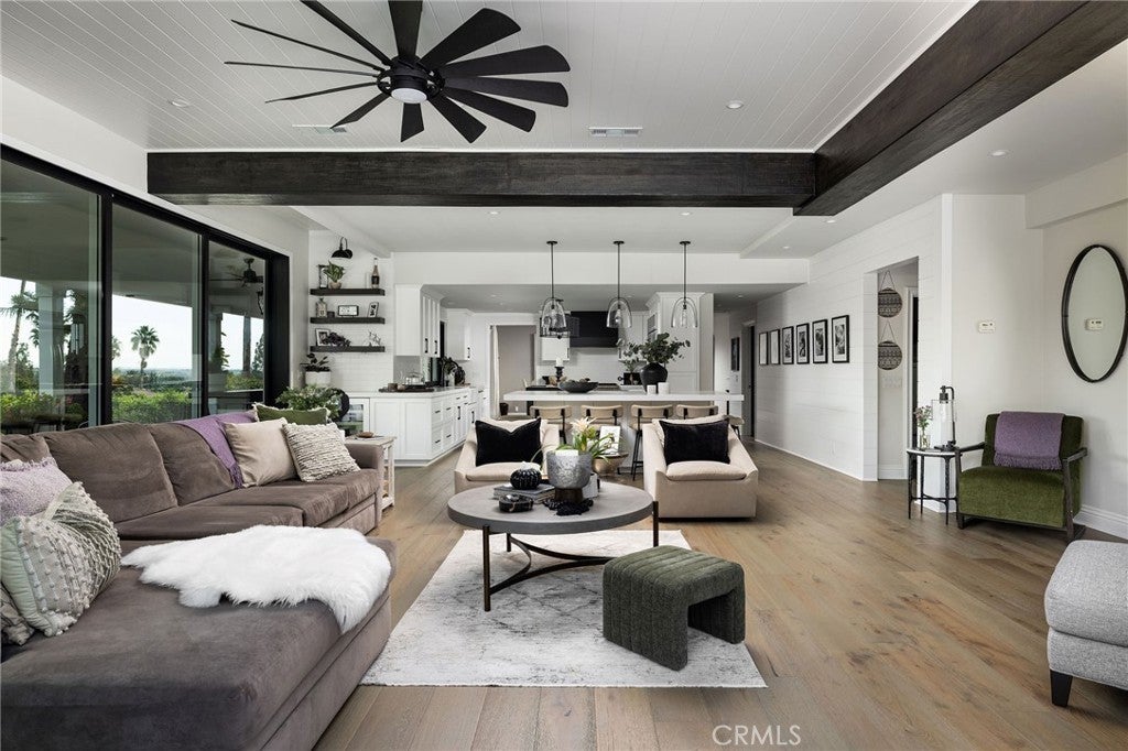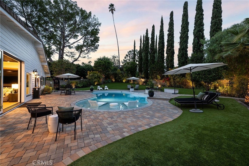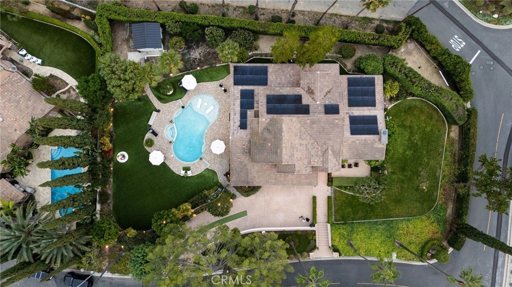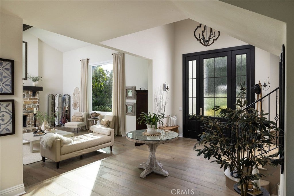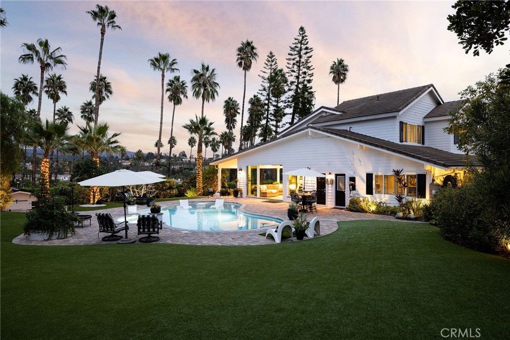 Perched on the corner of Valhalla and embraced by tranquil neighborhood and mountain views—with the Tustin Hills Racquet Club just a short walk away—this custom estate artfully combines modern luxury with effortless indoor–outdoor living across an expansive 26,000 sq. ft. lot, enhanced by mature landscaping and multiple producing fruit trees. Thoughtfully upgraded throughout, the 4,500 sq. ft. residence offers 5 bedrooms, 6 bathrooms, and a dramatic entry that introduces formal living and dining areas enhanced by soaring ceilings, a 10-ft custom front door, and a striking 6-ft stone fireplace. The main level also features a private in-law suite complete with its own bath and kitchenette, ideal for guests or multigenerational living. The recently reimagined chef’s kitchen anchors the home, showcasing dual Thermador gas ranges and ovens, Sub-Zero refrigeration, beverage and wine stations, a nugget ice maker, and dual islands—including an 8-ft seating island—alongside a generous walk-in pantry. This culinary space flows seamlessly into a spacious great room highlighted by more than 45 feet of La Cantina stackable doors, creating a dramatic indoor–outdoor connection to the resort-style backyard. Designed for year-round enjoyment, the outdoor grounds feature a newly built pool and spa with lounge shelf, expansive artificial turf, multiple dining and relaxation areas, a gas firepit, and a covered California room appointed with heaters, ceiling fans, an outdoor kitchen, and a wet bar—set within a private, garden-like setting accented by mature fruit trees. Additional enhancements include an epoxy-finished 3-car garage, matching designer shed, upgraded lighting and irrigation systems, fully concealed pool equipment with dedicated storage, and a 49-panel Tesla solar array with battery backup. Upstairs, a sweeping staircase leads to a loft, guest suite, and a serene primary retreat complete with a private balcony, oversized shower, soaking tub, and walk-in closet. With the potential to add a 1,000 sq. ft. ADU, this turnkey estate offers exceptional space, privacy, and the very best of year-round California living.