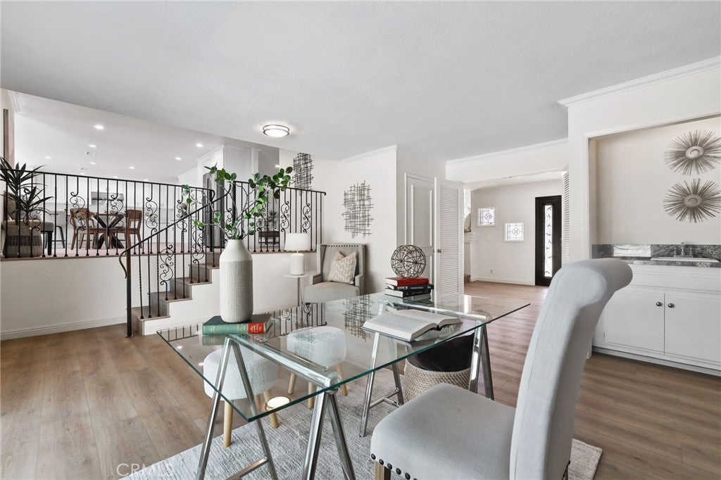 Welcome to this beautifully remodeled home where timeless architecture meets contemporary elegance. Set on a spacious half-acre corner lot, this property not only offers incredible privacy and curb appeal but also presents a fantastic opportunity for an ADU, guest house, or future expansion. Step through the custom wrought-iron double doors into a bright, airy interior featuring wide luxury vinyl plank flooring, designer finishes, and modern railings that enhance the open layout. The split-level design offers multiple living spaces filled with natural light, perfect for both everyday living and entertaining. The chef-inspired kitchen showcases white shaker cabinetry, quartz countertops, stainless-steel appliances, and an expansive island that flows seamlessly into the dining and family areas. Just off the main living area, a dedicated office with sliding glass doors opens to the patio, ideal for working from home. A guest bedroom and full bath downstairs provide comfort and flexibility for visiting family or multi-generational living. Upstairs, the primary suite is a tranquil retreat featuring a spacious layout and a luxurious ensuite bath with dual vanities and a freestanding clawfoot tub. Three additional guest bedrooms and another full bath complete the upper level. The backyard is an entertainer’s dream, expansive, private, and low-maintenance, with multiple zones for outdoor dining, lounging, and play. There’s also ample parking space for an RV, boat, or additional vehicles, further enhancing the property’s versatility. Located in a serene, desirable neighborhood, this home combines style, space, and exceptional potential, all move-in ready and waiting for its next chapter.