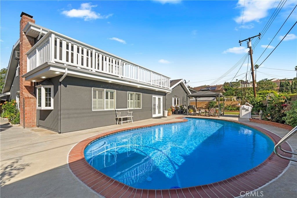 Located at the end of a quiet, private cul-de-sac, this remarkable home is more than just a place to live-it’s a place where memories are made. Behind an iron gate and lush landscaping, you’re welcomed into a warm and spacious residence designed for comfort and flexibility. With 4 bedrooms, a den, and a utility/craft room, this home effortlessly adapts to the needs of a growing or multi-generational family—whether you’re working from home, hosting guests, or creating spaces for hobbies. The double-door entry with decorative leaded glass opens to a gracious formal foyer, setting the tone for the thoughtful details such as plantation shutters and crown molding throughout. Cozy living room with a fireplace and bay window, while the large den with a built-in desk and storage is ideal for a home office or study space. The expansive family room, with double French doors, seamlessly connects indoor living to the backyard—perfect for entertaining or everyday family time. At the heart of the home, the kitchen is both functional and beautiful, featuring a coffered ceiling with recessed lighting, abundant cabinetry, quality appliances, a central island, and a bay window overlooking the backyard—making meal prep a joy and gatherings effortless. The adjacent dining area and conveniently located laundry space keep daily life organized and flowing. The main-level primary suite offers a true retreat with natural light, ample closet space, and an upgraded ensuite bathroom featuring granite countertops and a glass-enclosed walk-in shower. Thoughtful storage continues throughout the home, including hallway cabinetry and attic access. Upstairs, two additional rooms offer exceptional versatility. One is a spacious bedroom with its own bathroom and walk-in closet, opening through French doors to a balcony with serene views, mature trees, and front-row seats to holiday fireworks. The second room is ideal for a craft room or a utility room. Step outside to your private backyard oasis—built for celebration and relaxation alike. Enjoy a unique half saltwater, half freshwater pool, a built-in BBQ with bar seating, a charming gazebo, and open lawn space for play and gatherings. Mature landscaping includes tangerine and lemon trees, brick ribbon planters, and discreet storage sheds. With a solar panel system, freshly painted exterior, this home offers comfort, efficiency, highly sought-after neighborhood. Homes like this don’t come along often—this is where your next chapter begins.