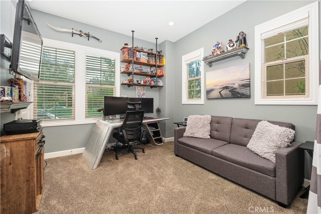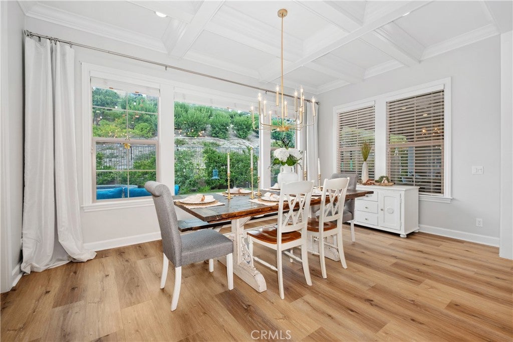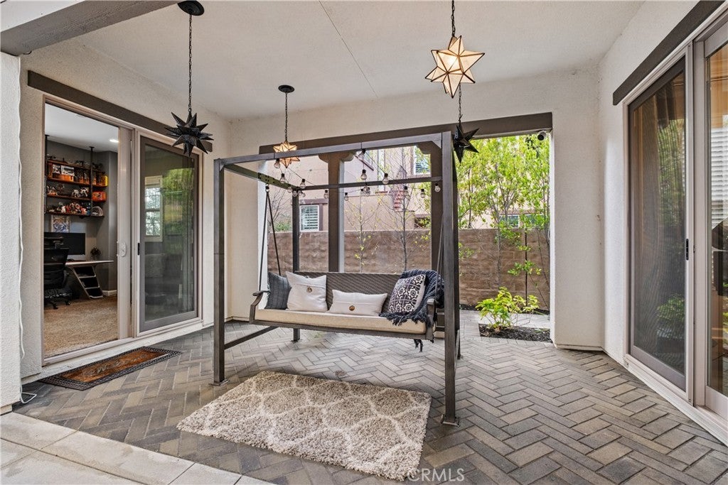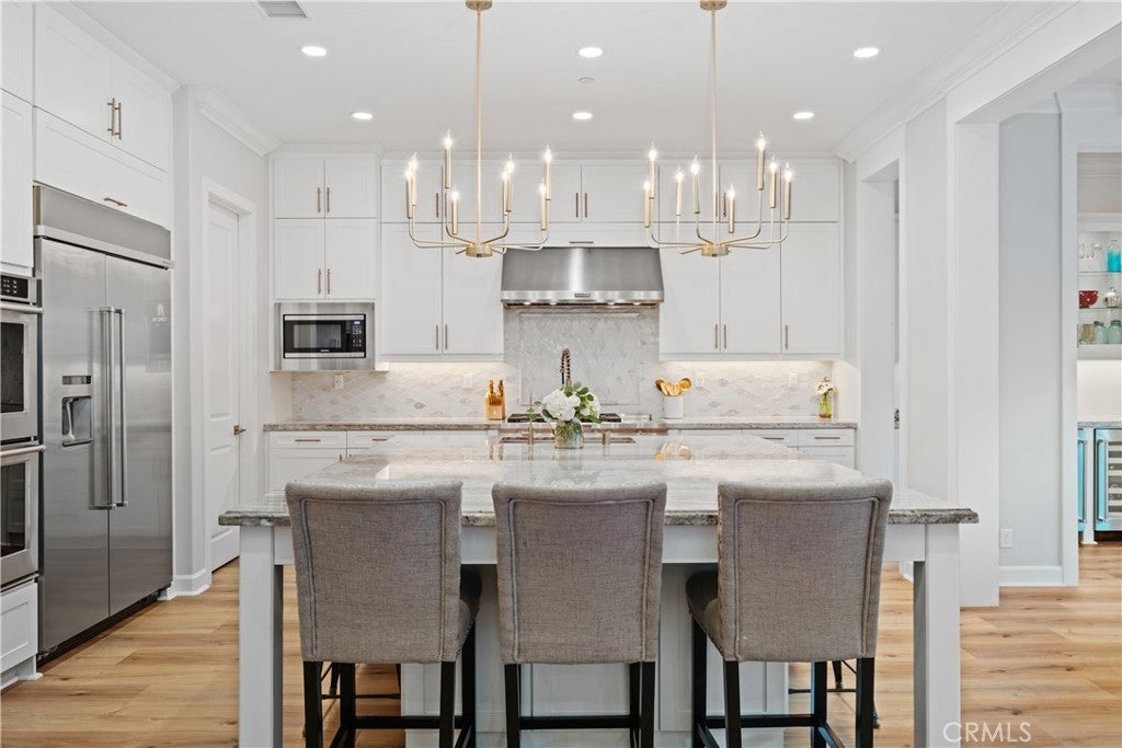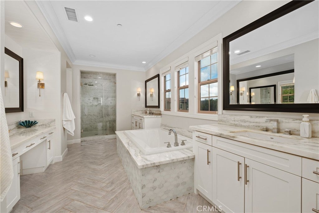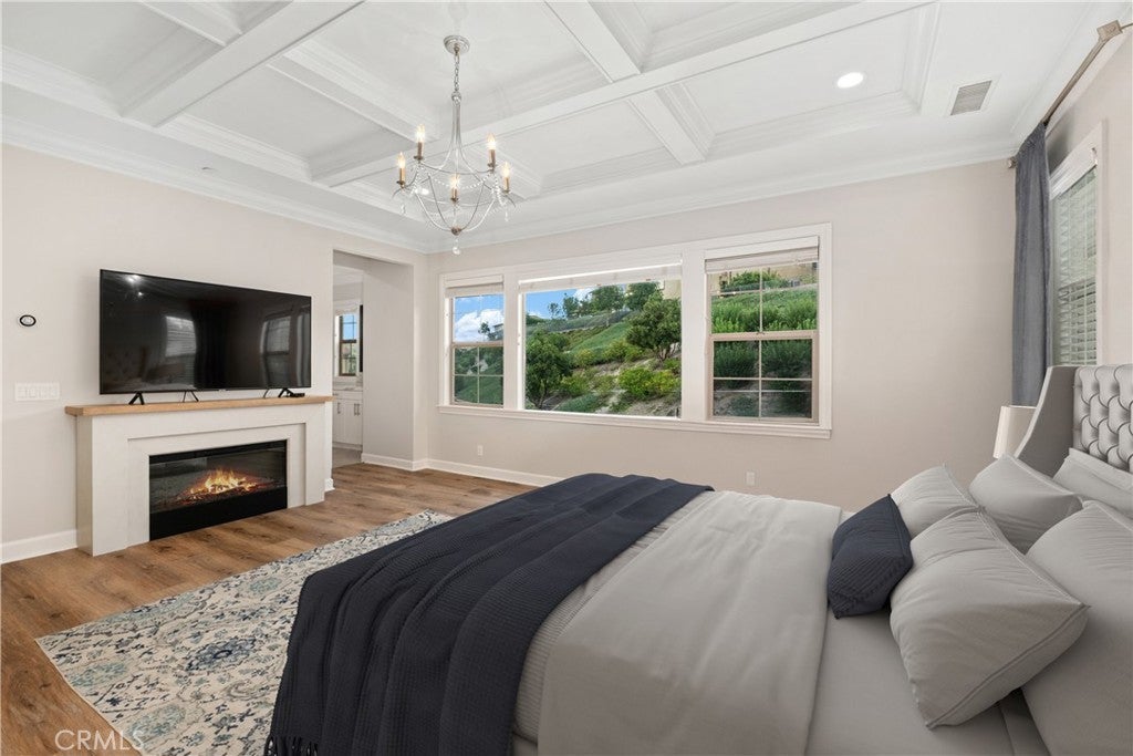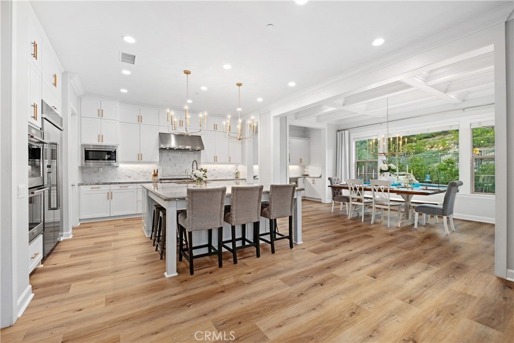 Nestled within the coveted Esencia community of Rancho Mission Viejo, this exceptional 5-bedroom, 5.5-bath Aubergine Plan 3 residence has been thoughtfully upgraded and meticulously designed. Refreshed with new exterior paint, the home offers impressive curb appeal. A charming courtyard welcomes you and separates the home from the casita, ideal as an office or guest suite with its own entrance, newer AC, and full bathroom. Inside, wainscoting frames the grand staircase and elegant foyer. Fresh interior paint and new luxury vinyl flooring on the first level create a bright, contemporary aesthetic. Every window features custom casing, complemented by 10" crown molding and dimmable smart switches. A flexible downstairs den offers endless possibilities. The open-concept living space is the heart of the home, where the kitchen seamlessly connects to the family and dining areas. The kitchen showcases white cabinetry with new champagne gold hardware, an oversized granite island, and premium stainless-steel appliances including a built-in refrigerator, double oven, 6-burner cooktop, and microwave. Coffered ceilings and new chandeliers elevate the dining area, while the extended dry bar has dual beverage refrigerators. A walk-in pantry and timeless backsplash complete the space. Stackable sliders open to a serene California room, where you can enjoy fireplaces both inside and out. The private backyard features low-maintenance turf with app-controlled sprinklers, pavers, apple trees, and a saltwater pebble tech spool with waterfall and fire pit. Upstairs, the primary suite offers beautiful views and a coffered ceiling. The upgraded bathroom includes herringbone tile flooring, marble countertops, a soaking tub, walk-in shower, and dual walk-in closets. Three additional bedrooms—two with ensuite baths—plus a hallway bath, laundry room, and bonus/movie room complete the upper level. The bonus room includes projector wiring, 5.1 surround sound, and movie screen paint creating a 115" viewing wall. Additional highlights include a 3-car garage with epoxy flooring, overhead storage, and two prewired EV outlets. The home also features two tankless water heaters and fully paid solar panels for energy efficiency. Residents enjoy top-rated schools and resort-style amenities including pools, spas, playgrounds, fitness centers, tennis and pickleball courts, bocce ball, an arcade, and more—offering an unparalleled lifestyle in one of Orange County’s most desirable communities.