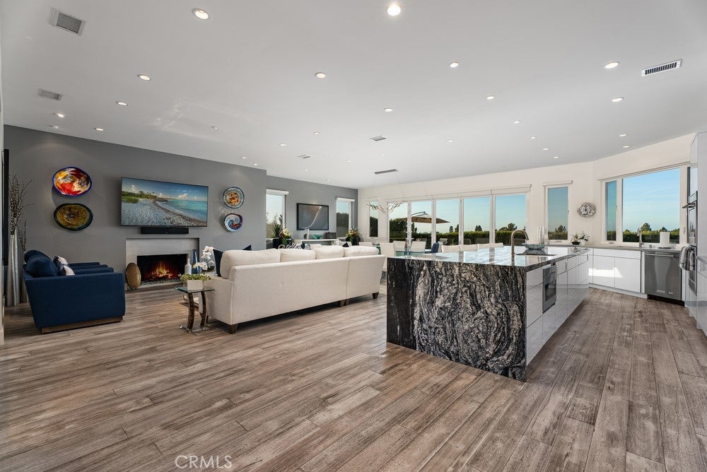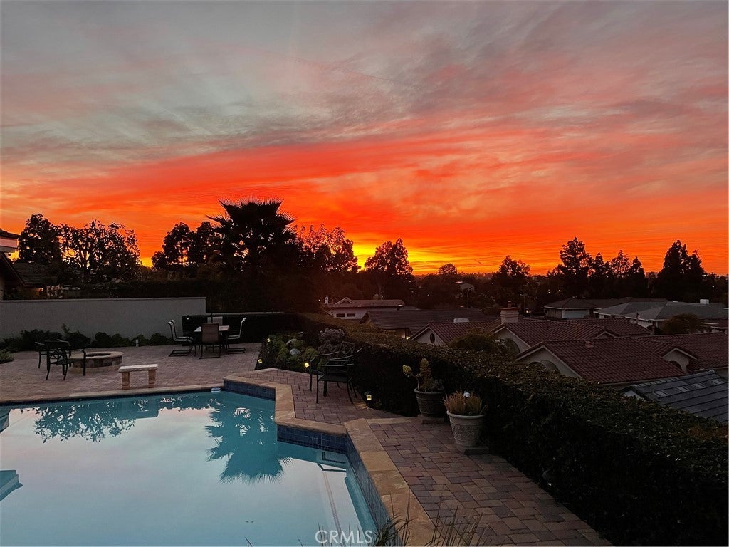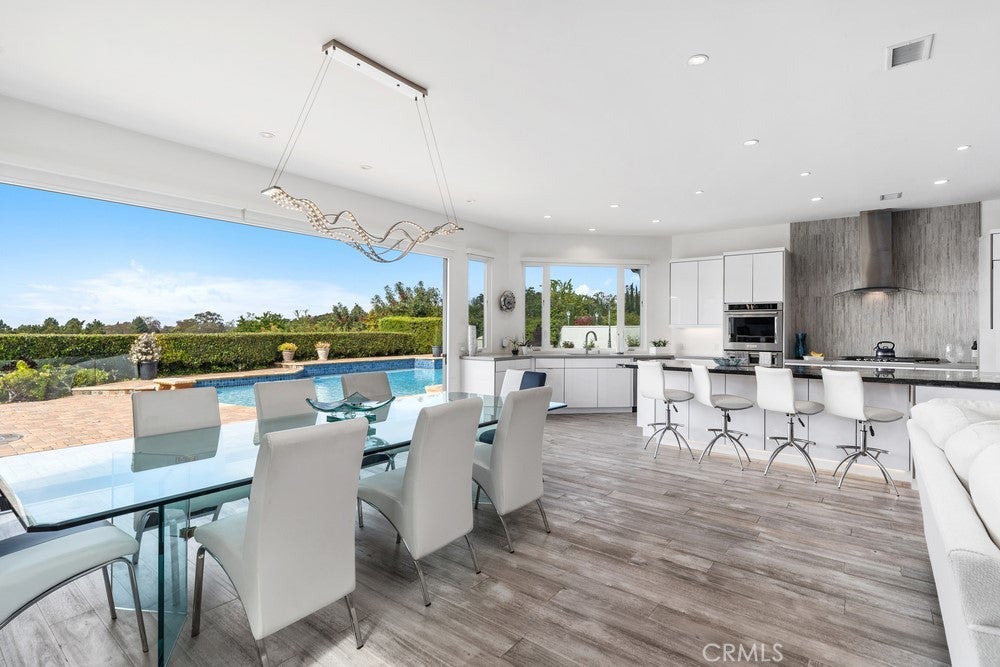 Welcome to an extraordinary custom single level modern masterpiece, perched in the coveted hills of Turtle Rock. This one-of-a-kind residence boasts gorgeous sunsets and unobstructed panoramic views, capturing the beauty of rolling hills and city lights, and even Disneyland fireworks. Radiating contemporary elegance, no detail has been overlooked in its impeccable craftsmanship designed for effortless easy-care and seamless indoor/outdoor living.This exceptionally private architectural gem was custom built in 2017, with nearly $800,000 invested at the time to elevate it to an unparalleled level of modern refinement. The moment you step inside, an awe-inspiring sense of openness greets you, as dramatic 16’ wide by 8’ high La Cantina doors dissolve the boundary between indoors and out. Additional strategically placed windows frame the stunning vistas, bathing the interiors in an abundance of natural light. At the heart of this home is an expansive great room, where soaring ceilings create an airy and inviting atmosphere. A luxurious family lounge features a sleek 75” Samsung TV, a striking contemporary fireplace, and a built-in entertaining bar complete with a wine refrigerator. The adjacent dining area is defined by a dazzling statement chandelier, setting the stage for unforgettable dinner parties against the backdrop of mesmerizing twilight views. The designer kitchen offers a stunning 14-foot-long waterfall-edge island is complemented by high-gloss white cabinetry and top-of-the-line KitchenAid appliances and sleek clean lines make this kitchen as beautiful as it is practical.The primary suite includes a private office/sitting area. The ensuite spa-inspired bathroom features floating vanities, designer lighting, and extensive use of Carrara marble-inspired finishes.A secondary en-suite bedroom continues the theme of refined modernity, with its own impeccable design and high-end finishes. Even the guest bath exudes elegance and a commitment to luxury. Revel in the resort-inspired backyard, where the expansive patio invite relaxation and entertainment alike and a sparkling pool and spa provide a serene oasis. Enjoy the seamless fusion of contemporary luxury with the great outdoors, state-of-the-art technology and awe-inspiring views. Award winning Turtle Rock Elementary & University High School are steps away. Exceptional nearby community facilities.