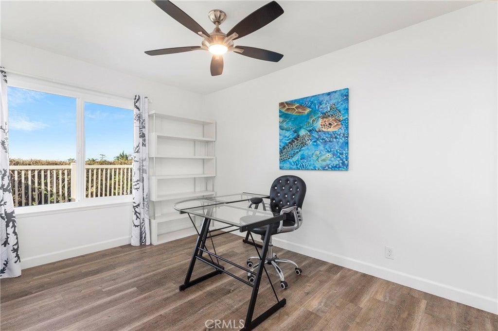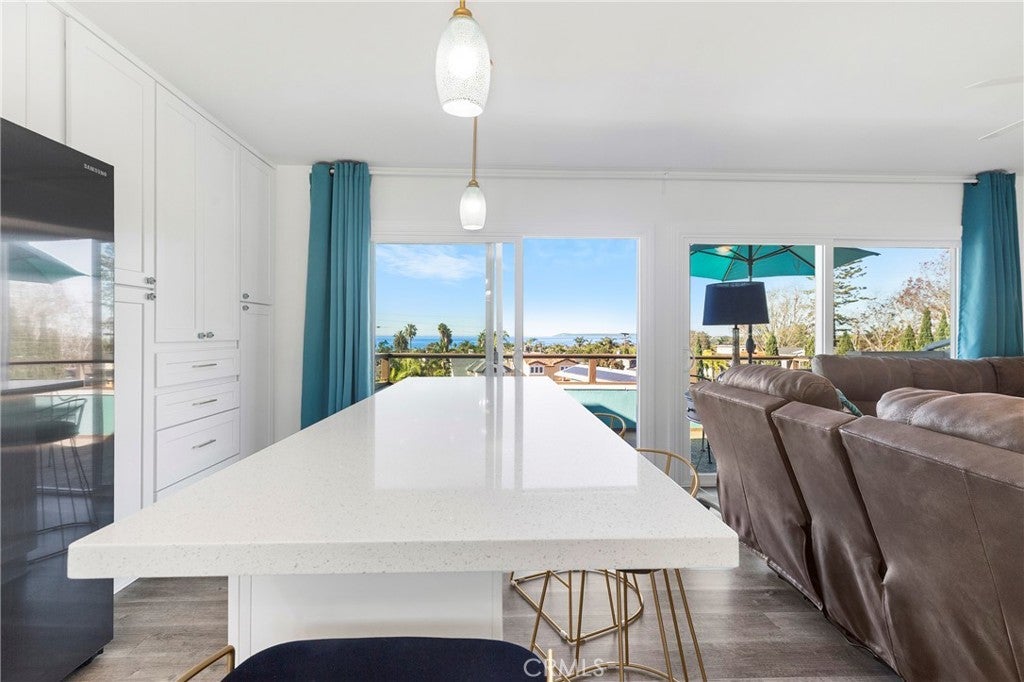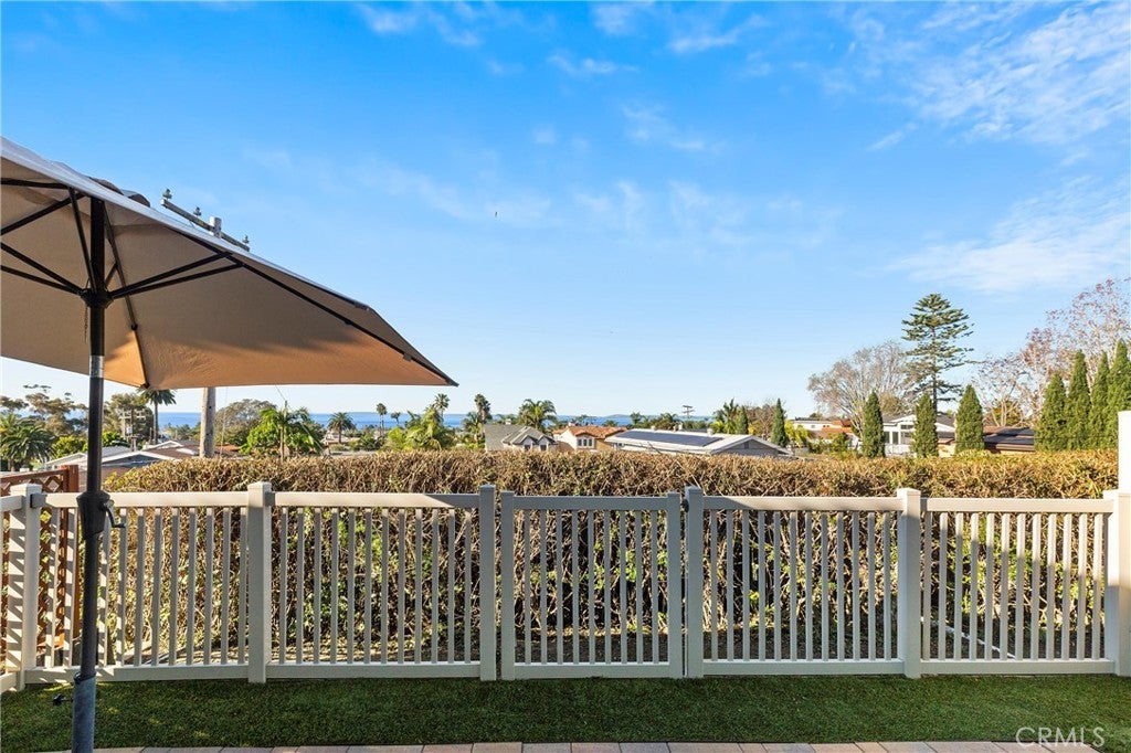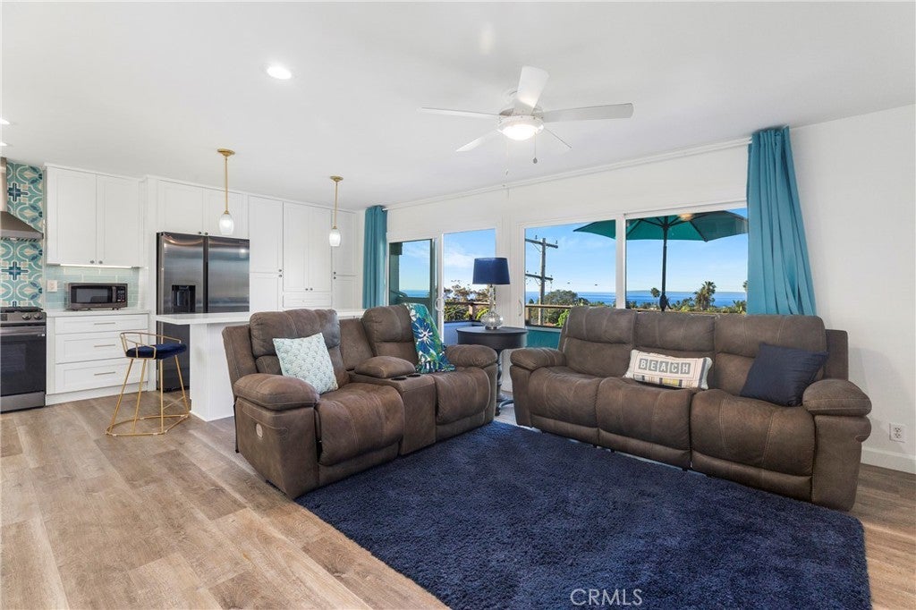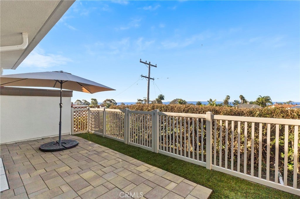 Enjoy stunning 180-degree ocean views in the Ocean Hills Community. The updated kitchen features black stainless steel appliances, gas range, white shaker cabinetry, white quartz countertops, gold fixtures and a turquoise tile backsplash. The primary ensuite offers a walk-in turquoise tiled shower with quartz countertop. The upstairs half bath features a floating vanity with a turquoise glass sink and tropical wallpaper. Luxury vinyl plank flooring runs throughout, and all rooms include ceiling fans. One of the largest paver driveways in the development accommodates 4-5 vehicles, plus a two car garage that is fully drywalled, LED lit and equipped with an insulated roll-up door. Additional features include central air conditioning and an ocean view balcony with awning and views of Catalina and San Clemente Island. Community amenities include two pools, one with amazing ocean views, (one heated year round), a nine hole golf course, renovated clubhouse, basketball court, pickle ball net, and HOA included cable TV (internet not included).