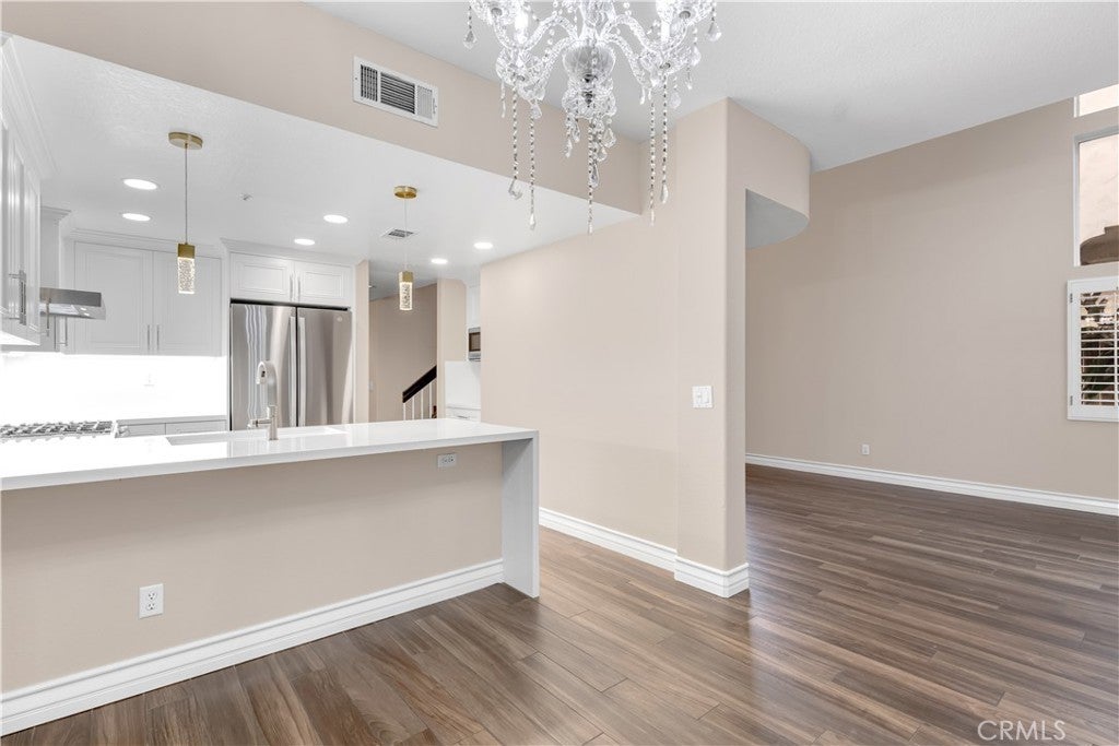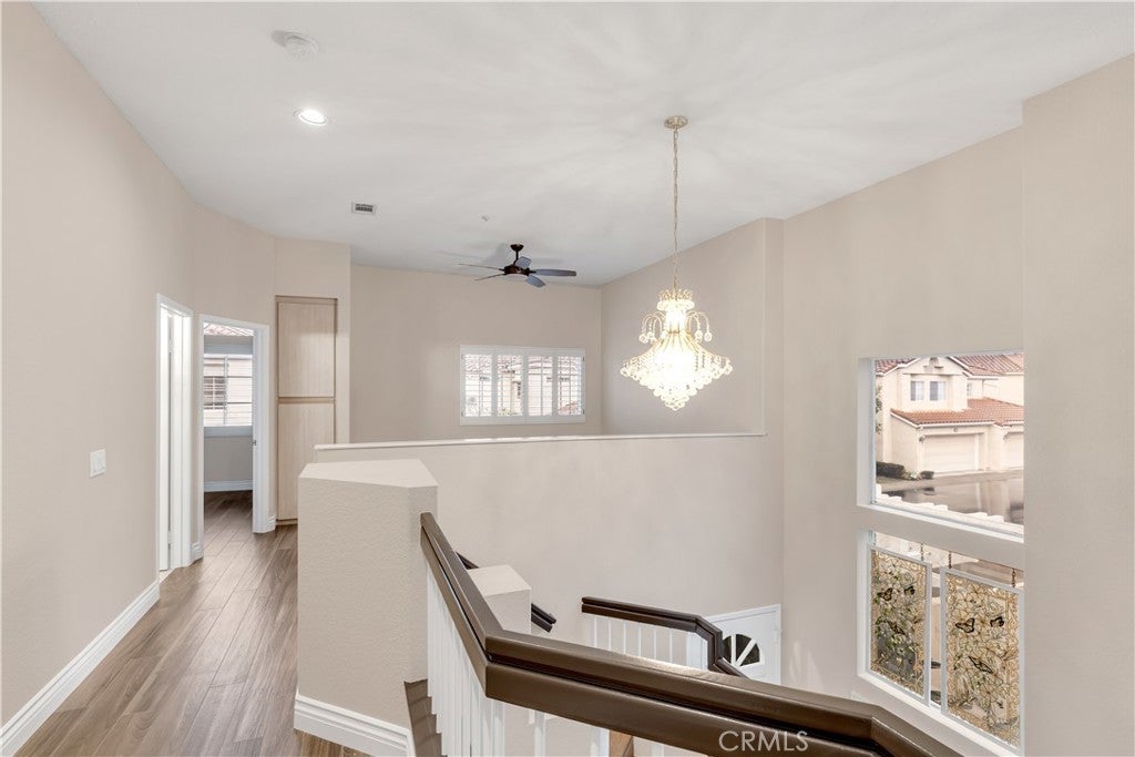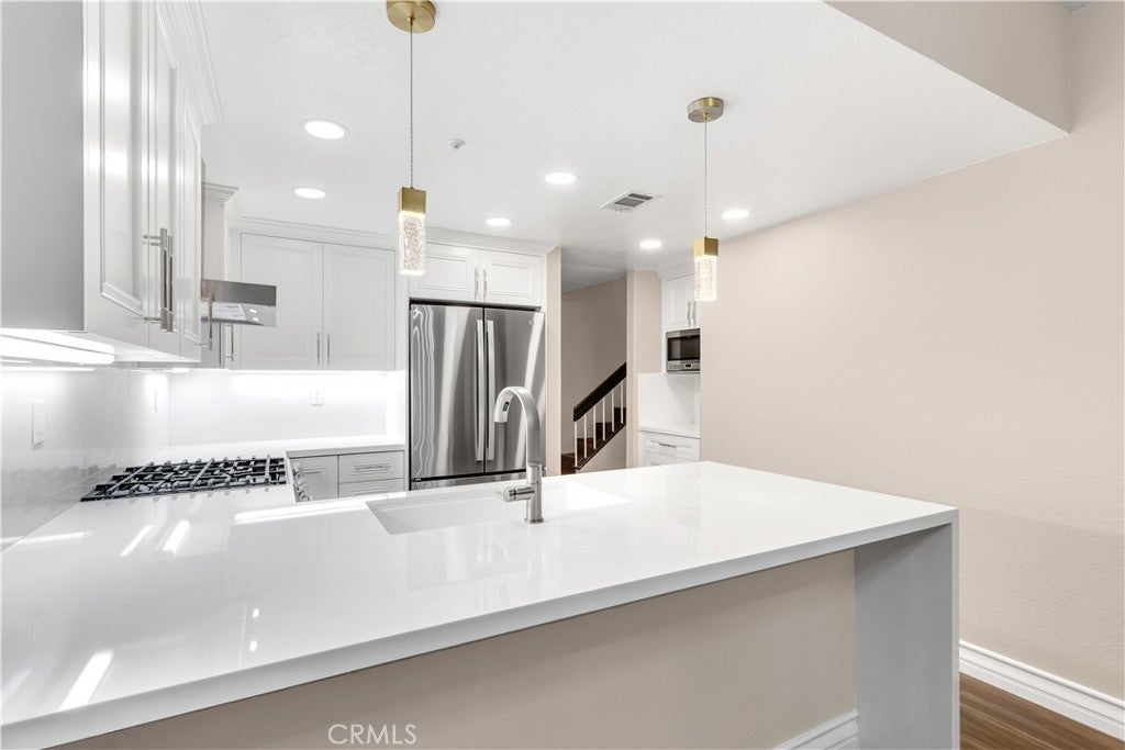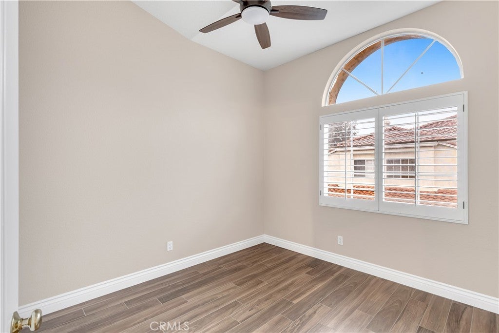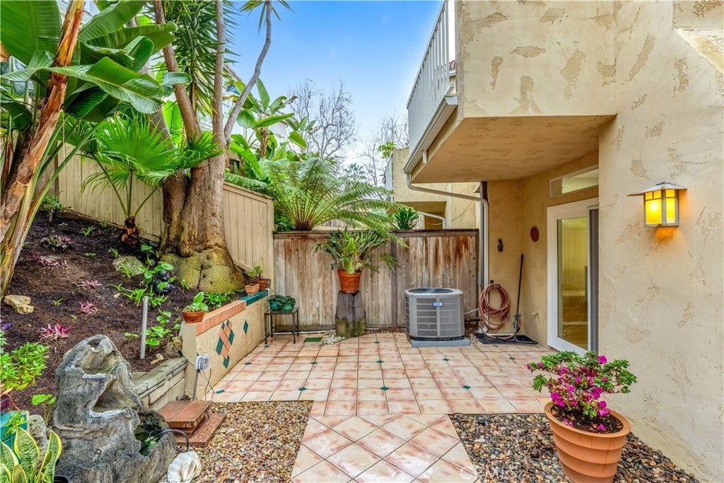 Beautifully upgraded and move in ready end unit condo featuring 1,547 sqft with two bedrooms plus a huge loft, two and a half bathrooms, a two car attached direct access garage, AC and a private spacious wraparound backyard. New interior paint just finished throughout the house in 2026. Twenty foot vaulted ceilings allow plenty of natural light throughout the downstairs living area. Italian porcelain wood style flooring is found throughout the entire house which is very easy to clean and aesthetically stunning. The kitchen was just fully renovated and finished in January 2026 and never been used. This showcase chef's kitchen has quartz countertops with a waterfall edge, custom white cabinetry, a coffee bar area, new pendant lights and a Bosch dishwasher. From the 2026 remodel the Bosch gas stove, GE fridge and a microwave all are brand new and never used. Downstairs is a half bath for guests as well as a laundry closet. Upstairs, you'll find two spacious bedrooms with ceiling fans, two full bathrooms and a large loft. The master bedroom has tile floors, an ensuite master bath, two mirrored closets, a gas fireplace and a balcony overlooking the backyard. The guest bedroom has tile floors and a spacious closet. The large loft also has tile floors. Enjoy the SoCal weather in your backyard oasis with plenty of entertaining space, new landscaping that is maintained by the landlord's gardener. HOA include an ocean view pool & spa. Nearby are hiking trails, LifeTime Fitness, shopping centers and the Rancho San Clemente Sports Park with beach volleyball, basketball courts and a playground.