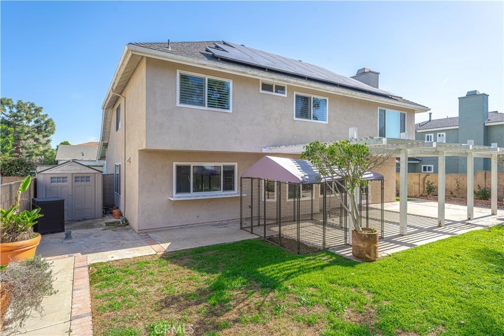 **Stunning Executive Home in Pheasant Run! ** Welcome to this exquisite 4-bedroom, 2.5-bathroom residence that boasts an expansive 2,752 square feet of luxurious living space. Upon entering, you’ll be greeted by a large family room adorned with a stunning brick fireplace, creating a warm and inviting atmosphere, perfect for entertaining friends or enjoying quality family time. The thoughtfully designed living and dining rooms offer additional elegance and space, making them ideal for hosting gatherings and creating lasting memories. The gourmet kitchen is a chef’s dream, featuring an inviting eat-in area, rich cabinetry that exudes warmth, and generous counter and cabinet space. A stylish custom backsplash, a convenient serve-over bar, and built-in desk space provide both functionality and flair. Retreat to the primary bedroom, where soaring ceilings enhance the sense of spaciousness. The ensuite bathroom is a true sanctuary, complete with a dual sink vanity, a luxurious soaker tub perfect for unwinding, and an expansive walk-in closet to accommodate all your wardrobe needs. The additional three bedrooms, coupled with a well-appointed dual sink bathroom, ensure ample space for family members or guests to enjoy comfort and privacy. Step outside to discover a delightful backyard oasis, equipped with a covered patio, offering a perfect setting for lively gatherings or serene moments of relaxation. With the eco-friendly addition of 20 solar panels worth $30k, currently leased. This remarkable home is ideally situated near pristine beaches, an array of shopping and dining options, and top-rated Fountain Valley schools, making it the perfect sanctuary for a vibrant lifestyle.