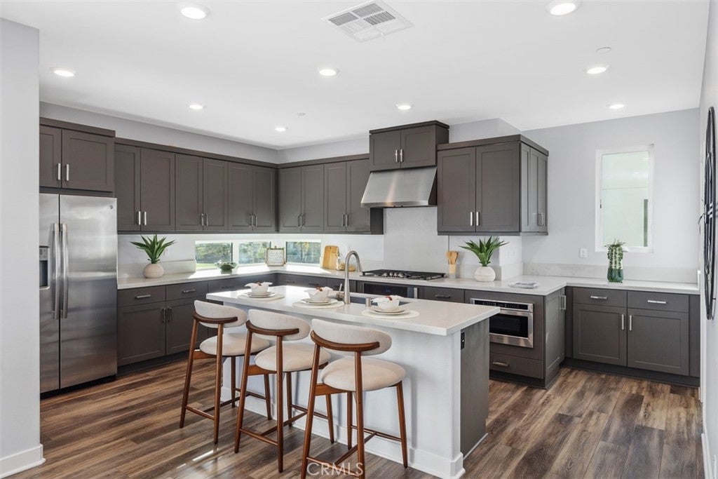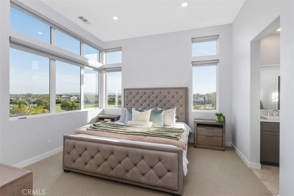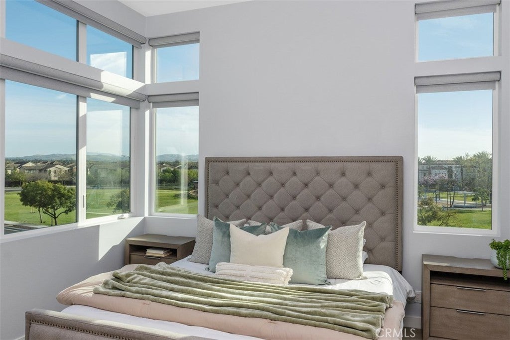MODERN LUXURY WITH PANORAMIC VIEWS — Welcome to this beautifully designed corner home in the heart of Tustin Legacy, offering over 2,200 SQFT of open living space and some of the best park and mountain views in the community. With only one shared wall and abundant natural light throughout, this residence feels both private and spacious. The versatile floor plan includes 4 bedrooms and 3.5 baths, highlighted by a first-floor bedroom with an en-suite bath—ideal for guests, in-laws, or a dedicated home office. The main level features an expansive great room with soaring windows and a chef’s kitchen complete with quartz countertops, stainless-steel smart appliances, a large center island, and a covered balcony perfectly framing the park and hangar views. Upstairs, the primary suite is a true retreat with oversized windows capturing sweeping vistas, plus a spa-inspired bath and generous walk-in closet. Two additional bedrooms complete the top floor, each designed with comfort and style. Located in the desirable Levity Community, residents enjoy access to resort-style amenities including a sparkling pool, spa, and BBQ area. Just steps from Victory Park, The District at Tustin, top-rated schools, and minutes from freeways, this home blends luxury living with everyday convenience.