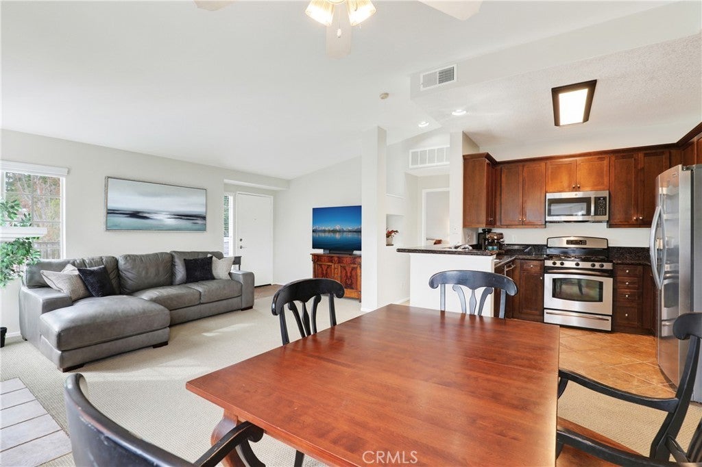 Experience Southern California living at its finest in this turnkey, model-like 1-bedroom, 1-bathroom condo in the prestigious Canyon Villas community. This light-filled residence boasts vaulted ceilings and an open-concept living area centered around a cozy gas fireplace. The gourmet kitchen is a chef’s delight, featuring granite countertops, a stylish custom backsplash, and premium stainless steel appliances. Adjacent to the kitchen, the dining area flows seamlessly into the family room, creating an ideal space for entertaining. The spacious primary suite easily accommodates a king-sized bed and offers a generous walk-in closet. The en-suite bathroom provides dual sinks, granite counters, and a pristine white tile shower-tub combination. For added convenience, a private laundry room with a full-sized washer and dryer is located right on the deck. Step outside to your private balcony/deck to enjoy gentle ocean breeze, and serene views of the California hills—the perfect backdrop for morning coffee or sunset relaxation. You are just steps away from one of two resort-style pools and spas, as well as a well-equipped fitness center. Additional ammenties include outdoor BBQ, outdoor tables, playground, along with hiking and biking trails. Includes a dedicated single-car garage. Ideally located minutes from the I-5 freeway, toll roads, premier shopping, dining, entertainment and top-rated schools. Coastal Proximity...it is less than 10 miles from the Pacific Ocean. This is an incredible opportunity to own in one of the area’s most sought-after communities. Schedule your showing today—this gem will not last!