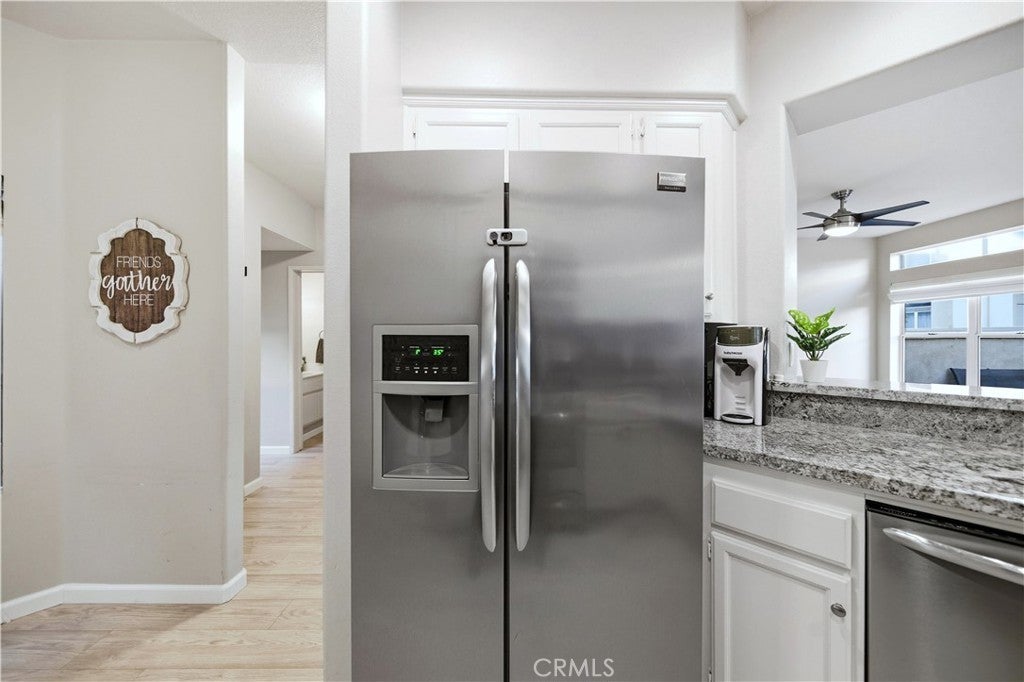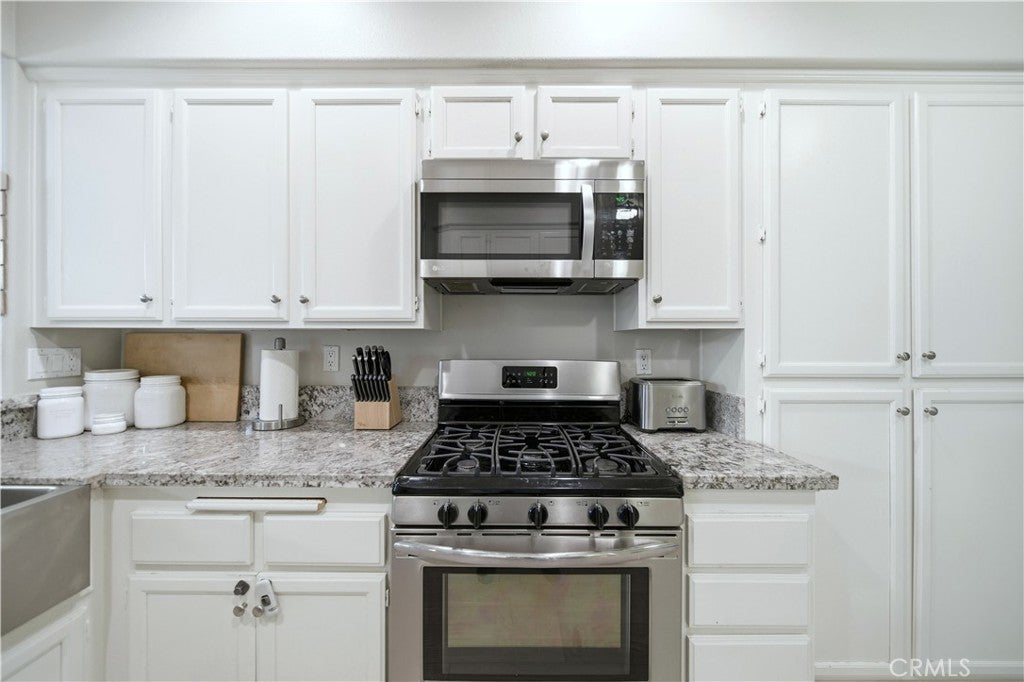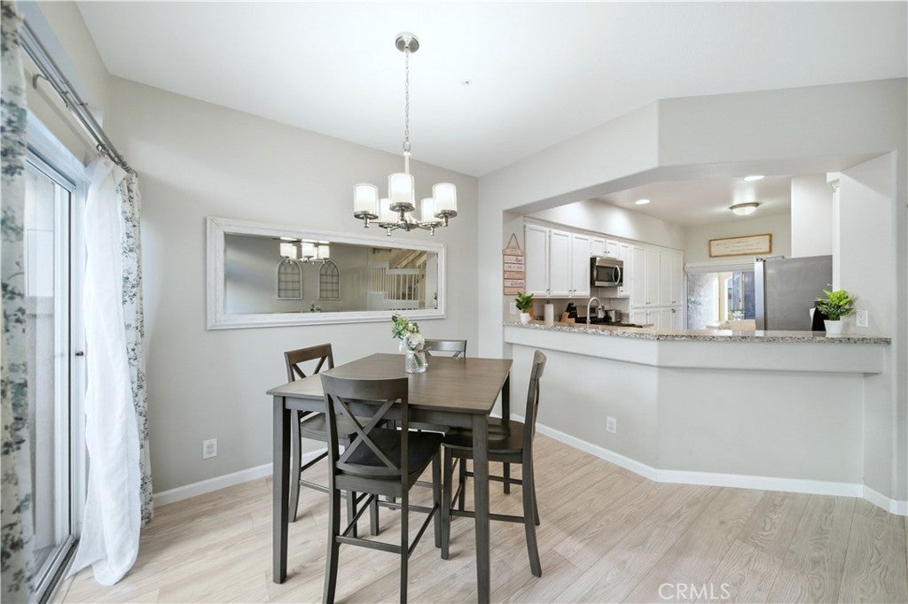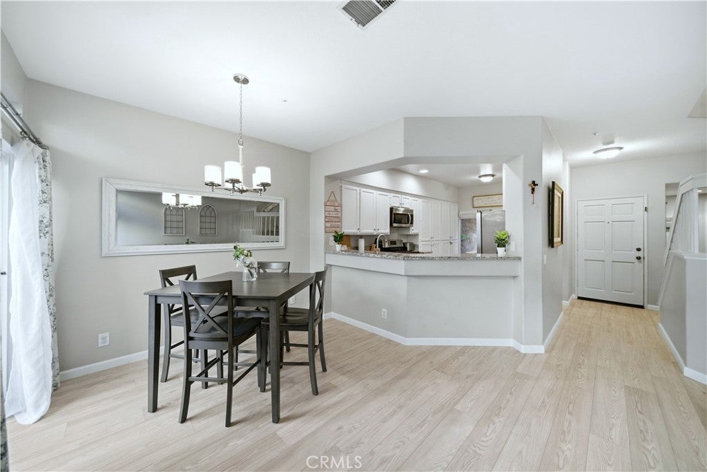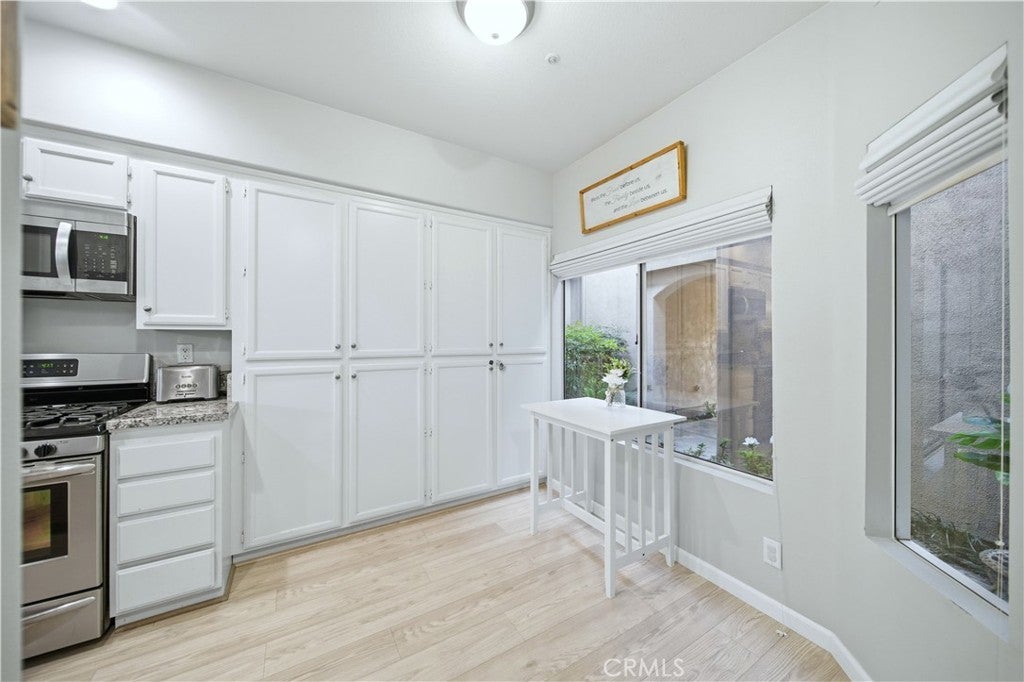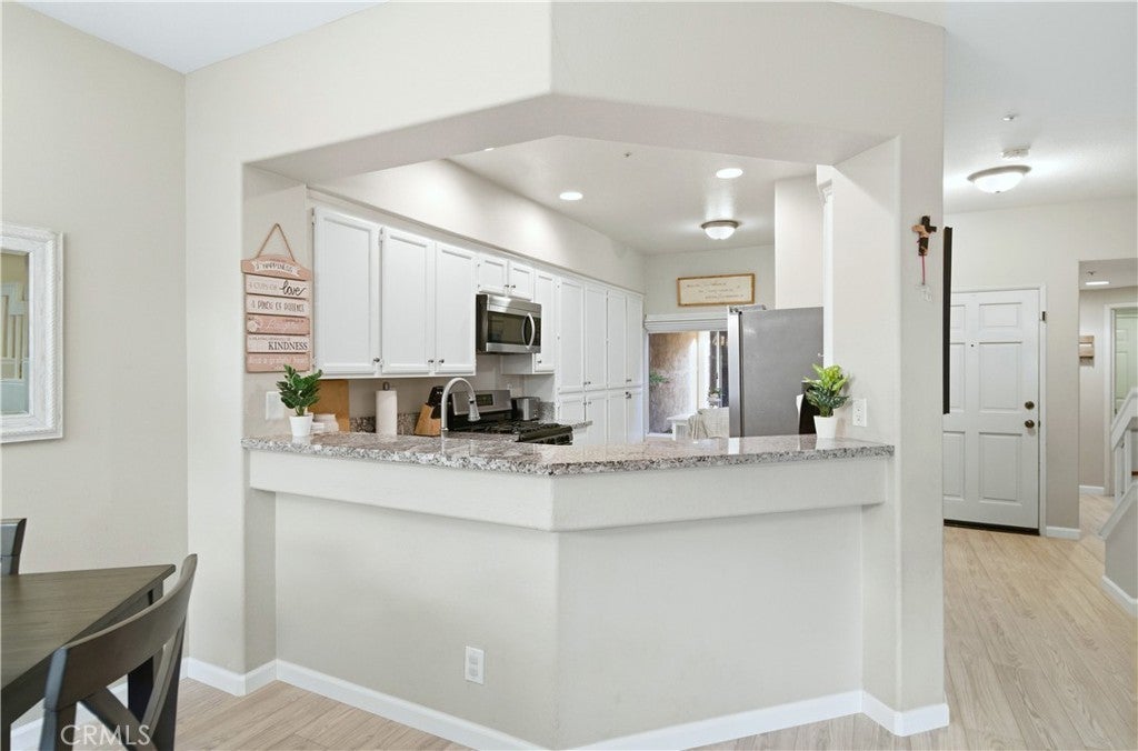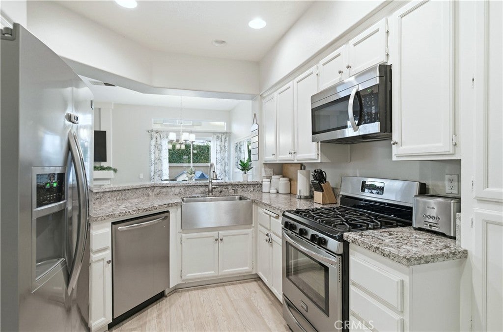 According to SafeWise, welcome to the safest city in all of California; Rancho Santa Margarita. The Cabo Vista Tract of homes is located in the highly sought after section of town known as Melinda Heights. Enjoy neighborhood amenities that include a pool, spa and clubhouse. City wide opportunities include the carefully planned SAMLARC features such as pools, pickleball courts, tennis courts, picnic areas, playgrounds, softball fields, hiking trails, biking trails and membership to the Lago Santa Margarita Beach Club with its massive swimming area. Award winning schools and access to nearby toll roads are all included. This particular home has plenty of natural light, employs the popular great room concept, has no one living above or below and a direct access garage. Textured ceilings, bull-nosed corners, Decor Plugs/Switches, raised panel doors, brand new carpeting, brand new luxury vinyl flooring and oversized baseboards are featured throughout. The renovated kitchen has granite counters/backsplash and stainless steel appliances including the dishwasher, the stove/oven, barn style sink, microwave and faucet. The handy breakfast bar will make casual meals a snap, or you can use the convenient nook area off the kitchen with its ample storage. Both upstairs bedrooms have their own self-contained bath. The primary suite has a walk in closet, dual sinks, a walk in shower and a privacy door to the commode area. Both bedrooms have mirrored closet doors. The rear patio is perfect for firing up the bar-b-q, relaxing or entertaining. When I asked the owners what they most enjoyed about their home, I was told they appreciated the peace and quiet, how friendly the neighbors were and how safe they felt. Those are exceptional qualities for any home in any price range.