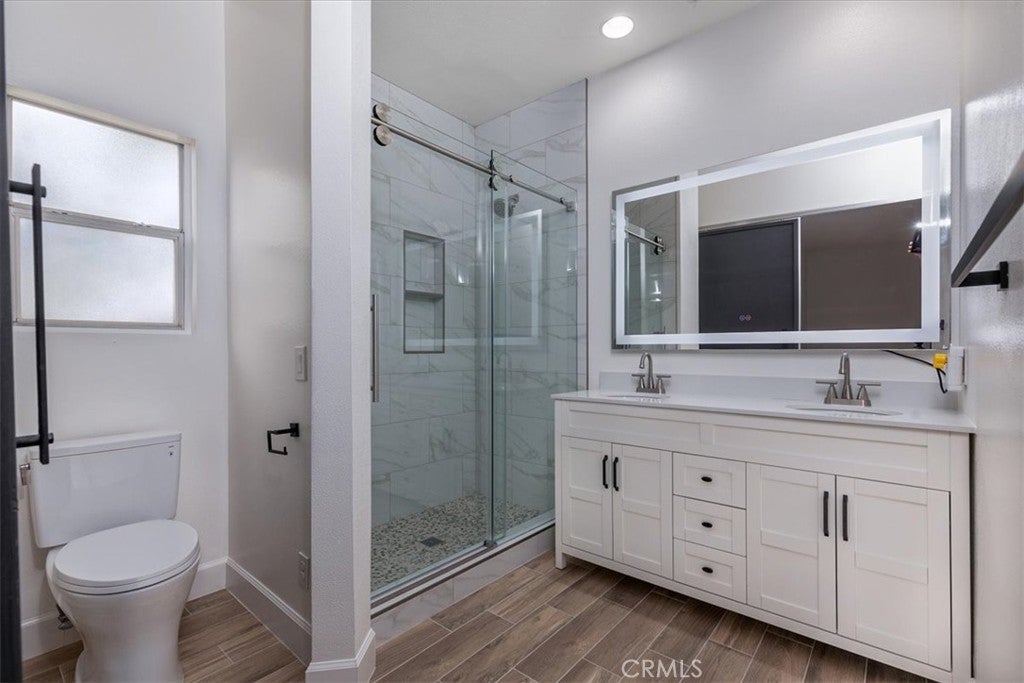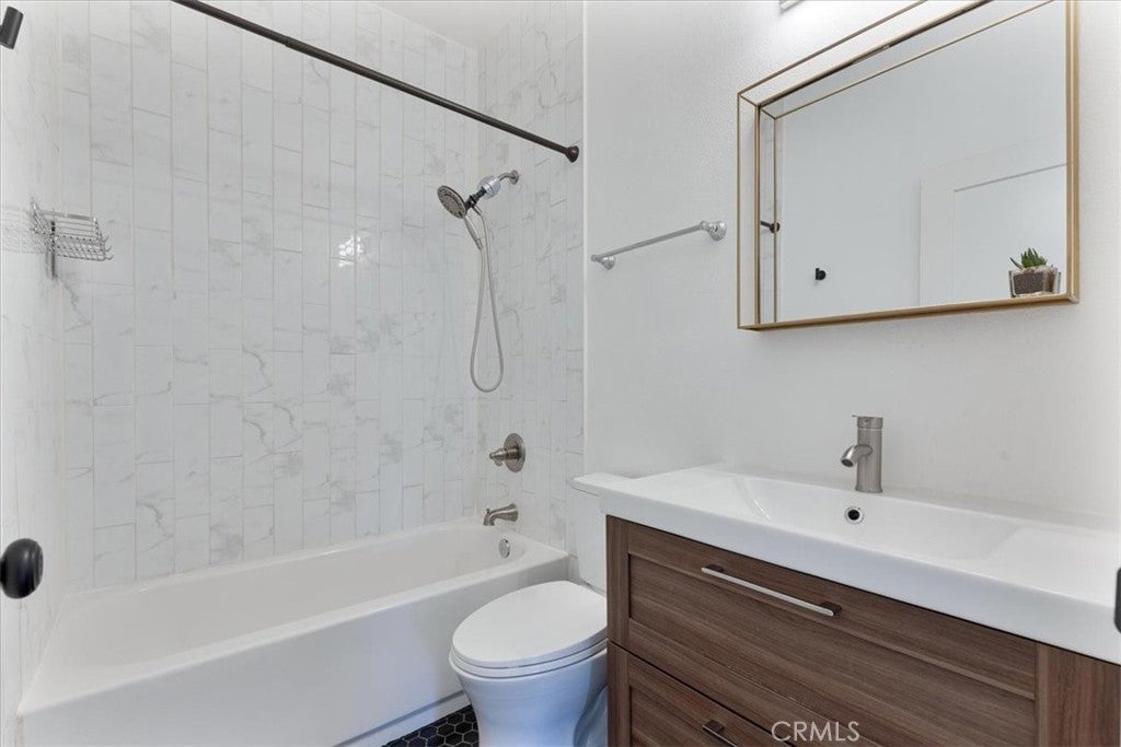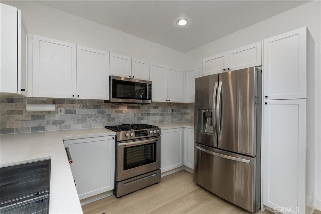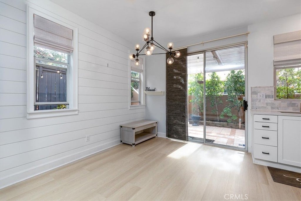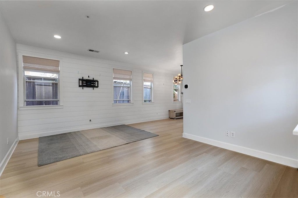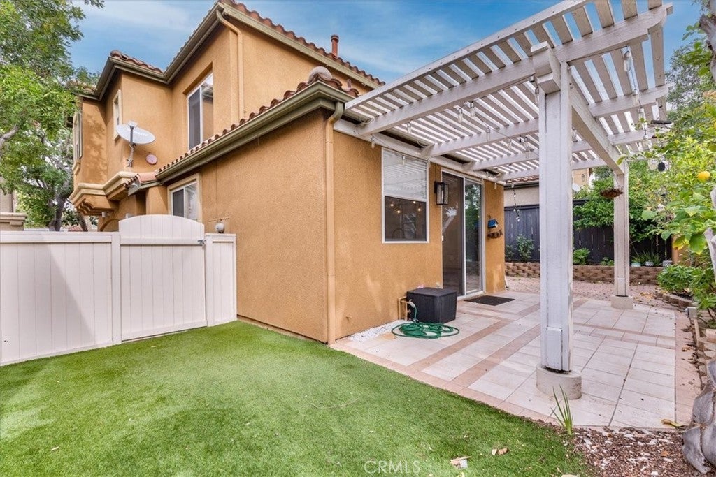 Highly upgraded 3-bedroom, 2.5-bath detached townhome located in the sought-after Los Abanicos community of Rancho Santa Margarita. From the moment you enter, the home feels light, bright, and welcoming. The spacious living room features a striking floor-to-ceiling shiplap accent wall—perfect for both everyday living and entertaining. The kitchen opens seamlessly to the dining area and has been thoughtfully upgraded with modern quartz countertops, real marble subway backsplash, updated cabinet doors and hardware, and stainless steel appliances. A deep under-mount sink with a matte black high-arc pull-down faucet adds both style and functionality. Upstairs, the primary bathroom has been fully remodeled and includes a sliding barn-style door, frameless glass shower with curb-less entry, rain shower head, and a double walnut vanity. Additional upgrades throughout the home include modern shaker-style interior doors, new baseboards and window trim, luxury vinyl plank flooring with real wood stair treads, woven window shades, and updated modern light fixtures in all bedrooms and the dining area. Enjoy one of the largest yards in the community, professionally landscaped with artificial turf, a newly painted privacy fence, and a custom side gate—ideal for relaxing or entertaining outdoors. Los Abanicos offers one of the best HOA Amenities in Rancho Santa Margarita, with access to a clubhouse, swimming pool, and tennis courts. This is a rare opportunity to live in a beautifully upgraded, move-in-ready home in a prime location.