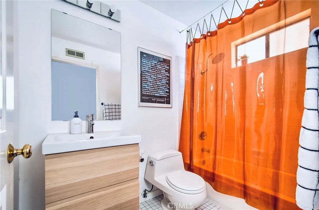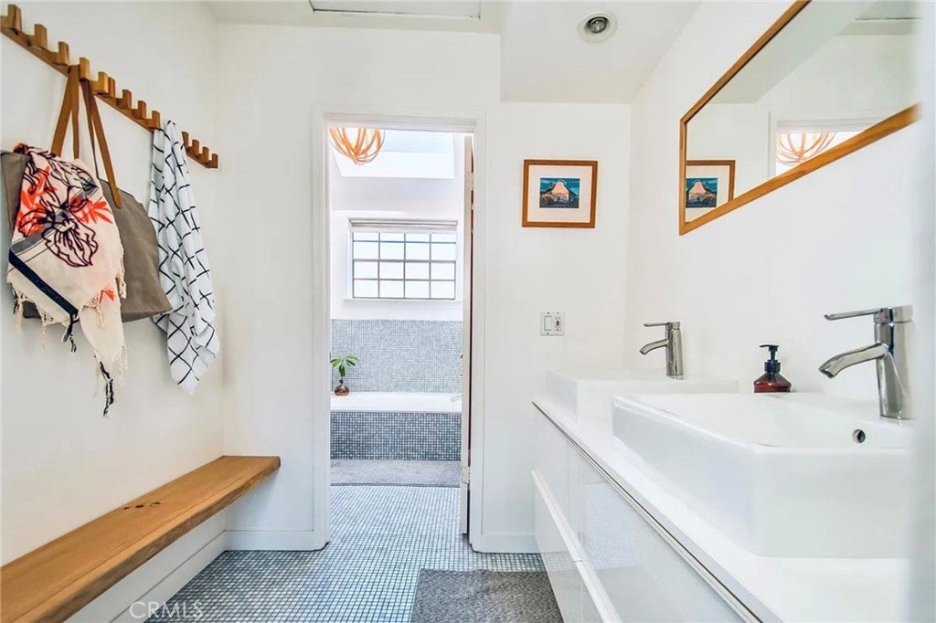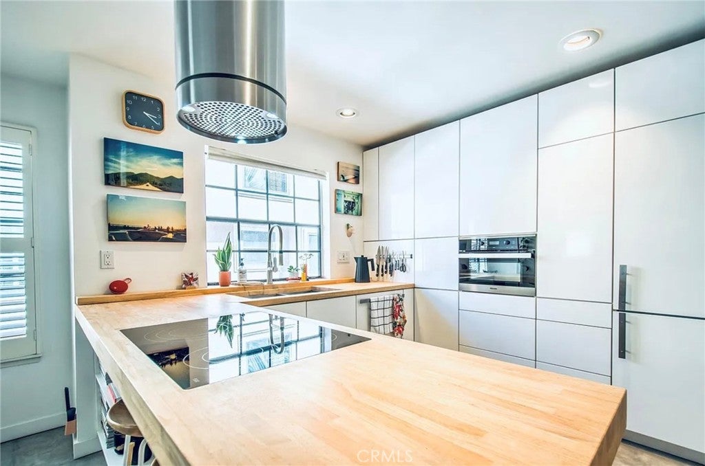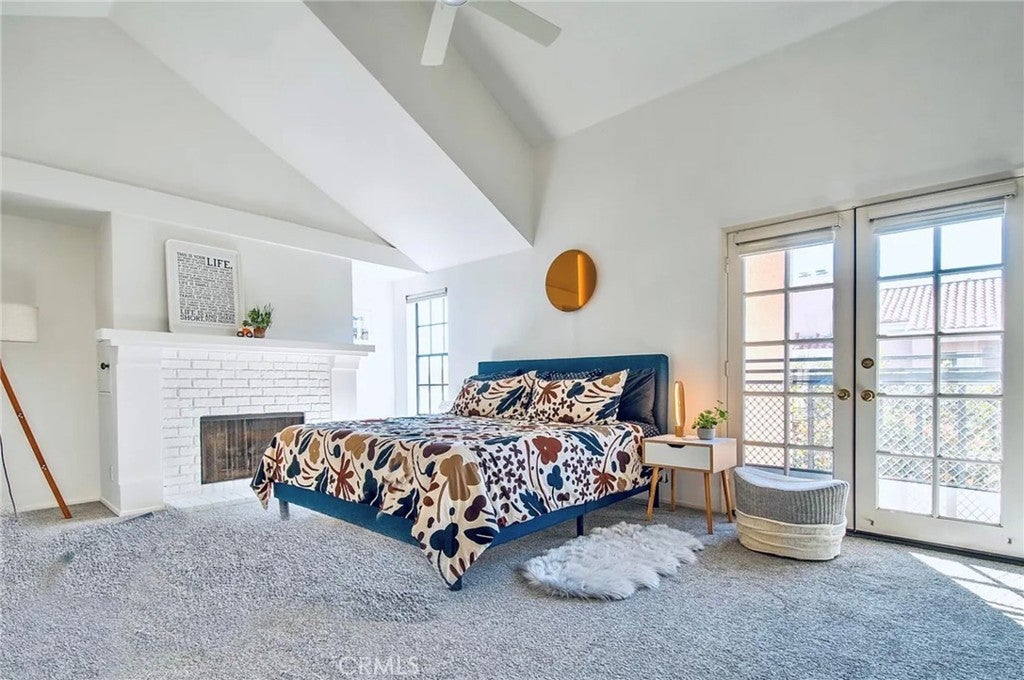 This modern Scandinavian-inspired 2-bedroom, 2.5-bathroom residence offers a refined living experience with thoughtful design, high-end finishes, and seamless indoor-outdoor flow. The open-concept main level features polished concrete flooring, a spacious dining area, and a custom kitchen with hardwood countertops, a seamless induction cooktop, and built-in premium appliances, including a Miele convection oven and microwave, Liebherr refrigerator and freezer, and dishwasher. The living area is designed for both comfort and functionality, featuring wood slat accent walls for enhanced acoustics, wall-mounted cabinetry for ample storage, and a dedicated work area with desk and ergonomic seating. French doors open to a private, shaded patio surrounded by lush greenery and equipped with a barbecue, creating an ideal space for relaxing or entertaining. This level also includes a convenient half bathroom. Hardwood stairs and hallway flooring lead to a well-appointed guest bedroom with built-in desk, wall-mounted bookcase, dresser, and an adjacent full bathroom with shower and tub combination. A few additional steps lead to the private primary suite, which features a vaulted ceiling with ceiling fan, fireplace, spacious closet, and a private balcony overlooking the community pool. The en-suite bathroom is filled with natural light from a skylight and includes dual sinks, wall-mounted storage, a live-edge wood bench, separate shower, and soaking tub. The home is furnished with a curated collection of design-forward pieces from Eames, Emeco, Design Within Reach, contemporary and vintage IKEA, along with custom artwork, creating a cohesive and sophisticated atmosphere throughout. Additional features include a private, attached two-car garage with in-unit laundry, featuring a Whirlpool washer with steam cycle and dryer, along with an adjacent shared storage room. The residence offers direct private access from the patio to the community pool and spa area, which includes landscaped grounds, restrooms, showers, and outdoor seating. The gated community provides a well-maintained and inviting environment, while the home’s location offers convenient access to coastal amenities, John Wayne Airport (SNA), major transportation corridors including the 55, 405, and PCH, as well as shopping, dining, outdoor recreation, and regional attractions.