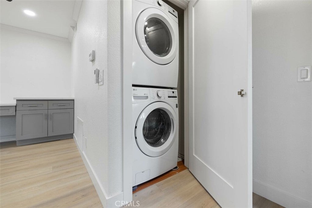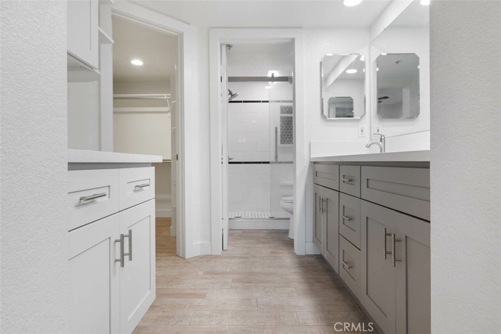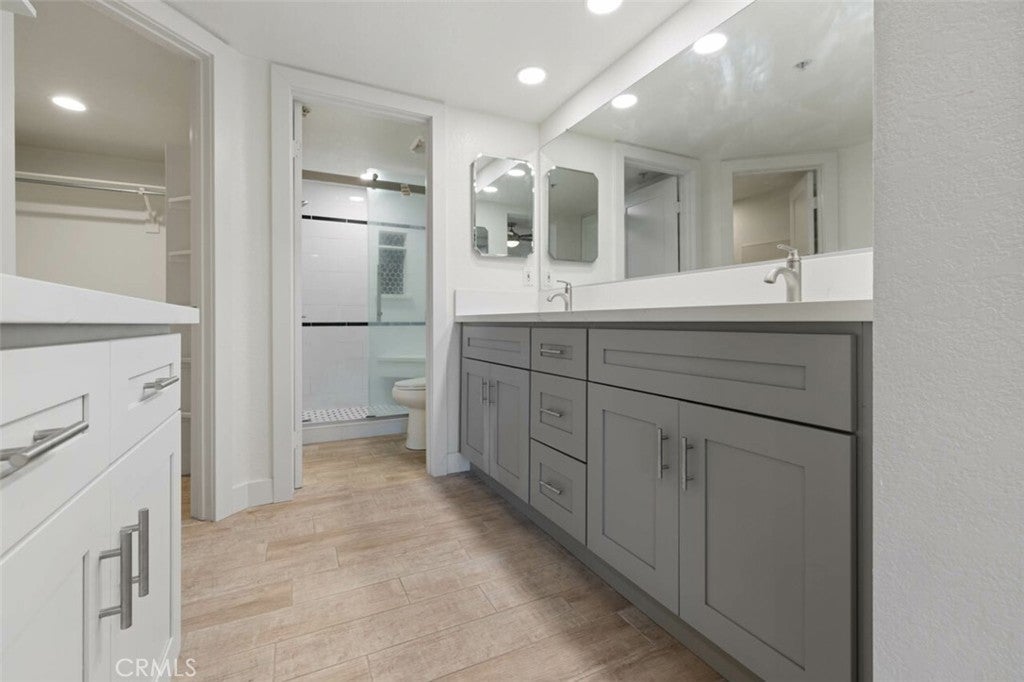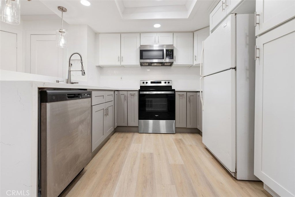 A spectacular 1BR/1BTH / 1-car garage home completely remodeled from top to bottom. A wonderful, quiet location facing the park. From the moment you walk in the meticulously crafted and selected materials work in unison to evoke the feeling of a cottage on Cape Cod. Sea washed gray tones in the planked flooring throughout are not just beautiful, but also easy to clean and hypoallergenic. Kitchen features ample white and gray Shaker cabinetry designed to maximize the storage space and create an environment for culinary creativity. Quartz countertops reflect light like the sandy shores of the Atlantic beaches. Eating options include a breakfast bar or a dining area. Open floor plan style with the kitchen, dining room, and living room. Large master bedroom with a walk-in closet. Bathroom features a custom vanity, extra storage, quartz counters, and a large shower fully tiled with a clear glass custom made shower door. Featured throughout the home are designer series electrical switches/outlets, recessed lighting on dimmers, and Shaker doors with satin nickel hardware. Inside laundry with washer/dryer included. Sliding doors from the living room and bedroom lead to a large patio with 2 storage closets. Private 1-car garage with lots of room for storage. Association is a resort-like community with two pool/spa areas, complete fitness center, playground, and clubhouse. Across the street is Tustin Ranch Sports Park and Tustin Ranch Elementary School. Close to Tustin/Irvine Marketplace, Peter’s Canyon biking and hiking trails, and Tustin Ranch Golf Course. Convenient to freeways and toll roads.