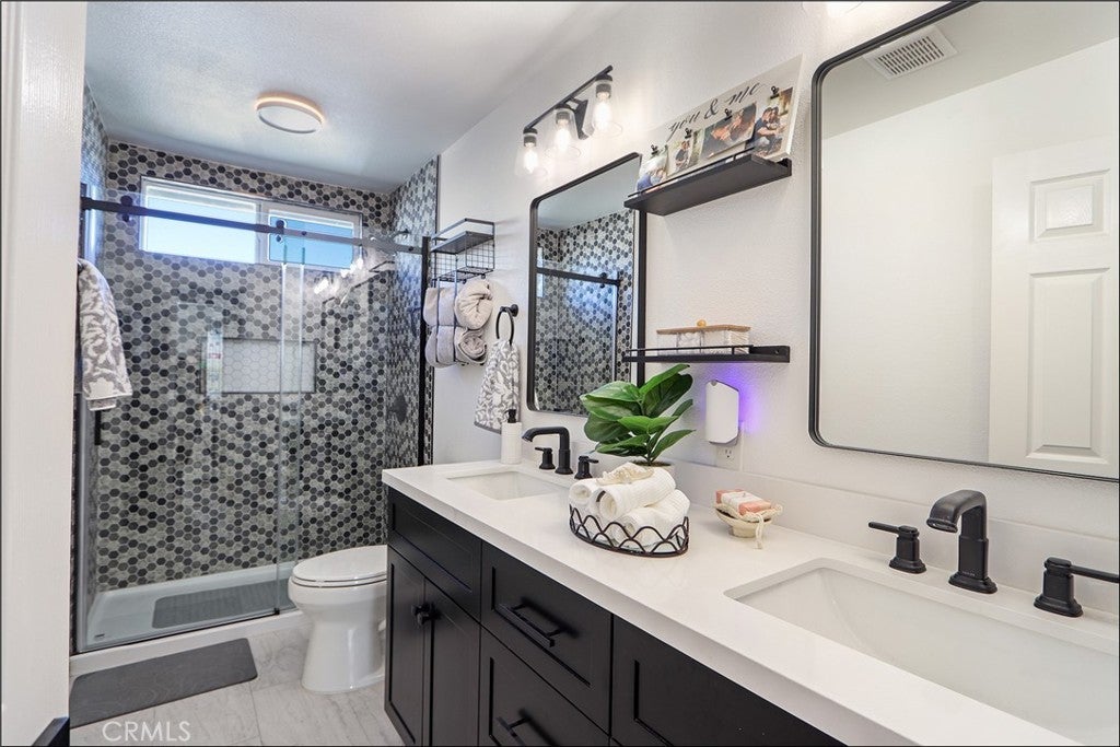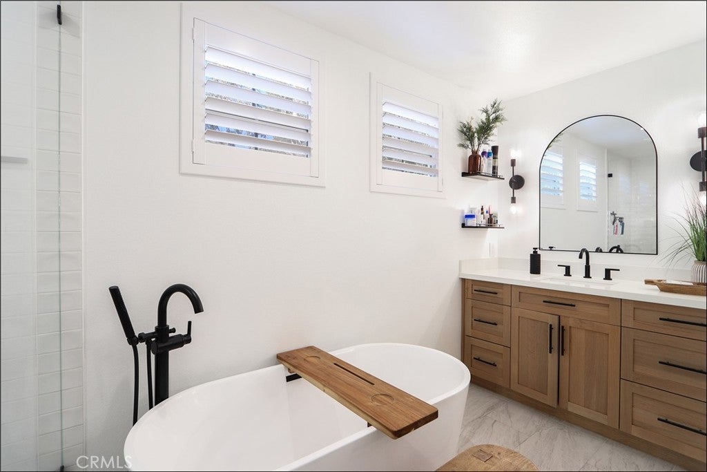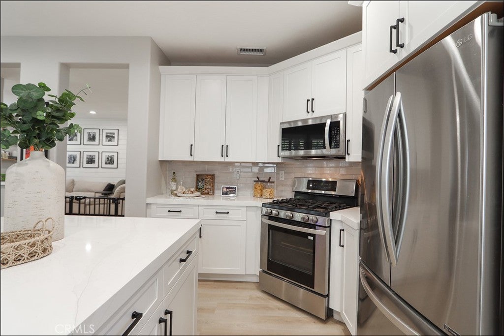 ONE OF A KIND LOCATION WITH FULL DRIVEWAY, SPACIOUS FLOOR PLAN AND SPECTACULAR UPGRADES! Truly a stunning property offering spacious living areas with living and dining accented by designer style shiplap wall and family room with fireplace. Stunning kitchen with center island and bar seating, designer Quartz countertops, designer style backsplash, upgraded shaker style cabinets with upgraded hardware, stainless steel appliances, floating shelves and office niche area with French door access to the large patio area for your outdoor enjoyment and entertainment. Main floor also features direct access to the two-car attached garage with epoxy flooring and powder room with new designer vanity and upgraded fixtures. Sun drenched staircase leading to the spacious second story featuring a large primary suite featuring a large walk-in closet with California Closet organizers and custom barn doors, breathtaking master bathroom featuring a freestanding tub, large walk-in shower with frameless glass enclosure, large vanity with dual sinks, Quartz countertop and upgraded fixtures. Large 2nd, 3rd and 4th bedrooms, conveniently located full size laundry area and totally remodeled full second bedroom featuring a large walk-in shower with designer style tile surround, glass enclosure, large vanity with dual sinks, Quartz countertop and upgraded fixtures. Repiped with PEX, whole house water softener and filtration system, newer and upgraded HVAC system, upgraded flooring and baseboards, added/upgraded recessed lighting, switches and dimmers, fresh exterior paint and so much more. Exceptional location with large front porch overlooking the lush greenbelts and added privacy, walk to resort style pool and spa, highly rated schools within walking distance, excellent proximity to Aliso Viejo Town center with shops, restaurants and entertainment, easy toll road (73) and beach access (via 133) and nearby hiking, biking and nature trails!