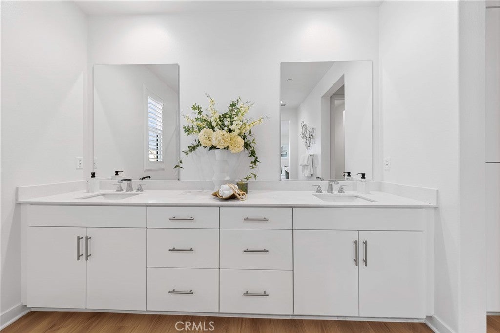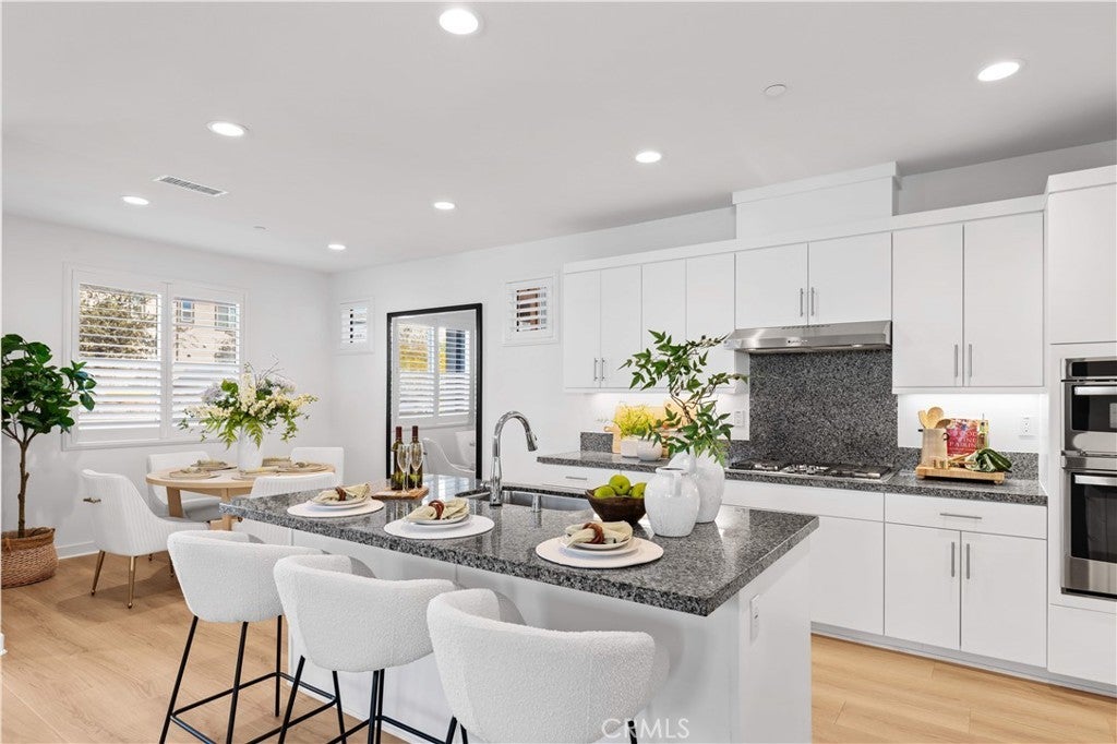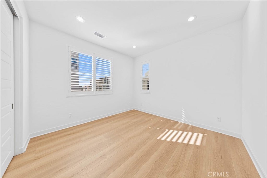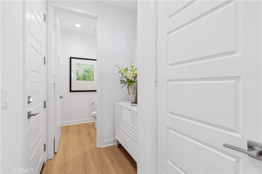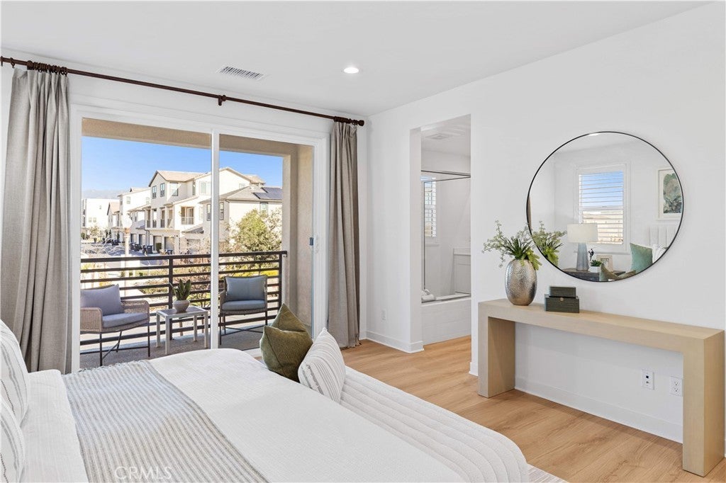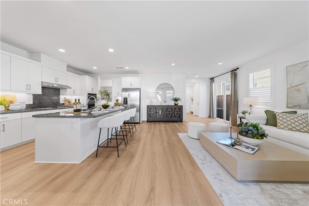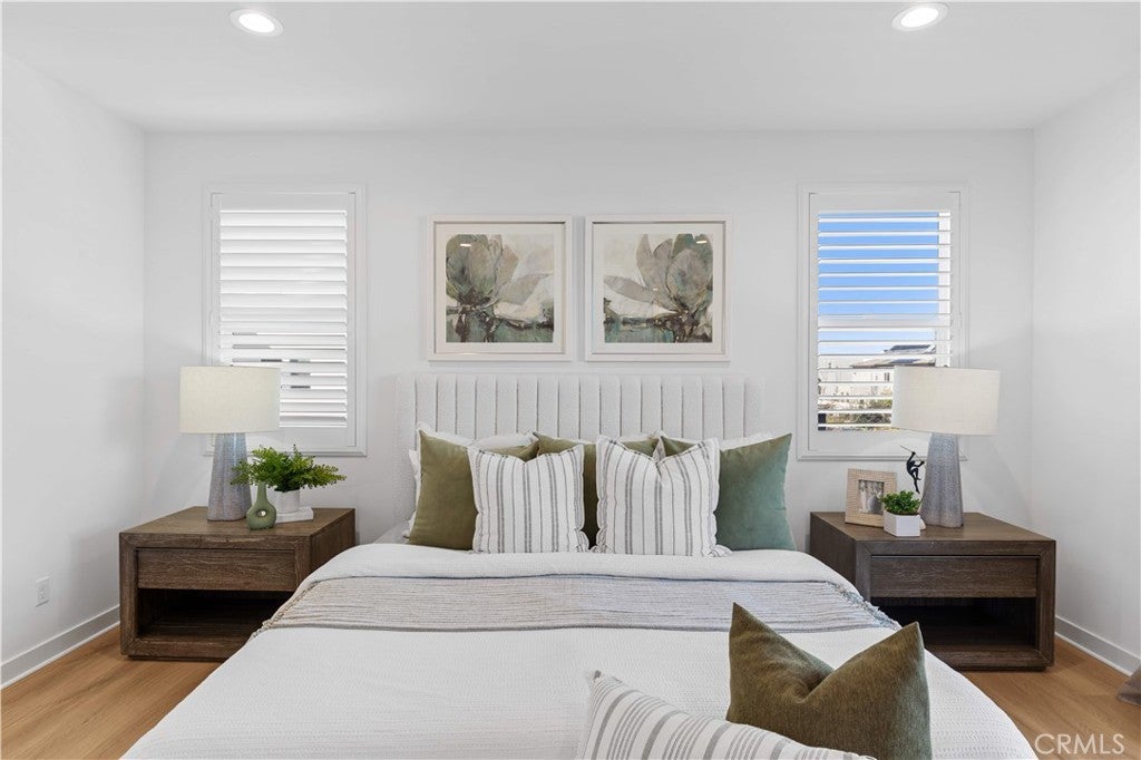 This stunning corner-lot detached home features the highly desirable Plan 1 of Aer in Solis Park at the Great Park Neighborhoods. Offering 3 bedrooms, 2.5 bathrooms, and a versatile tech loft, the home blends modern design with practical functionality in a thoughtfully planned layout. The open-concept main level is filled with natural light, highlighted by high ceilings, expansive windows, and sliding glass doors that create a bright and welcoming living environment. The chef-inspired kitchen serves as the heart of the home, featuring an oversized center island, granite countertops, stainless steel appliances, and a spacious walk-in pantry—ideal for both everyday living and entertaining. Luxury vinyl plank flooring runs throughout the entire home and is complemented by upgraded recessed lighting throughout, while the first floor also includes a powder room and a convenient built-in wardrobe area near the garage entry. Upstairs, the home offers three well-proportioned bedrooms, a flexible tech loft ideal for a home office or study area, and a laundry room with sink for added convenience. The primary suite provides a peaceful retreat, complete with a private balcony, a generous walk-in closet, and a spa-like bathroom featuring dual vanities and a walk-in shower. Residents enjoy an exceptional resort-style lifestyle in the heart of the Great Park Neighborhoods, with access to an extensive array of amenities including multiple resort-style swimming pools, basketball courts, playgrounds, parks, picnic areas, and a network of scenic walking and biking trails. Community clubhouses and thoughtfully designed green spaces foster an active yet relaxed living environment. The home is located within the highly acclaimed Irvine Unified School District, known for its top-rated schools and strong academic reputation. With its prime corner location, abundant natural light, and access to world-class community amenities, this home offers a refined blend of comfort, convenience, and the signature Great Park lifestyle.