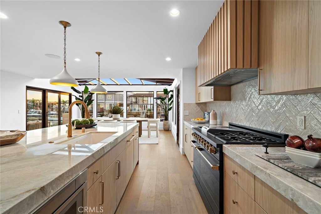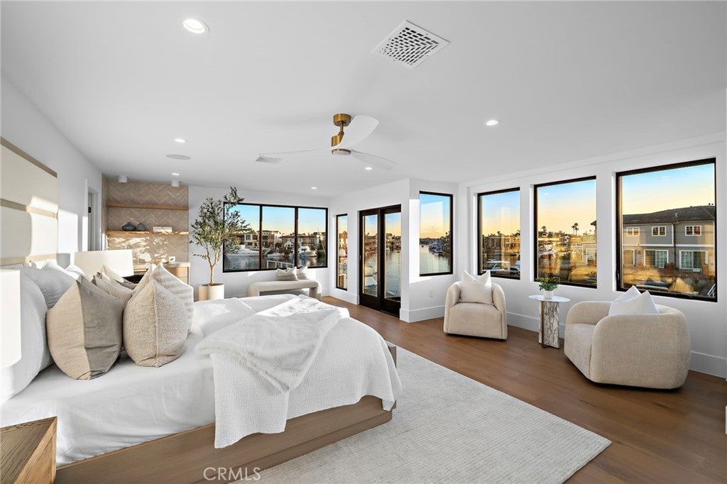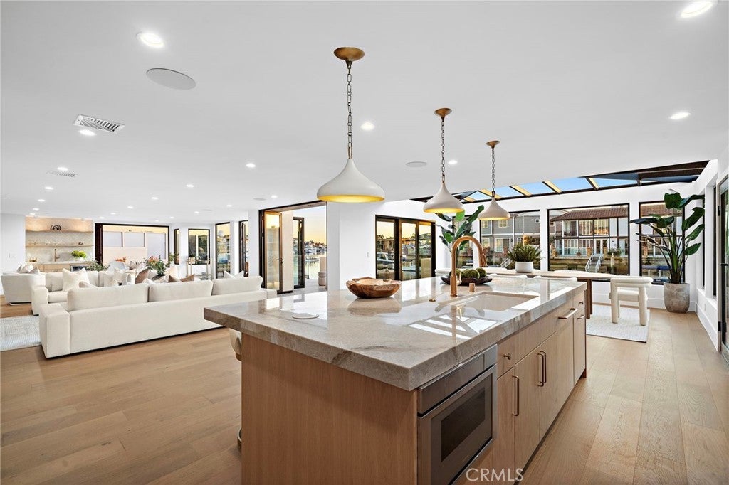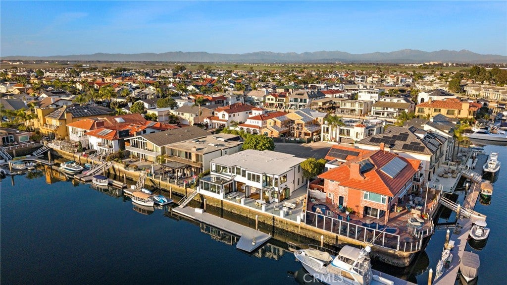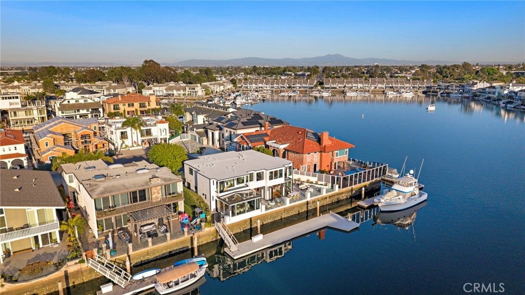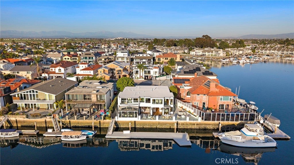 Stunning contemporary custom built waterfront residence located on Humboldt Island. Prime waterfront location with exceptional tri channel views. Encompassing 82 feet of expansive water frontage with a private 70-foot dock. Construction was just completed on this magnificent property that was taken down to the studs and completely rebuilt with all the finest finishes. As you enter the home you are greeted by a massive iron and glass pivot door that leads into the foyer with high volume ceilings. The beautiful water views are immediately in sight as your move into the living space with its open intuitive flowing floor plan. The Italian Bonelli bi fold doors stretch throughout the back side of the residence creating a seamless connection from the interior to the outdoor waterside deck. The great room style of this floor plan captures every inch of the waterfront views. Fabulous kitchen features a center island adorned with Taj Mahal quartzite counters. Rich white oak custom cabinetry with designer selected hardware offers ample storage and dual pantries. High end appliances featuring Thermador Freedom built in French door refrigerator and THOR Gordon Ramsey series double oven and range will be a true delight for the new homeowner. Rich white oak hardwood flooring complements the entire space in the home. Phenomenal glass domed dining area commands attention and features even more of the wide waterfront views. There is a convenient downstairs bedroom with en suite bath that can be utilized in many ways. Upstairs you will find the primary suite with its tranquil ambience. The views from the primary suite are amplified by the extensive window placements. There is a lovely sitting area and built in cabinetry with beverage center. The walk-in closet will be sure to accommodate all your wardrobe. The primary bath is sumptuous in design with a large soaking tub and a triple sized shower area. Custom white oak cabinetry and Lux quartz countertops. There are three additional bedrooms upstairs all come complete with en suite baths. The fifth bedroom is utilized as a bonus room which offers additional opportunity for relaxed and comfortable living. The waterfront deck area faces in a Southern direction and is sunny all day long allowing hours of enjoyment for living the Huntington Harbour Lifestyle!