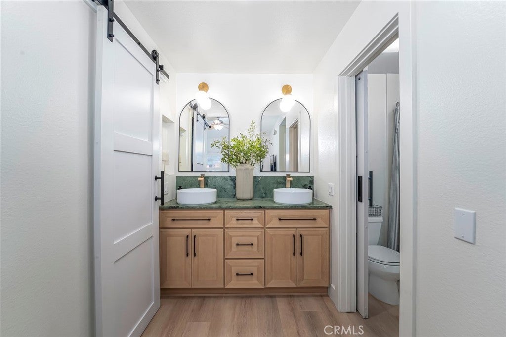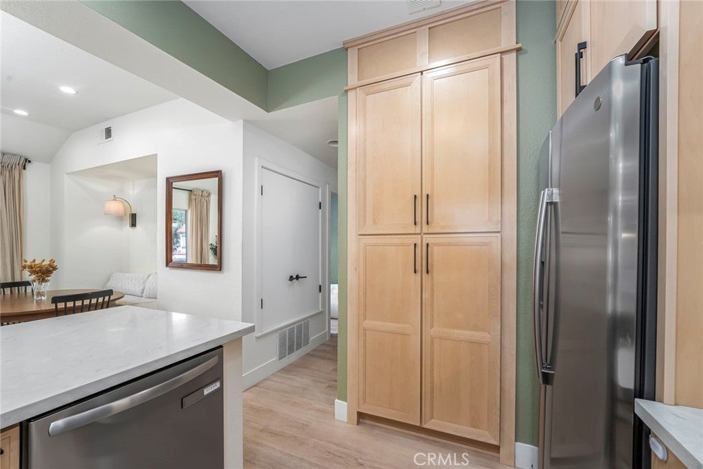 Welcome to this beautifully upgraded upper-level corner condo in the desirable Brisa Del Lago II community. With soaring vaulted ceilings and an open-concept layout, this home is bathed in natural light, creating a warm and inviting atmosphere. The newly remodeled kitchen is a showstopper—featuring quartz countertops, a custom tile backsplash, stainless steel appliances, floating shelves, and extended ceiling-height cabinetry. A removed wall and raised ceiling enhance the sense of space, while a window near the sink brings in even more light. The kitchen flows seamlessly into the dining area, perfect for entertaining. Luxury vinyl plank flooring runs throughout the entire living areas, complementing the cozy fireplace and ceiling fan in the spacious living room. Step through the sliding glass door to a private balcony with turf—ideal for relaxing or enjoying your morning coffee. The dining area boasts custom built-in bench seating with storage and designer lighting. Both bedrooms include ceiling fans, with the primary suite offering a walk-in closet with stylish barn doors and a fully updated ensuite bath featuring a new fiberglass tub/shower combo, dual vanities with quartz counters, and modern vessel sinks. The secondary bedroom, currently used as an office, includes a mirrored wardrobe and easy access to a second updated full bath. Additional highlights include an in-unit stackable washer and dryer, a detached one-car garage with opener, and access to the community pool, spa, and recreation area. Located just moments from Rancho Santa Margarita Lake, Trabuco Mesa Park, Monte Vista Park, and O’Neill Regional Park—with year-round events, shopping, dining, and entertainment nearby—this home offers the perfect blend of comfort, style, and convenience.