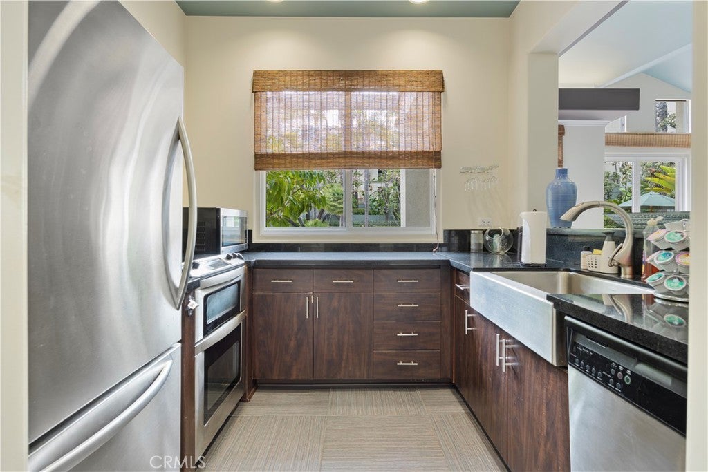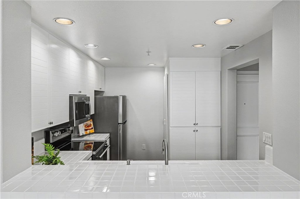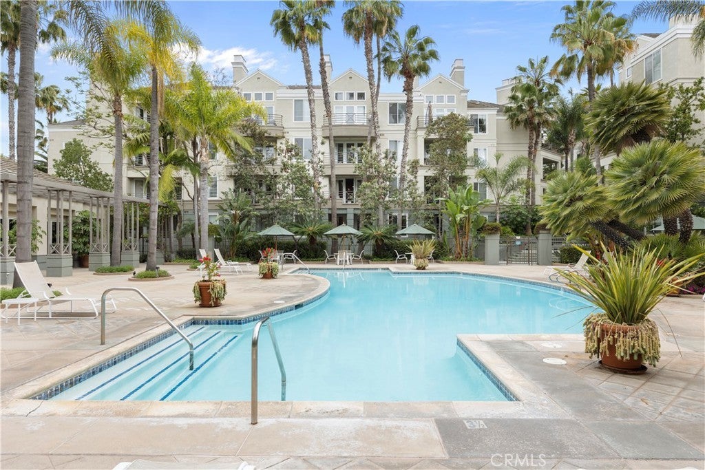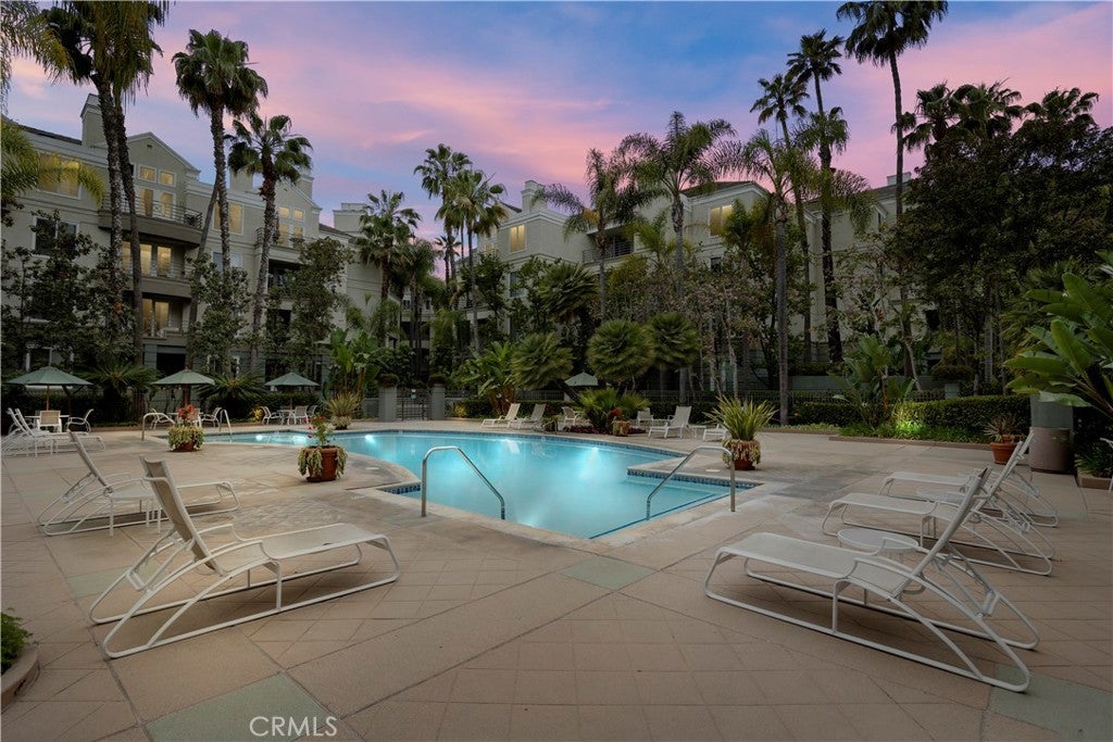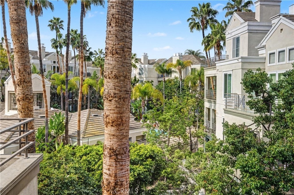 Situated within the guard-gated Metropolitan Community of Irvine, this rare third-level, top-floor penthouse residence with no unit above offers a low-maintenance lifestyle with resort-style amenities and gated security. The elevated location allows for vaulted ceilings and abundant natural light throughout. Community features include a clubhouse, fitness center, pool, and spa, while HOA dues cover water, trash, and gas for added convenience. The light-filled, open floor plan features two bedrooms and two bathrooms, enhanced by fresh interior paint and updated fixtures throughout. A flexible office or den near the entry provides versatile use and may serve as a guest bedroom or dining area. The kitchen opens to the living area and includes stainless steel appliances and an in-unit laundry closet with stackable washer and dryer. A private balcony extends the living space and offers peaceful outdoor enjoyment with views of palm trees, blue skies, city lights, and a peek-a-boo pool view. The primary suite features vaulted ceilings, generous closet space, and an en suite bathroom with dual-sink vanity, soaking tub, and separate shower with updated faucets and fixtures. The secondary bedroom is well-sized and located near the hall bathroom, offering comfort and privacy for guests or additional occupants. Additional highlights include two assigned subterranean parking spaces. Conveniently located near major freeways, John Wayne Airport, South Coast Plaza, Fashion Island, Newport Beach, and Irvine’s premier dining, shopping, and employment centers, this penthouse is a rare lease opportunity within the Metropolitan gated community of Irvine.