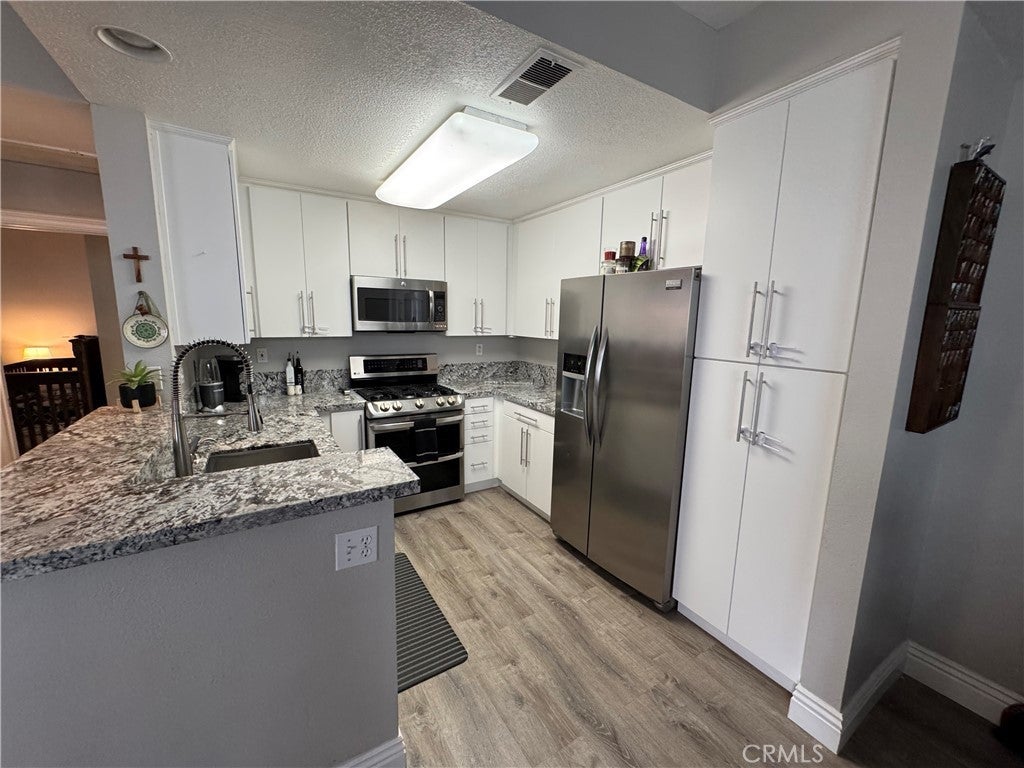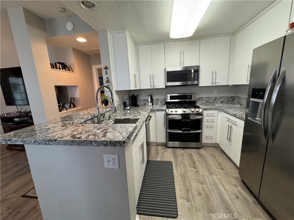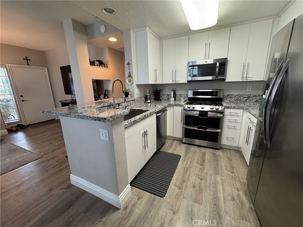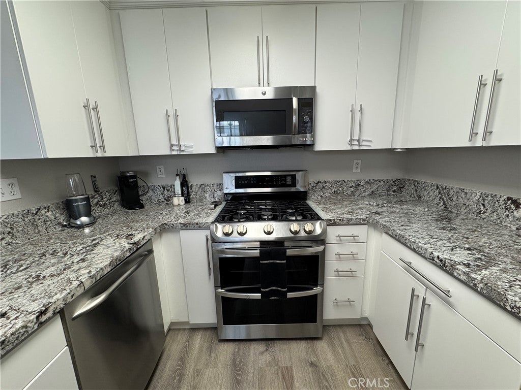 Welcome to Canyon Villas in scenic Aliso Viejo. This Cape Cod inspired exclusive private gated community has lots of amenities including clubhouse, resort style pool, spa, gym and tot lot. Looking for a 1 bedroom, end unit that is light and bright with no stairs that is beautifully remodeled? This is it. You are greeted by a wrought iron gated private, covered patio. Perfect for entertaining and a place to BBQ. Also is a convenient closet area for your washer and dryer. The kitchen is sure to please with gorgeous natural stone granite counters, new custom white cabinets, stainless appliances, farmhouse stainless oversized sink, breakfast bar and is open to the family room. You will appreciate the dining area and recessed area for a desk if you work from home. The bedroom is spacious and the bathroom has two sinks and granite counters. There is an oversized tub and shower and plenty of storage and closet space. The flooring is a neutral wide plank luxury vinyl. This end unit is light and bright. This unit has a detached single car garage. The beautiful community is in close proximity to Laguna Beach and Dana Point. Close by is Costco, Walmart, lots of shops and many restaurants. A short drive to the 5 fwy and the toll road. Enjoy coastal breezes, hiking and bike trails. The best is waiting for you...experience the California lifestyle in south OC and all it has to offer.