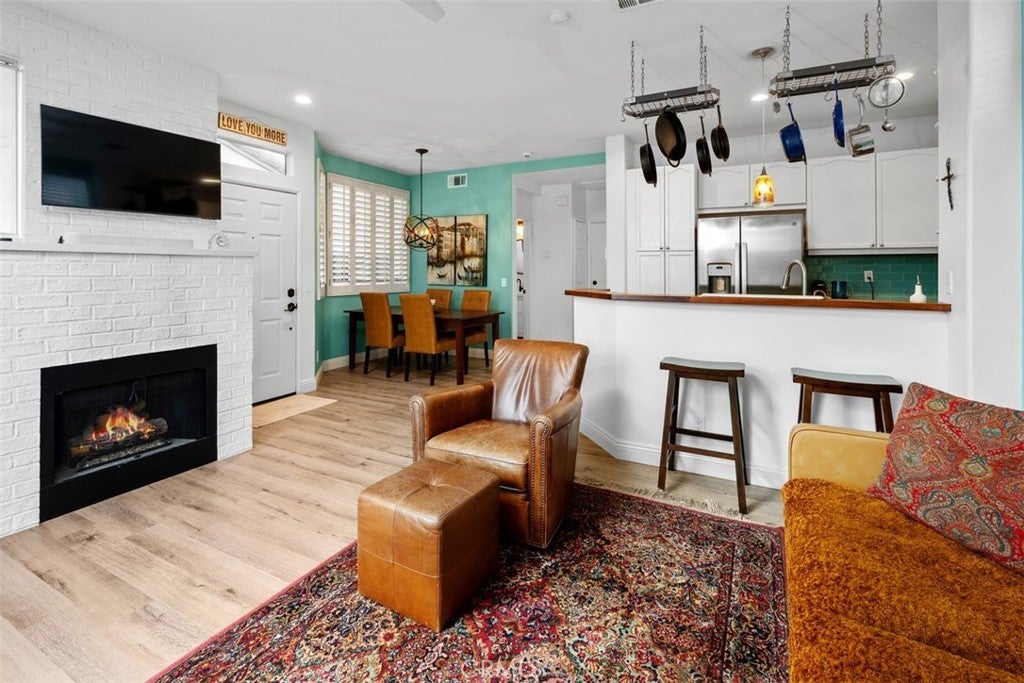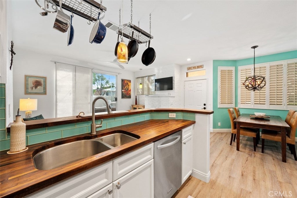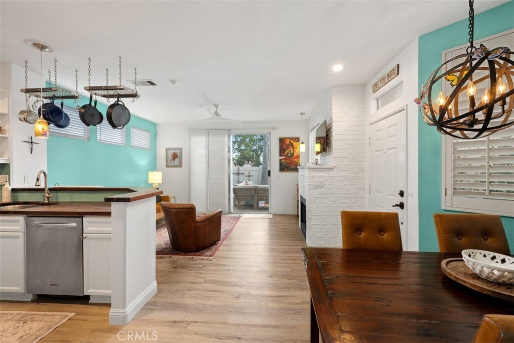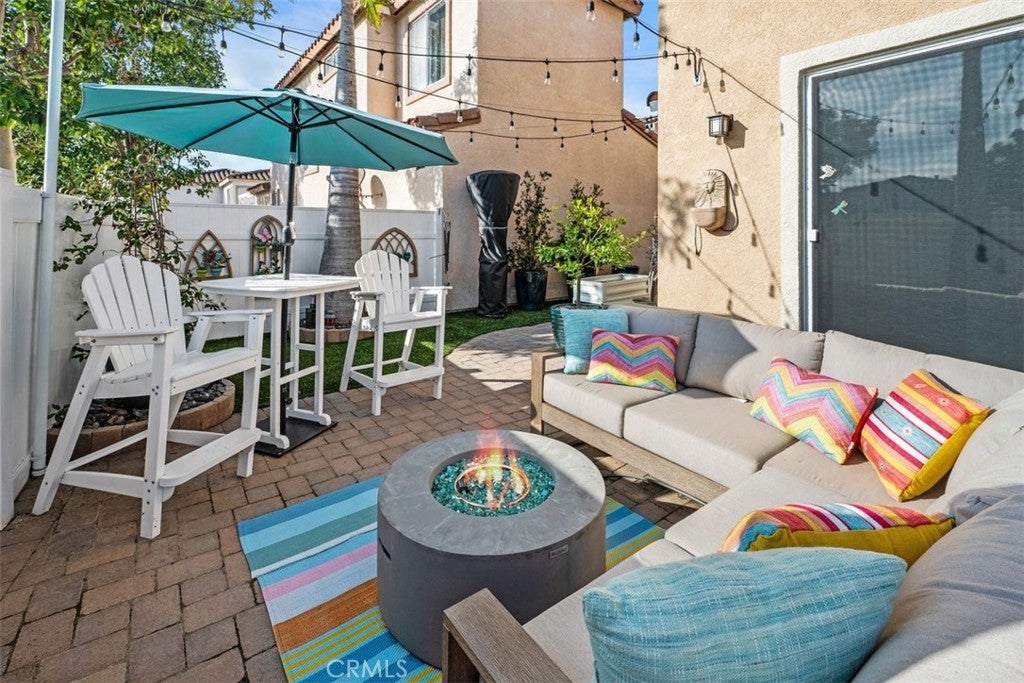 Nestled on a premier greenbelt corner lot within the highly desirable Flores Los Alisos community, this beautifully detached 3-bedroom, 2.5-bath residence offers a rare blend of privacy, warmth, and refined design. From the moment you enter, natural light fills the home, creating an atmosphere that feels both open and intimate. The living space is anchored by a charming white brick-style fireplace—an inviting focal point for quiet evenings or gathering with friends and family. A sunlit stair landing framed with plantation shutters adds architectural character and soft filtered light to the upper level. At the heart of the home, the remodeled kitchen is as stylish as it is functional. Turquoise glass tile adds a subtle pop of personality, while stainless steel appliances, designer fixtures, and a rich wood bar top create a space that feels thoughtfully curated and effortlessly welcoming. Whether hosting dinner parties or enjoying a slow Sunday morning, this kitchen truly lives beautifully. Upstairs, the primary suite feels like a private retreat. The spa-inspired bath has been fully remodeled with striking black-and-white parquet-style flooring, custom dual vanities, premium hardware, and carefully selected finishes that elevate everyday living. All bathrooms throughout the home have been remodeled with the same attention to detail, and fresh interior paint enhances the bright, polished feel from room to room. Step outside and discover a wraparound backyard designed for connection and comfort. Custom pavers, low-maintenance vinyl fencing, and a built-in stainless steel outdoor kitchen with rotisserie set the stage for relaxed evenings under the Southern California sky. With only one adjoining neighbor, the setting feels peaceful and secluded—yet just moments from parks, scenic trails, and local schools. This is more than a home—it’s where mornings begin with sunlight spilling through your windows, evenings are spent entertaining or unwinding in your private backyard oasis, and every day feels effortlessly inspired by the beauty, comfort, and lifestyle that Flores Los Alisos offers.
