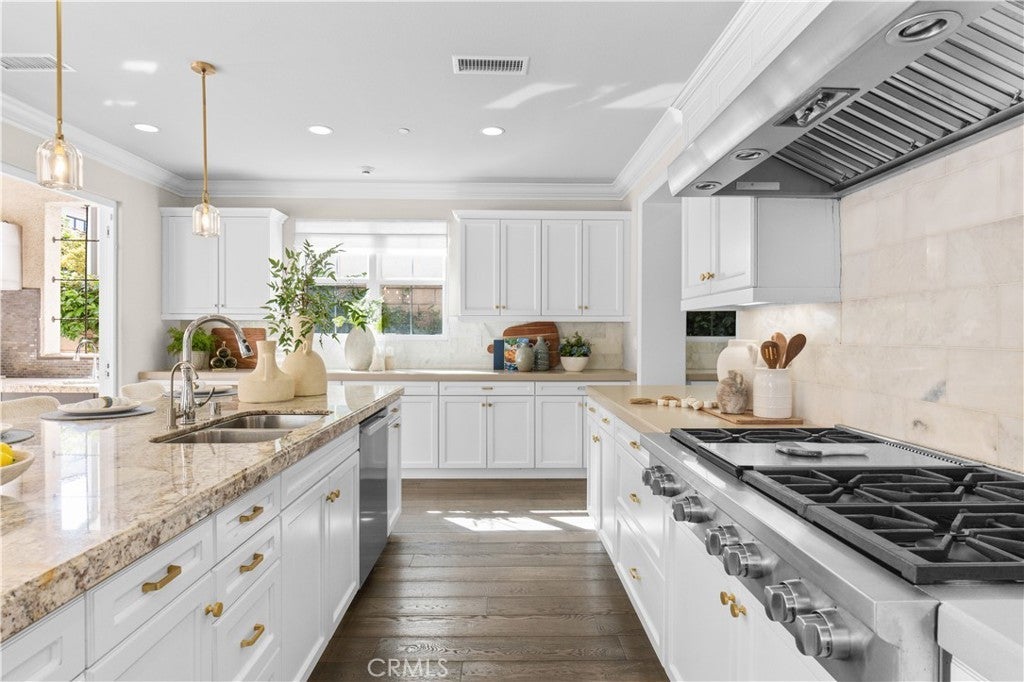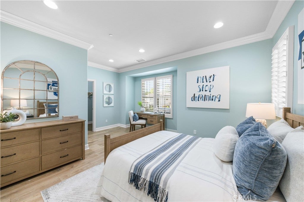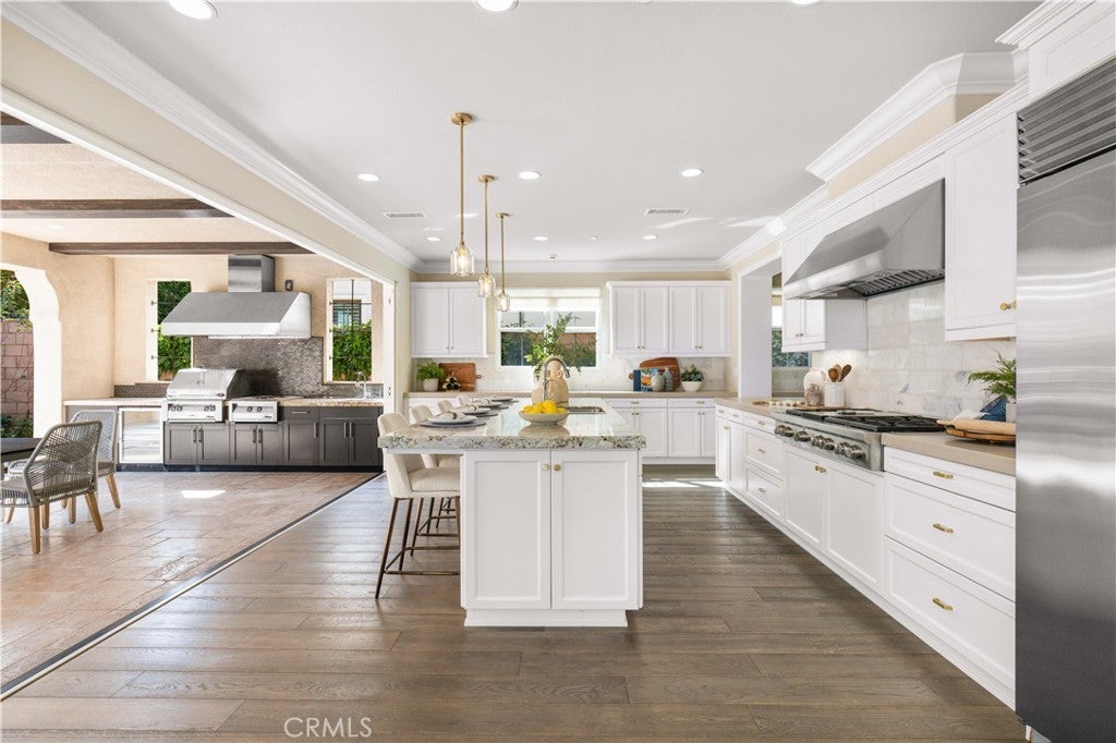Tucked away at the end of a quiet cul-de-sac in the highly sought-after Woodbury community, this exceptional home offers a combination of privacy, space, and resort-style living on a rare nearly 9,000-square-foot lot. From the moment you enter, the home makes a striking impression—a grand two-story foyer highlighted by a crystal chandelier and refined wood accents, setting a tone of understated luxury and timeless elegance. Thoughtfully designed for multi-generational living, the home features five bedrooms, including three private suites. The ground-floor suite serves as a private retreat with its own bathroom, walk-in closet, kitchenette, and a separate entrance opening to a charming stone-paved side yard, offering exceptional flexibility. At the heart of the home, light-filled living and dining spaces unfold seamlessly. The living room features an elegant coffered ceiling and large picture windows overlooking the backyard, filling the space with natural light. The chef-caliber kitchen is anchored by a substantial granite island, complemented by quartz countertops, a full marble backsplash, and built-in high-end stainless steel appliances. Fully retractable bi-fold glass doors open to a beautifully designed courtyard with a built-in outdoor kitchen, creating seamless indoor-outdoor living. Every detail has been thoughtfully considered, from the discreet mini office and walk-in pantry near the garage entry to the custom garage cabinetry, integrated workbench, and dedicated shoe storage—enhancing both function and organization. Upstairs, a versatile loft with custom media cabinetry provides an warm family gathering space, while the well-appointed laundry room offers ample storage, a sink, and built-in ironing drawers. The serene primary suite overlooks the courtyard and is bathed in natural light, featuring a spa-inspired bath with dual vanities, a soaking tub, a walk-in shower, and a customized walk-in closet. Secondary bedrooms are bright and generously sized, including a junior suite with its own lounge area. Residents enjoy Woodbury’s exceptional resort-style amenities, including recreation centers, a lagoon-style pool, and several additional swimming pools, spas, BBQ areas, tennis and basketball courts, playgrounds, and scenic walking trails. The home is within walking distance of Woodbury Elementary School, a highly regarded year-round school, as well as Woodbury Town Center—offering a refined Irvine lifestyle with convenience.