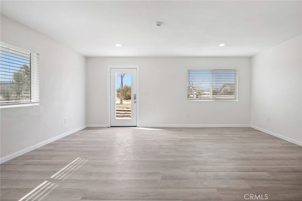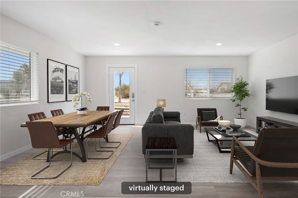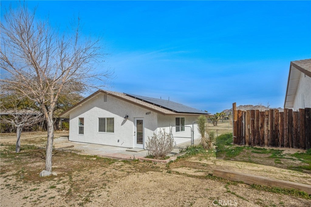 Rare opportunity to own two fully renovated homes on one expansive 1.08-acre lot, showcasing panoramic views of the Joshua Tree mountain range. This exceptional property is ideal for owner occupancy or investment, with a successfully proven short-term rental history as an Airbnb “Guest Favorite,” boasting a 4.9-star average rating and over 115 reviews. The main residence spans 2,005 sq ft and offers 4 bedrooms and 2 bathrooms, thoughtfully updated with modern finishes throughout. The newly remodeled bathrooms showcase beautiful tilework, stylish vanities, and contemporary hardware. The open-concept kitchen flows seamlessly into two distinct living areas, creating an ideal space for entertaining or relaxing. Highlights include quartz countertops, a pantry, updated recessed lighting, and newer electric appliances. The fully renovated ADU offers approximately 960 sq ft, featuring 2 bedrooms and 1 bathroom—perfect for extended family, guests, or rental income. Both units are equipped with efficient mini-split AC/heating systems for year-round comfort. Step out back to enjoy a 10-person above-ground pool, expansive deck, and spacious lot ideal for gatherings or other projects. Pull into the large circular driveway providing parking for up to 10 vehicles, with space for an RV or oversized vehicle. Additional features include solar panels for energy efficiency and a location that’s hard to beat—just 15 minutes to Joshua Tree National Park and 15 minutes to Pioneertown.