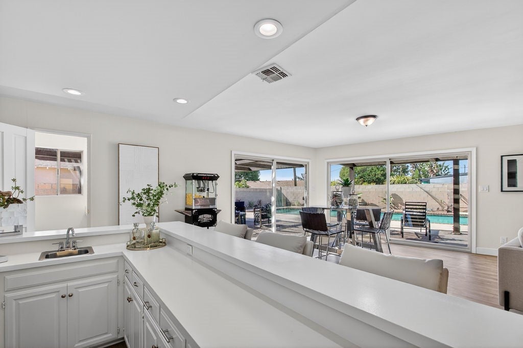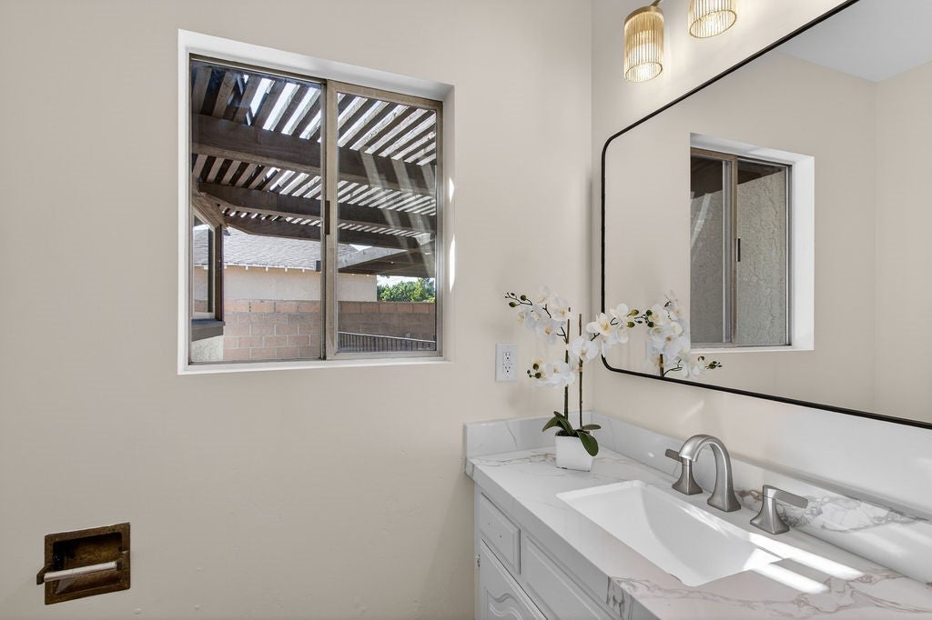 Beautifully updated 3 bedroom, 3 bathroom, single-story pool home. This property features an enormous bonus room equipped with a sink, cabinetry, and built-in seating—ideal for a home office, studio, or additional living space. Enjoy a private backyard oasis complete with a sparkling pool and spa. Recent upgrades include a new 200-amp electrical panel, recessed lighting, new flooring, fresh interior and exterior paint, and remodeled kitchen and bathrooms. Additional improvements include updated landscaping, new fencing, Ring doorbell and camera, newly replaced pool plumbing and electrical, and a newer A/C unit (approx. 2 years old). Conveniently located near major freeways, shopping, and dining.