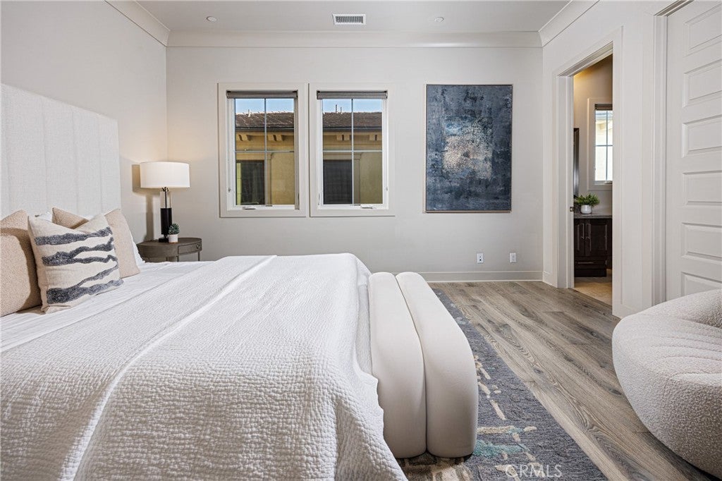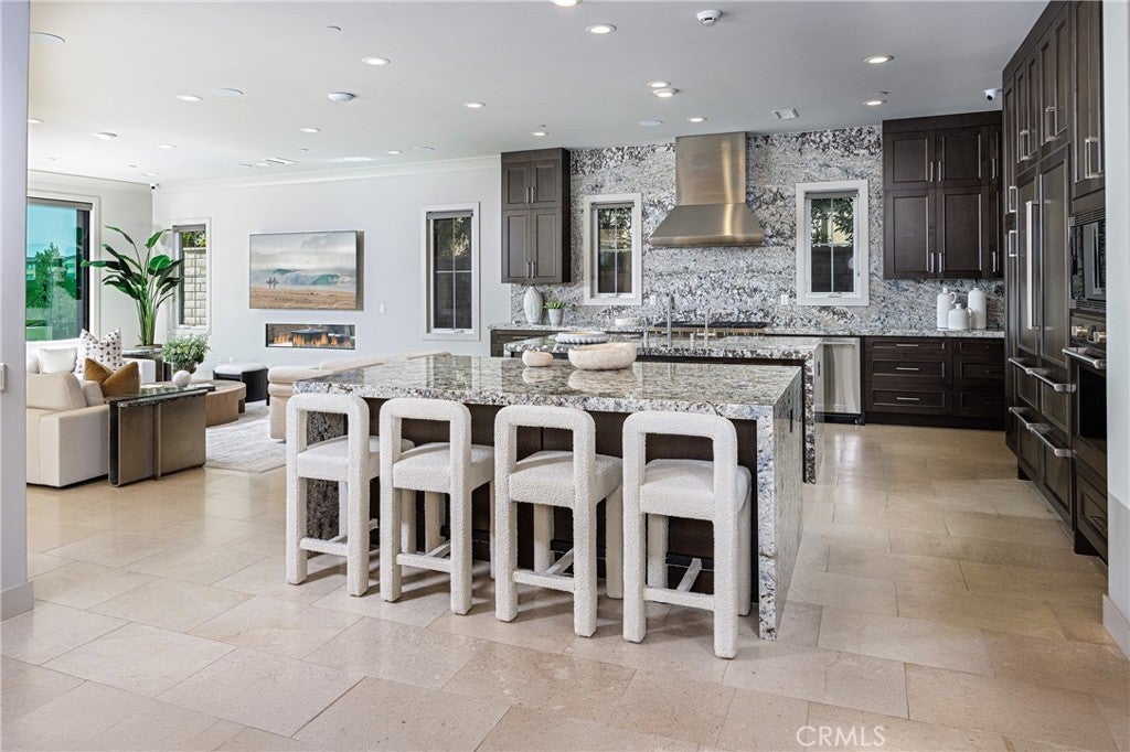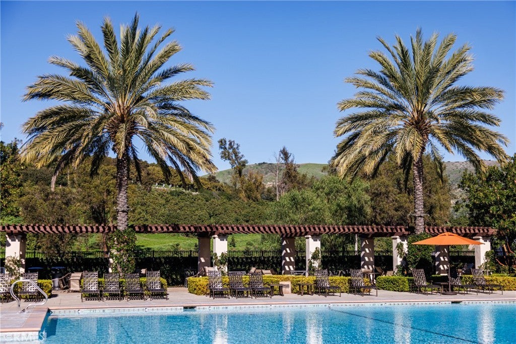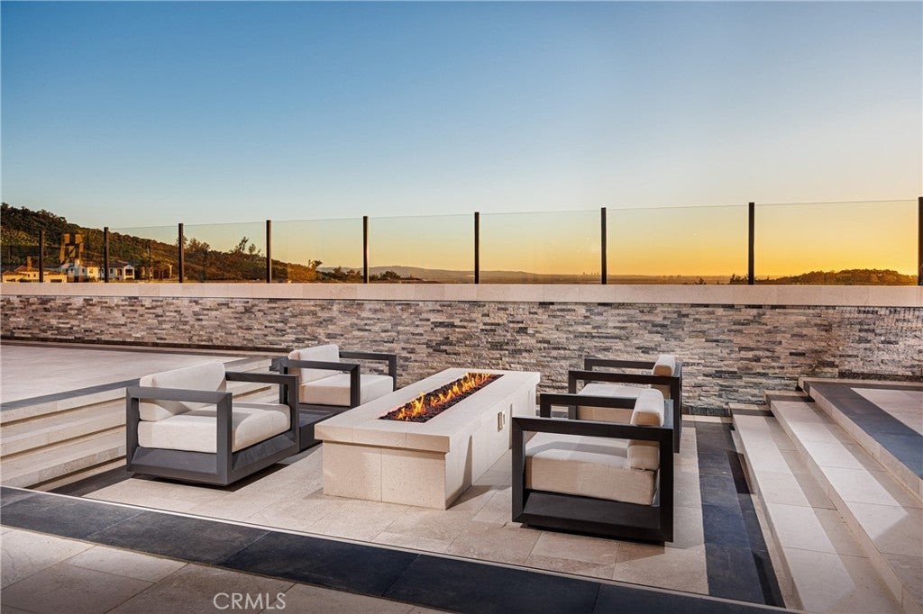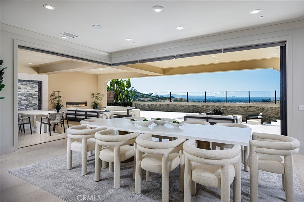 Behind the guarded gates of Orchard Hills, one of Irvine’s most prestigious communities, 170 Leafy Pass sits on the highest street in the neighborhood, pairing a premier location with several million in bespoke high end finishes. Positioned on a single loaded street with sweeping views, the home’s lot premium makes a striking impression before you step inside. Professionally designed landscaping features four mature palm trees, a tranquil water feature, curated greenery, and a custom driveway leading to two separate two car garages. A dramatic entry with 22 foot ceilings, dual staircases, and an open concept floor plan frames the views beyond. The first floor was designed for true indoor outdoor living, ideal for everyday comfort and entertaining, with floor to ceiling sliding glass doors and limestone flooring that extends into the outdoor living space, creating a seamless transition. The kitchen and prep kitchen form a professional grade culinary space with Wolf appliances, Sub Zero refrigerators, soft close cabinetry, extended counter space, and dual islands finished with Blue Galaxy granite. The formal dining area and covered patio accommodate gatherings while showcasing panoramic views across Irvine toward the ocean. The backyard features a sunken fire pit, two waterfall features including one about 70 feet in length, and ambient lighting that creates a stunning atmosphere day and night. A spacious downstairs bedroom includes an ensuite bath and custom closet. Upstairs, a loft with a wet bar and floor to ceiling sliding glass doors opens to a covered deck with some of the best views in the home, and built in surround sound with projector pre wiring allows the space to function as a theater. The primary suite occupies the right wing and includes a retreat with fireplace and a spa caliber bathroom with Calacatta Bluette marble, limestone finishes, a Thermasol steam shower, dual Rain Dome shower heads, towel warmers, a Toto Washlet bidet, and a custom walk in closet. Three additional bedrooms offer ensuite baths and custom closets, while the fifth bedroom is currently configured as an office with hillside views. The home is equipped with a 22kW owned solar system with four Tesla Powerwalls, Crestron whole home lighting, Ubiquiti WiFi and security cameras, surround sound, and motorized blinds, all controllable from your phone. Residents enjoy Orchard Hills amenities, top tier schools, and proximity to shopping, dining, and entertainment.
