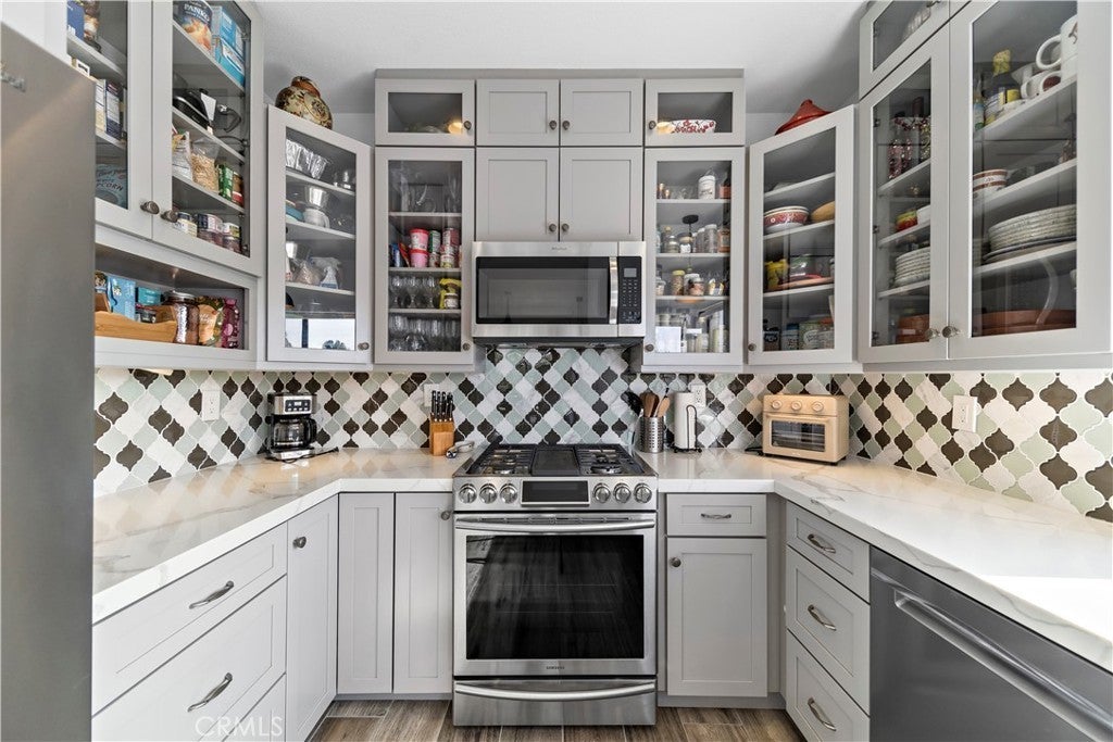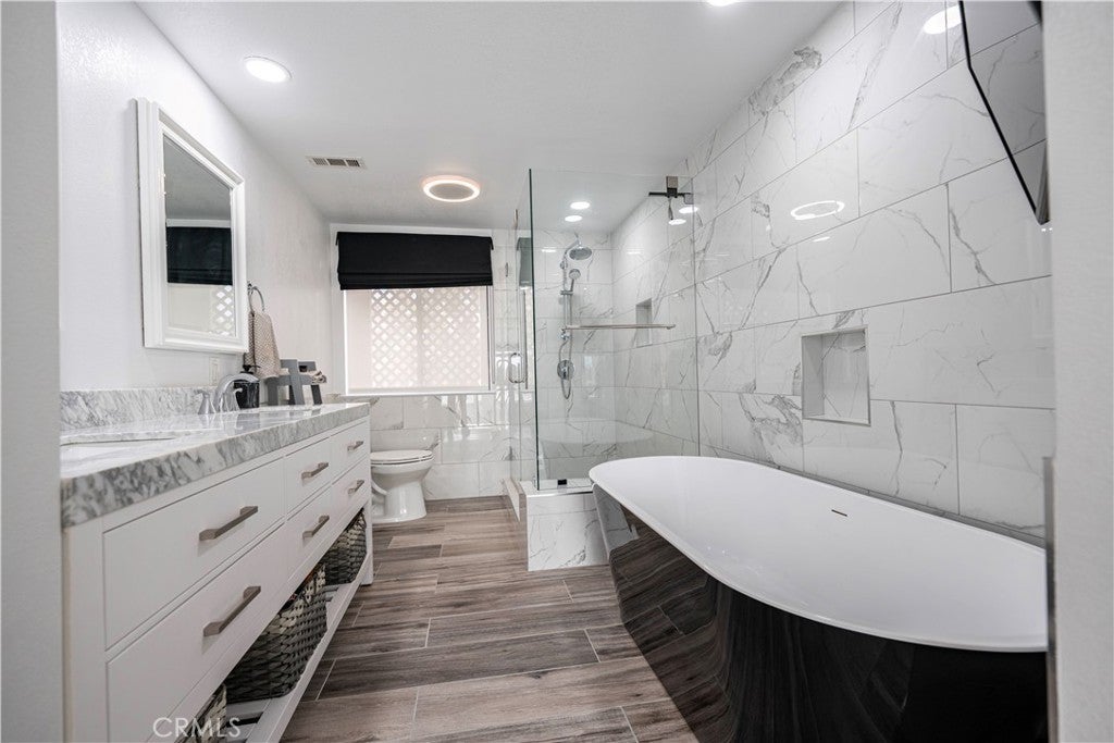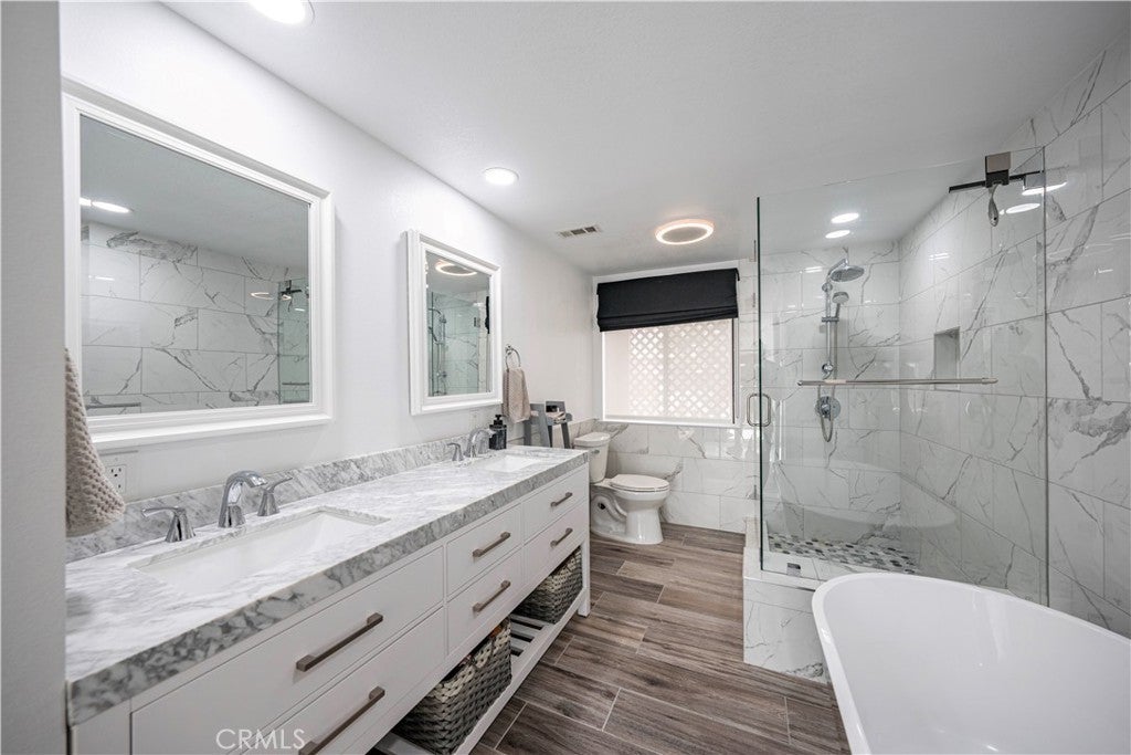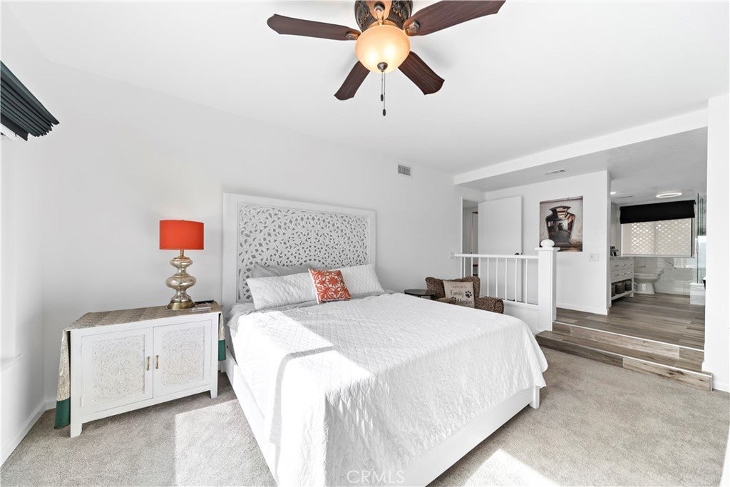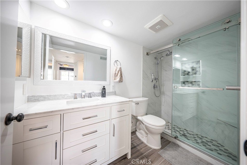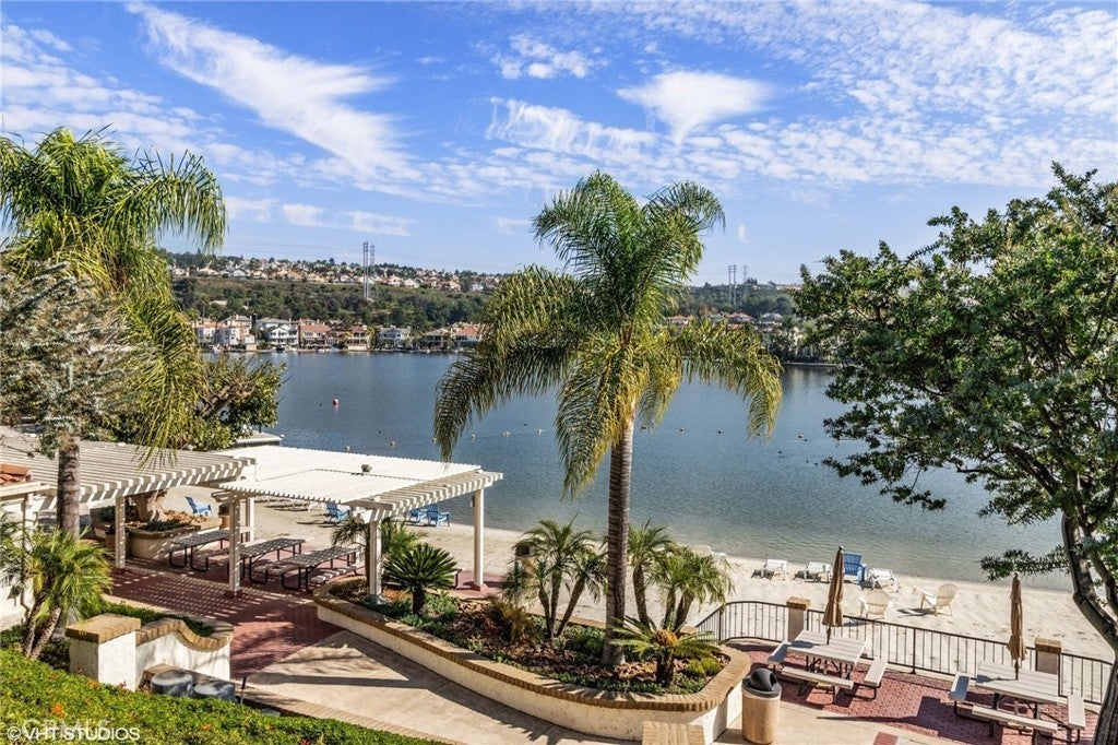 SIMPLY PUT, THIS IS THE NICEST MALLORCA CONTESSA PLAN TO EVER COME ON THE MARKET.... Proximity to the lower pool/spa, being next to an access to the Lakefront, the ease in visiting Plaza Del Lago without being so close that noise is a factor and the value of having no neighboring building directly to the south of you are all wonderful features. Add-on being one street off the lakefront, looking down on the greenbelt pathway affording you an unobstructed view of a portion of the Mallorca Promenade, the Bulkhead and boats docked on the lake, coupled with the lack of any third story homes on either side of the walkway and it is no wonder that this is one of the very best views in Mallorca. Not only is the Lake staring you in the face, your view is enhanced by visions of East Beach and the Oak Preserve. Don't overlook the angle the home rests on. Facing South East, that rear balcony gets sunshine all day long, making this one of the best naturally lighted homes in the tract. There is so much sunshine, 3 retractable awnings have been added to create an option between sun and shade; warm and cool. That angle helps capture the gentile afternoon breeze that travels south to north. At the same time, that positioning protects from the elements brought by the Santa Ana Winds that blow north to south. But what makes this home most unique is what has been done to the kitchen and to the primary bath. Widening the kitchen doorway from the original 32 inches to an impressive 54 inches, and raising the entire ceiling and access by 2 feet creates quite the impression. The wine cooler and the quartz counter atop it supplements the illusion of expansion by making the entry appear to be a stunning 70 inches wide. Under cabinet lighting, 3 lazy Susan's, quartz counters, elegant cabinetry with glass doors, soft close features on the doors and drawers with dovetail joint construction, both pendant and recessed can lighting, pewter knobs and handles, stainless steel appliances including the refrigerator, dishwasher, microwave and the oven/stove with its 4 burners and a 5th burner griddle feature all come together to make this kitchen one that anyone would be proud of. And the view. People will argue over who gets to do the dishes in that barn style sink. The best feature of the home is probably the primary bath. Modified to allow for a large walk-in shower AND luxurious soaking tub with wall mounted TV, the double sinks and the tiled walls will take anyone a moment to comprehend.