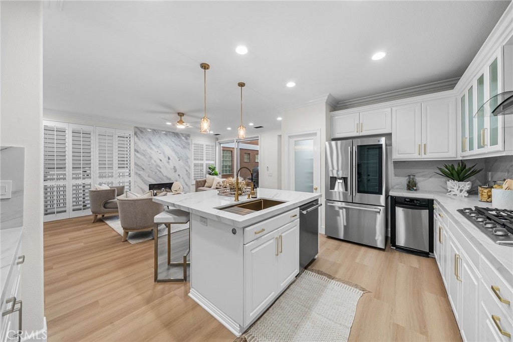 Embrace elevated coastal living in this fully remodeled Downtown Huntington Beach residence, spanning nearly 3,100 square feet and ideally located moments from the beach, pier, and lively Main Street. Thoughtfully designed for both elegance and everyday functionality, this spacious home offers 3 bedrooms plus a versatile bonus room (easily converted to a 4th bedroom), 3.5 baths, and a modern open-concept layout perfect for entertaining and comfortable living. The welcoming main level showcases expansive living and dining spaces anchored by floor-to-ceiling stone fireplaces and enhanced with rich, designer-curated finishes throughout. The chef-inspired kitchen that is open to the family room is a true showpiece, complete with premium stainless steel appliances, a convenient pot filler above the range, sleek quartz countertops, a large walk-in pantry and a generous center island with seating perfect for gathering. Step outside to the center courtyard, featuring a beautiful fountain and a built-in BBQ center, creating an ideal space for outdoor entertaining. Upstairs, the luxurious primary suite offers a serene retreat with its own fireplace, private balcony, and a spa-like bathroom featuring dual sinks, a soaking tub, and a walk-in shower. Two additional bedrooms and a spacious bonus room provide ample flexibility for guests, a home office, or media space. The third level features an impressive rooftop deck with a view of the ocean, the perfect spot to enjoy sunsets and sea breezes. Additional highlights include a main-level powder room, custom lighting, luxury flooring throughout, new dual pane windows, central AC and an attached two-car garage with direct access. Blending contemporary design with the relaxed charm of beachside living, this home offers the ultimate Huntington Beach lifestyle, just blocks from world-class shopping, dining, and the iconic coastline. Seller is open to lease option to buy.