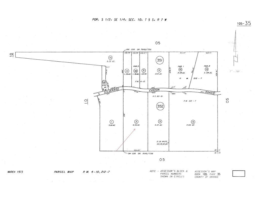 Rare opportunity to own approximately 6 acres (261,360 sq ft) of prime land in the scenic heart of Silverado Canyon. Located directly across from Silverado Creek along paved Silverado Canyon Road, this expansive parcel offers beautiful mature trees, natural terrain, and picturesque canyon and creek views. Situated in an unincorporated area of Orange County, the property is zoned Agricultural Rural and falls within the Silverado Modjeska Specific Plan, which outlines development standards and building requirements designed to preserve the canyon’s rural character. This zoning and plan designation allow for a variety of potential uses, including the development of a custom single-family residence, subject to County approval. With a minimum 4-acre requirement for certain residential and agricultural uses, this 6-acre parcel exceeds the size threshold, offering flexibility for a private estate, equestrian facilities, hobby farm, or additional structures. The property backs to Cleveland National Forest, providing exceptional privacy, open space, and direct access to miles of hiking and nature. A truly unique setting that combines rural tranquility with accessibility. Large, agriculturally zoned parcels of this size in Orange County are rarely available. A remarkable opportunity to create your custom canyon retreat.