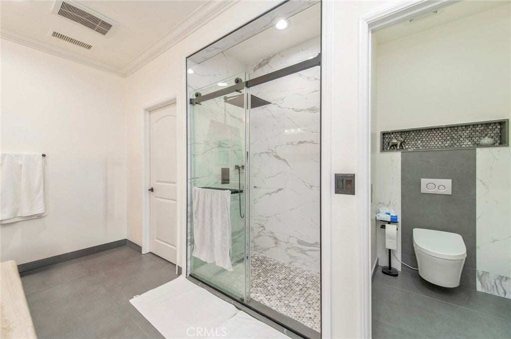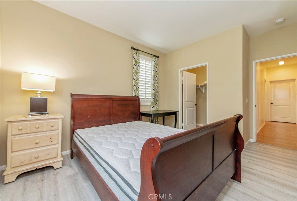 Welcome to 579 Boxwood Lane, a spacious and thoughtfully designed 5-bedroom residence located in the highly sought after Rosedale community of Azusa, offering scenic hillside views and resort style amenities. This well maintained home features an ideal layout with two bedrooms on the main level and three additional bedrooms upstairs, providing flexibility for multi generational living, guests, or a dedicated home office setup. Upon entry, warm wood flooring, recessed lighting, and elegant archways create a welcoming atmosphere. The open concept kitchen is designed for both daily living and entertaining, showcasing an oversized granite island with bar seating, extensive cabinetry, stainless steel appliances, gas cooktop with professional hood, built in microwave, and a spacious pantry. The kitchen flows seamlessly into the dining area, where sliding glass doors open to a private backyard. The backyard offers a covered patio structure, generous concrete hardscape, and a lawn area ideal for outdoor dining, relaxation, or gatherings. The elevated positioning allows for pleasant neighborhood and hillside views. Upstairs, a large loft provides additional living space and is perfectly suited as a media room, game room, or secondary family area. The primary suite serves as a true retreat, featuring dual vanities, a centrally positioned soaking tub, and a beautifully upgraded walk-in shower with marble inspired finishes and frameless glass enclosure. Select bathrooms include modern smart toilet upgrades for added comfort. Additional highlights include epoxy finished garage flooring, ample storage space, and a practical floor plan that balances openness with privacy. As part of the Rosedale master planned community, residents enjoy access to resort style pools, spa, clubhouse, fitness center, parks, and scenic walking trails, all conveniently located near Metro access, major freeways, and shopping.